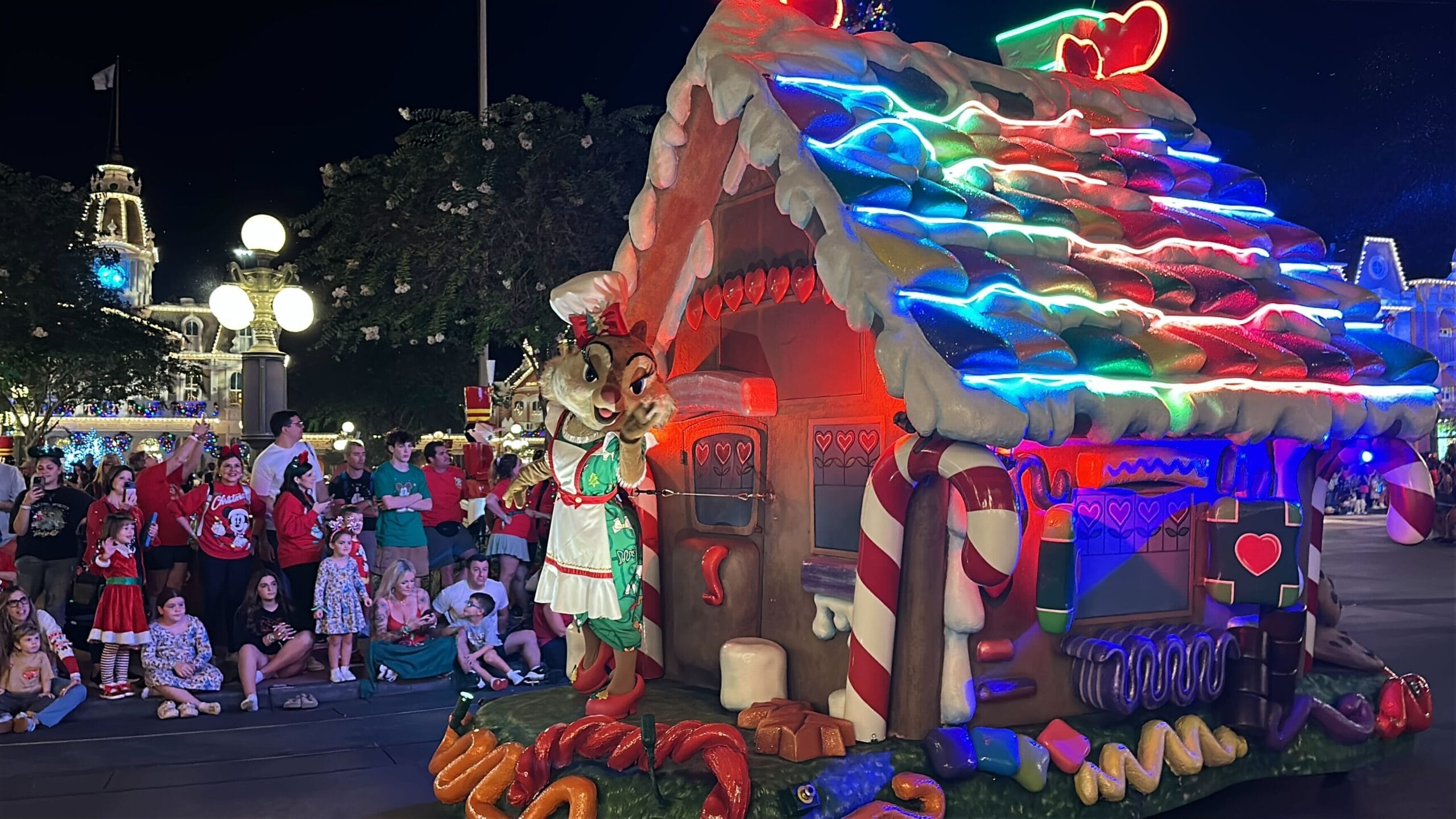 Clarice the chipmunk is on her colorful gingerbread house float.