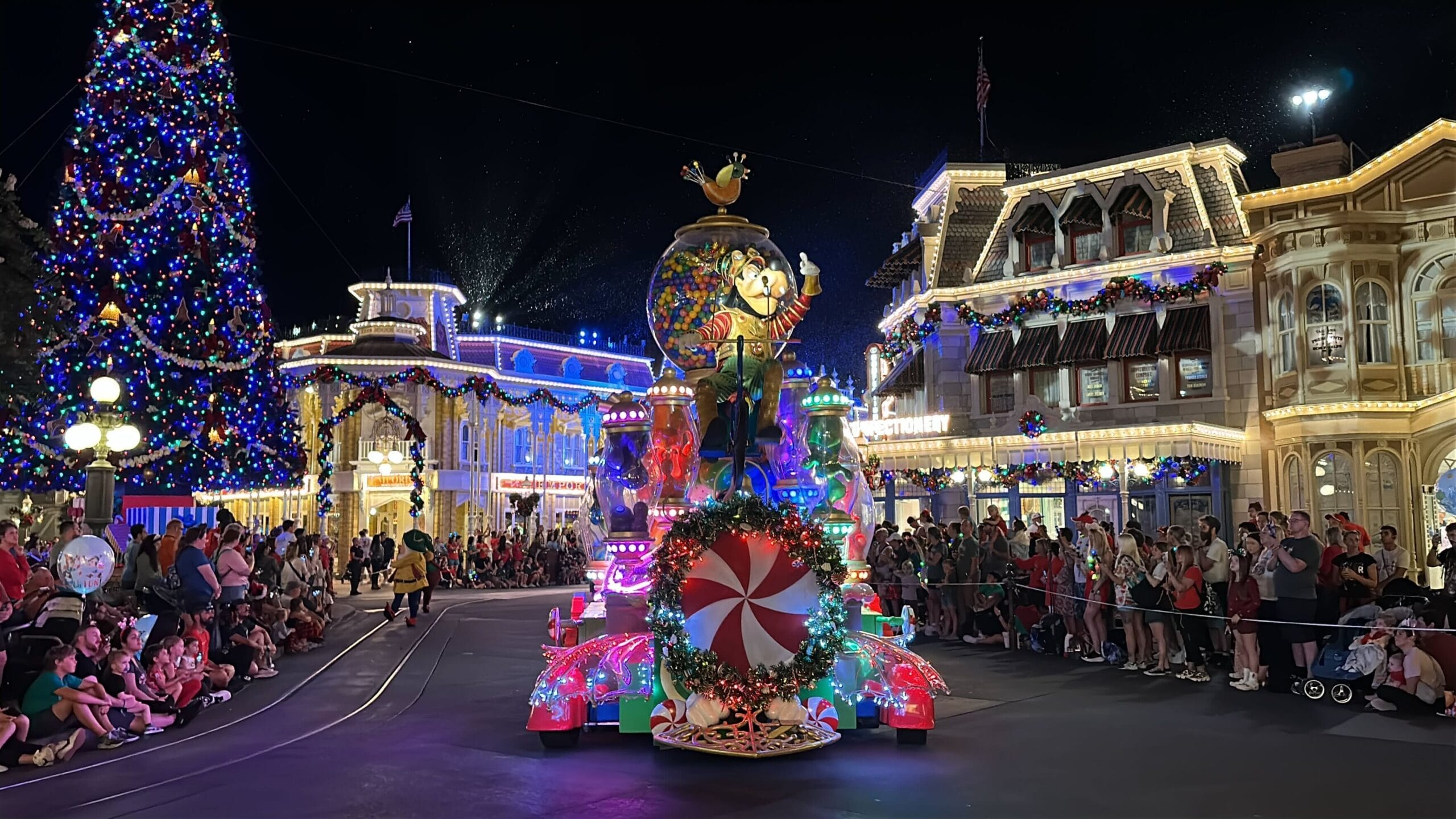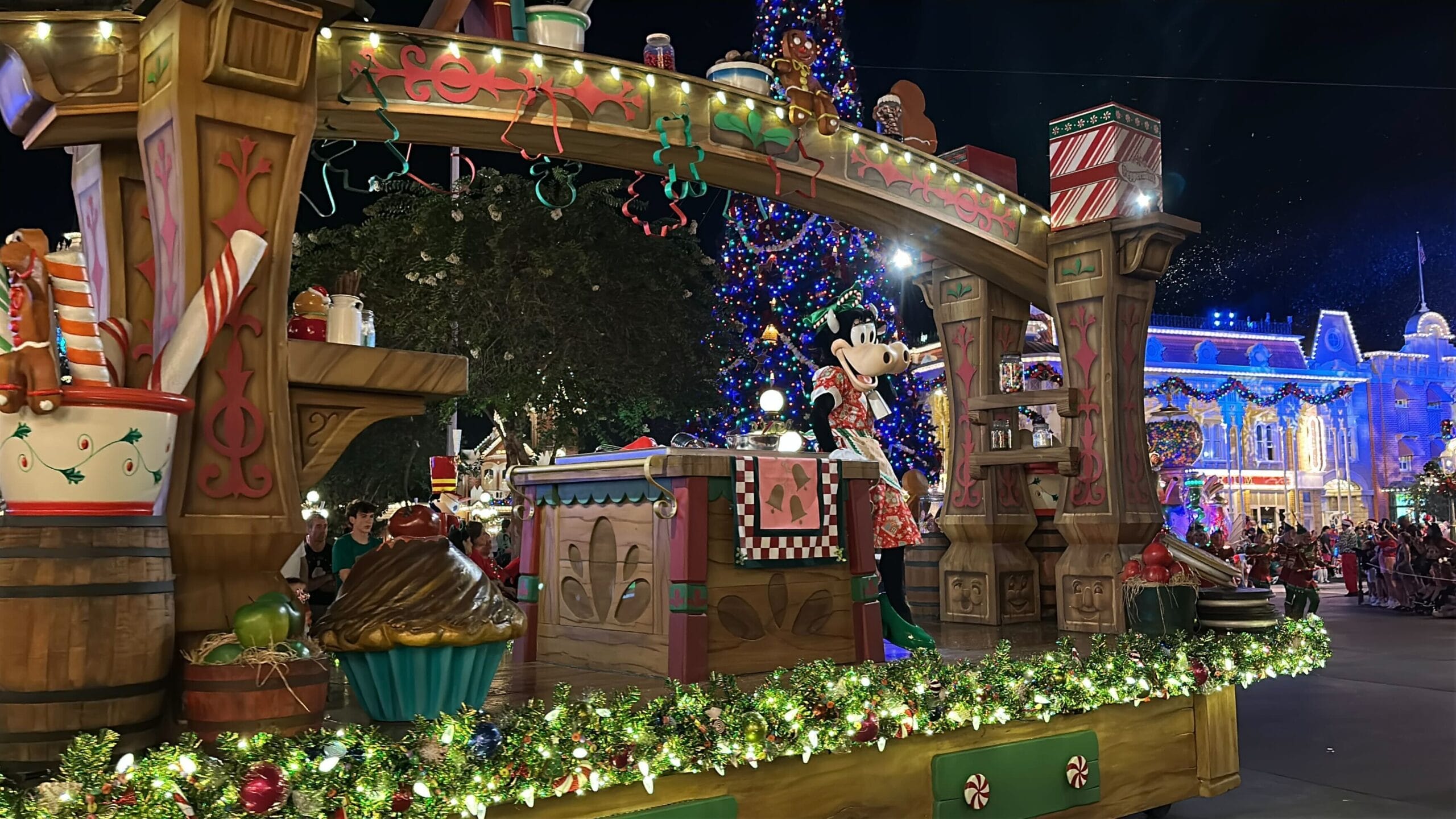 Goofy’s candy machine float is decorated with wreaths and Goofy wears a holiday outfit.