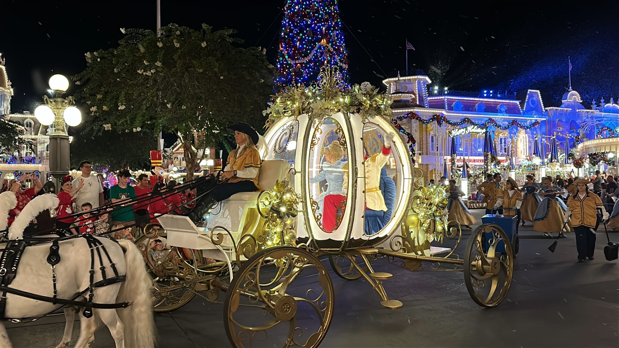 Cinderella and Prince Charming in their carriage pulled by ponies is a staple of the holiday parade.
