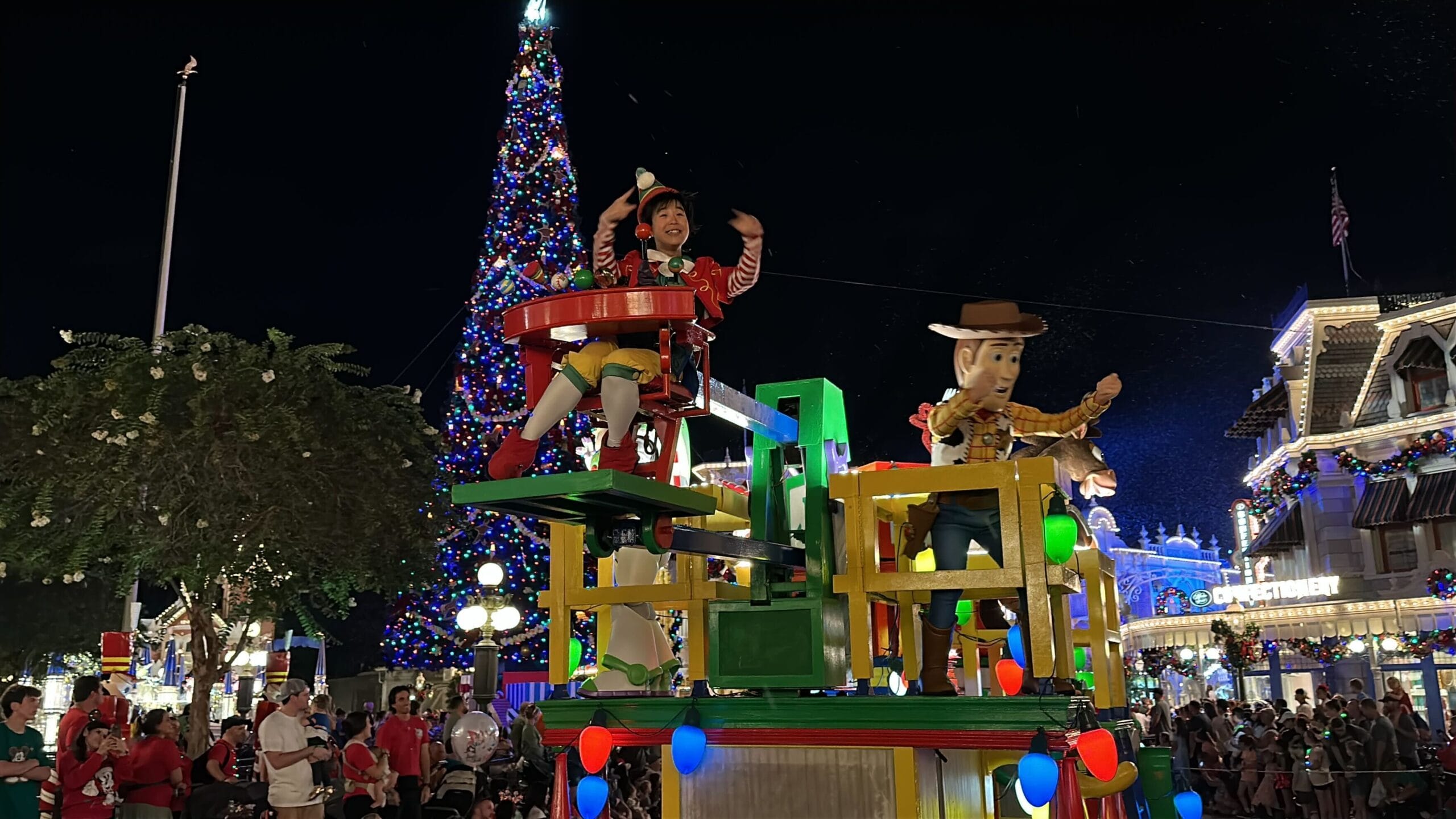 Elves ride a float with Toy Story pals and the famous toy soldiers march after.