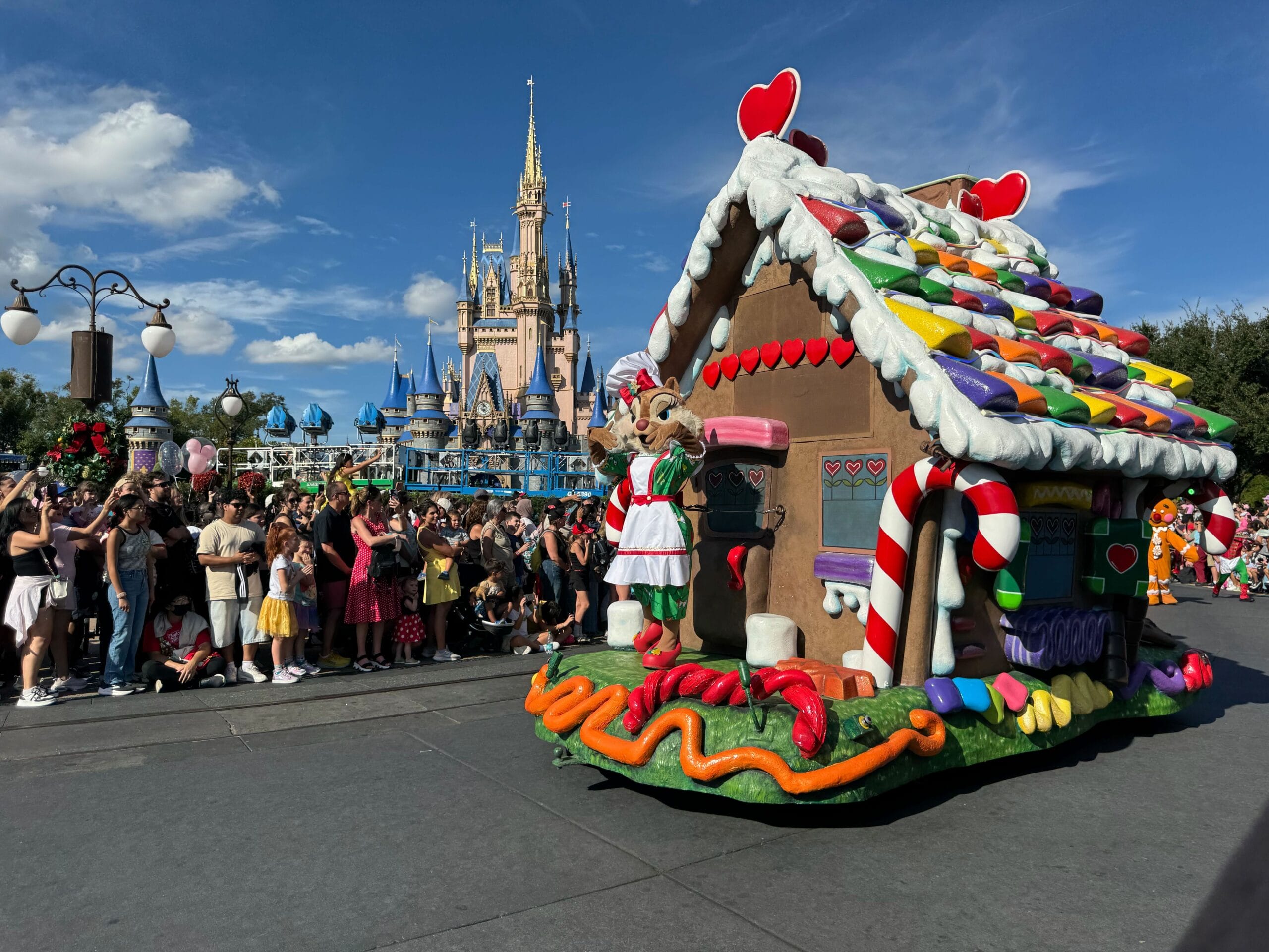 Clarice the chipmunk is on her colorful gingerbread house float.