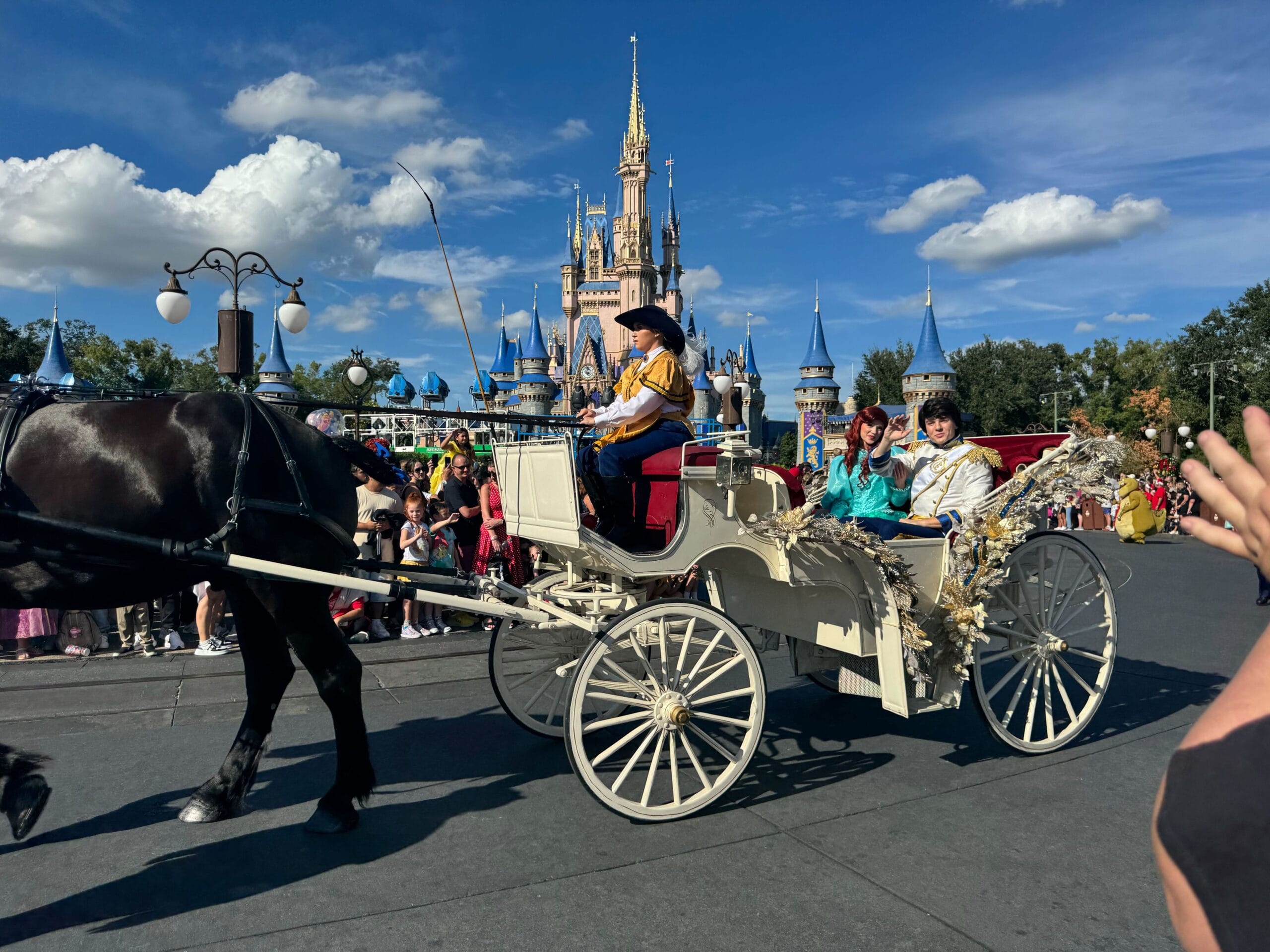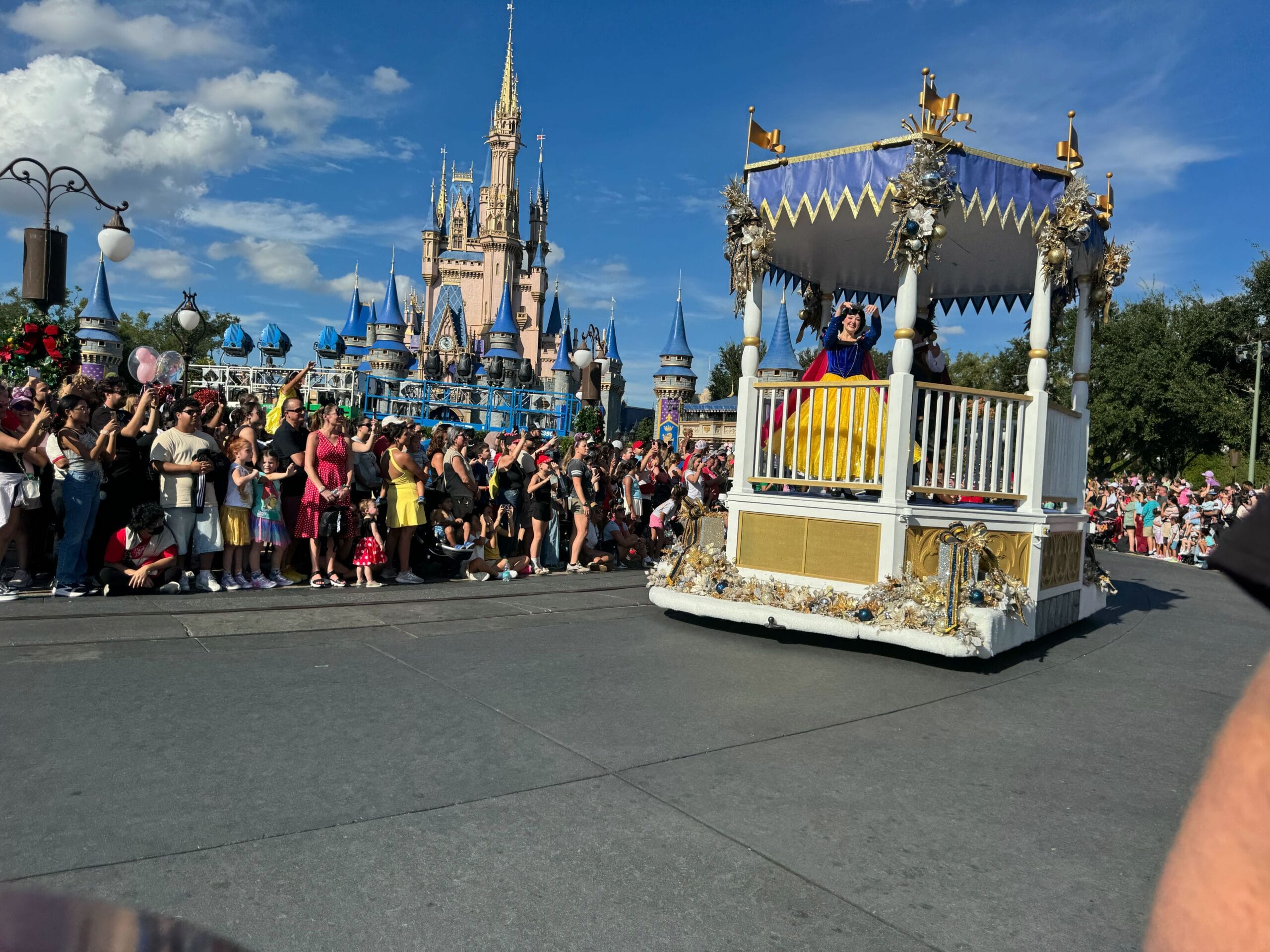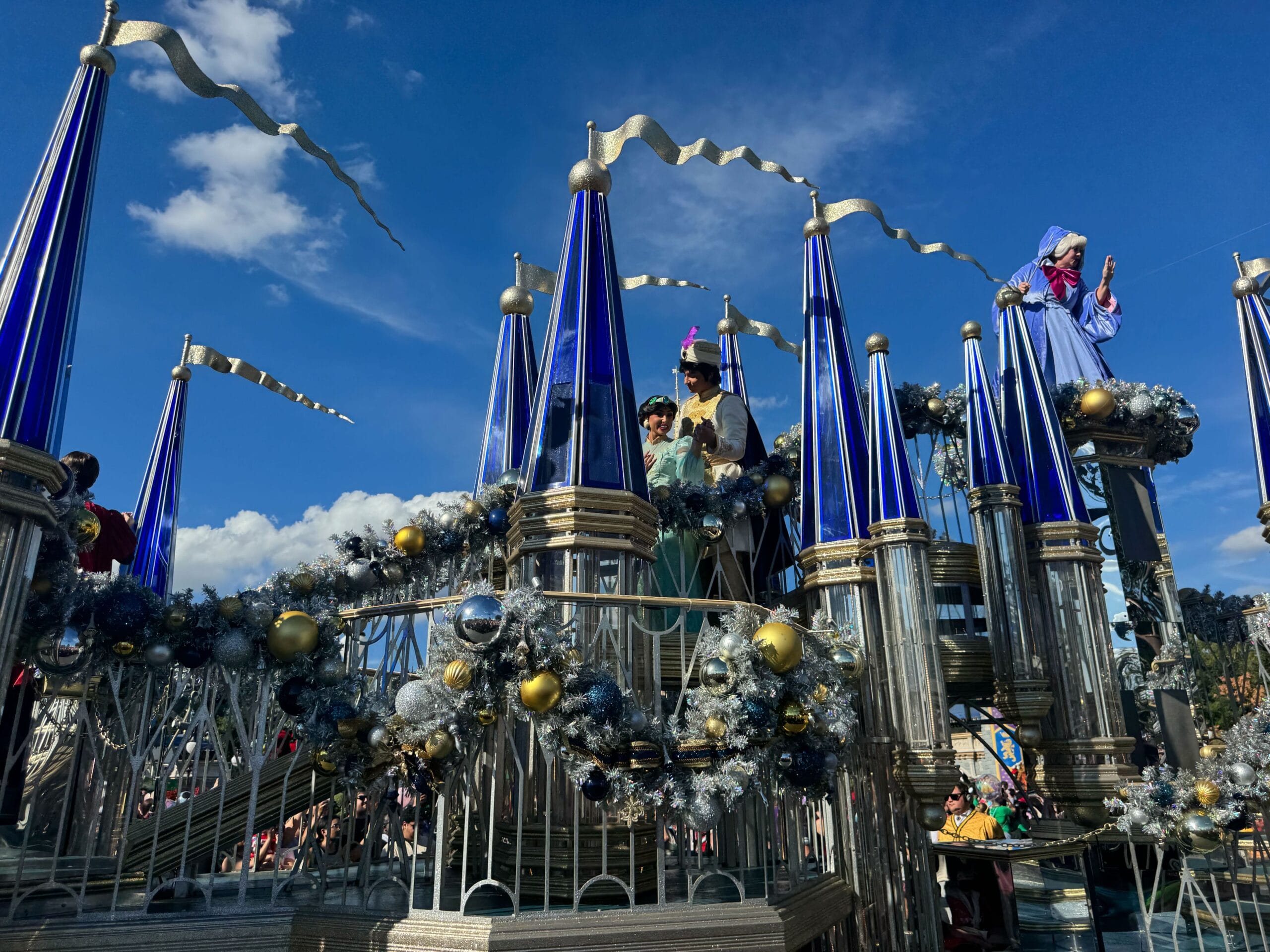 Also on the float are Jasmine, Aladdin, and The Fairy Godmother.