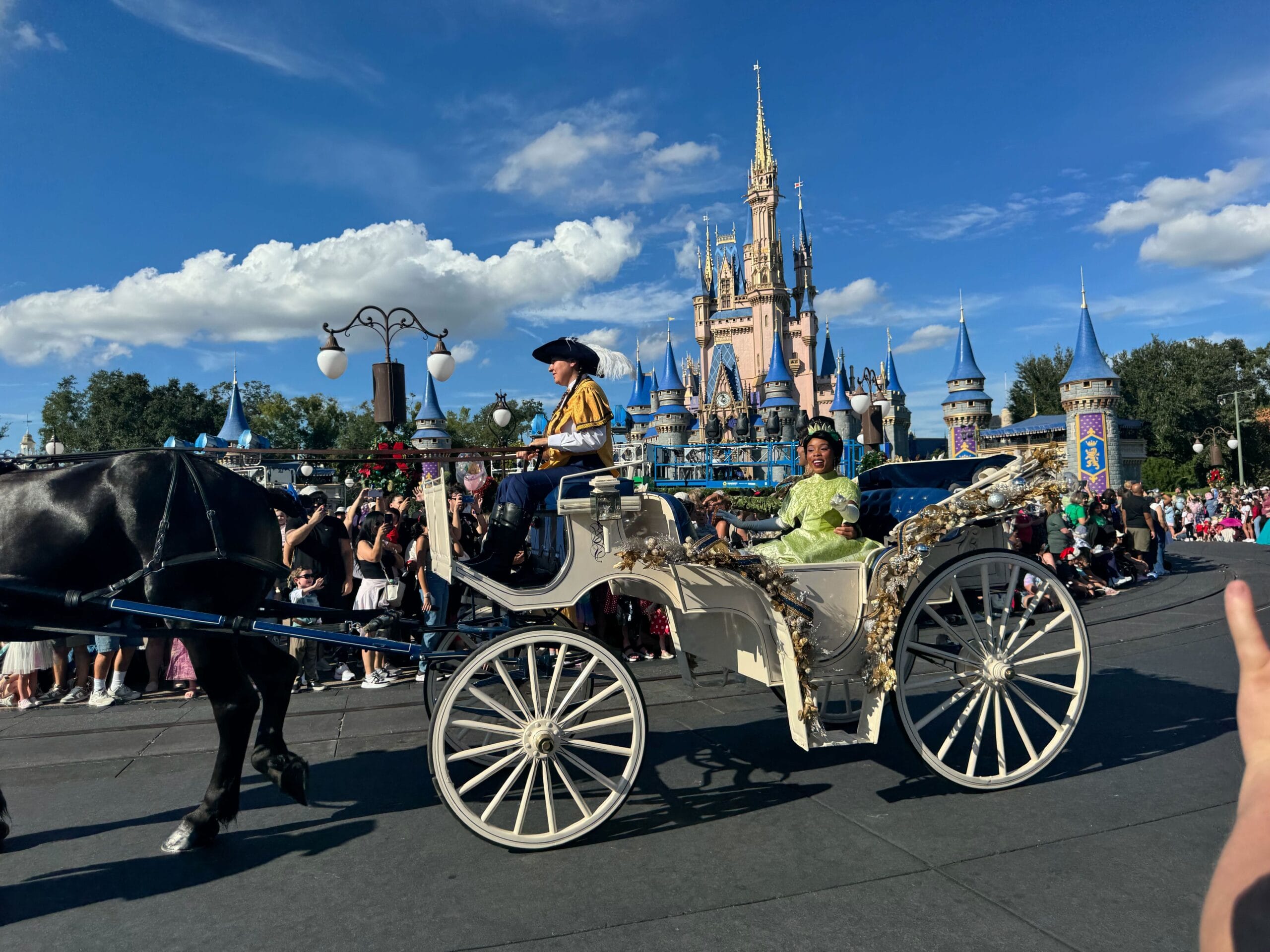 Princess Tiana and Prince Naveen are up next in a white carriage, decorated with garland.