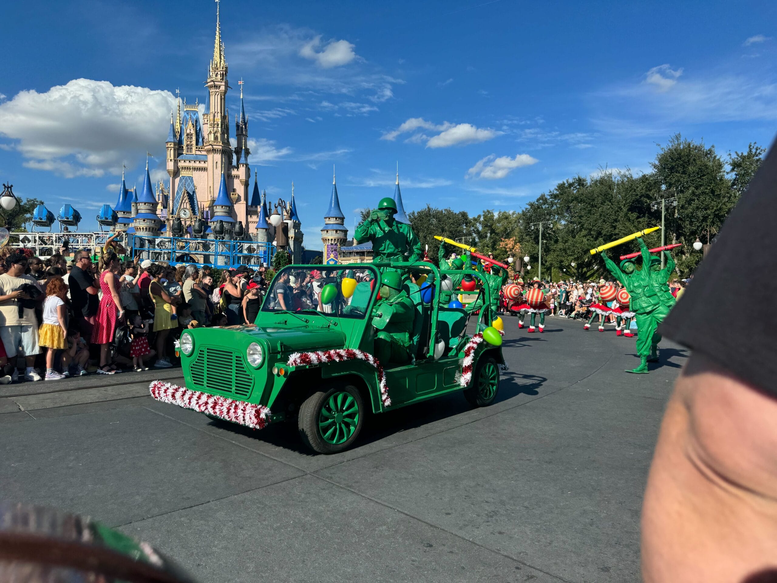 The Green Army men drive a jeep decorated in oversized Christmas lights and red and white garland wrapped around the front.