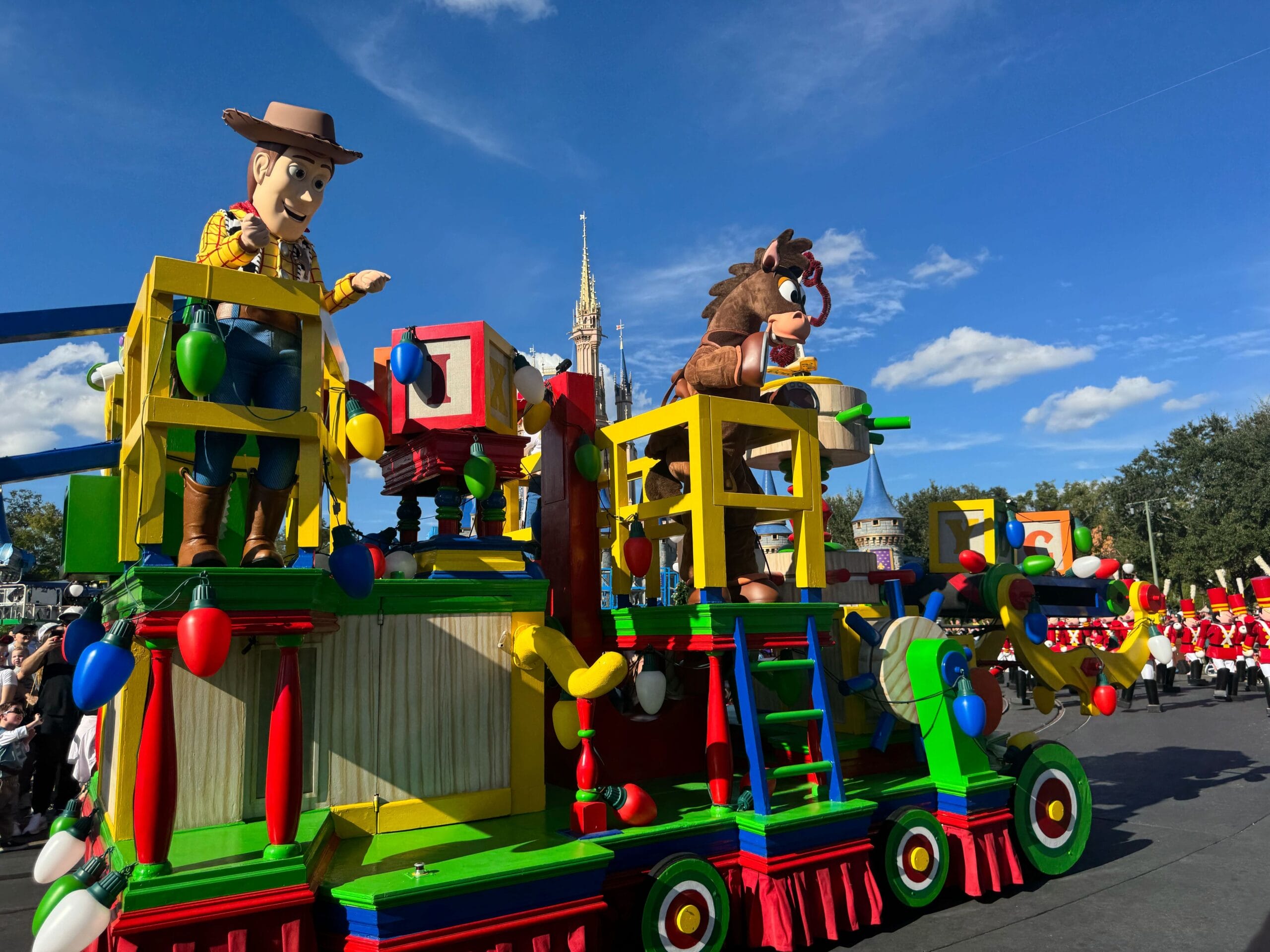 Woody and Bullseye ride on a float also decorated with oversized Christmas lights.