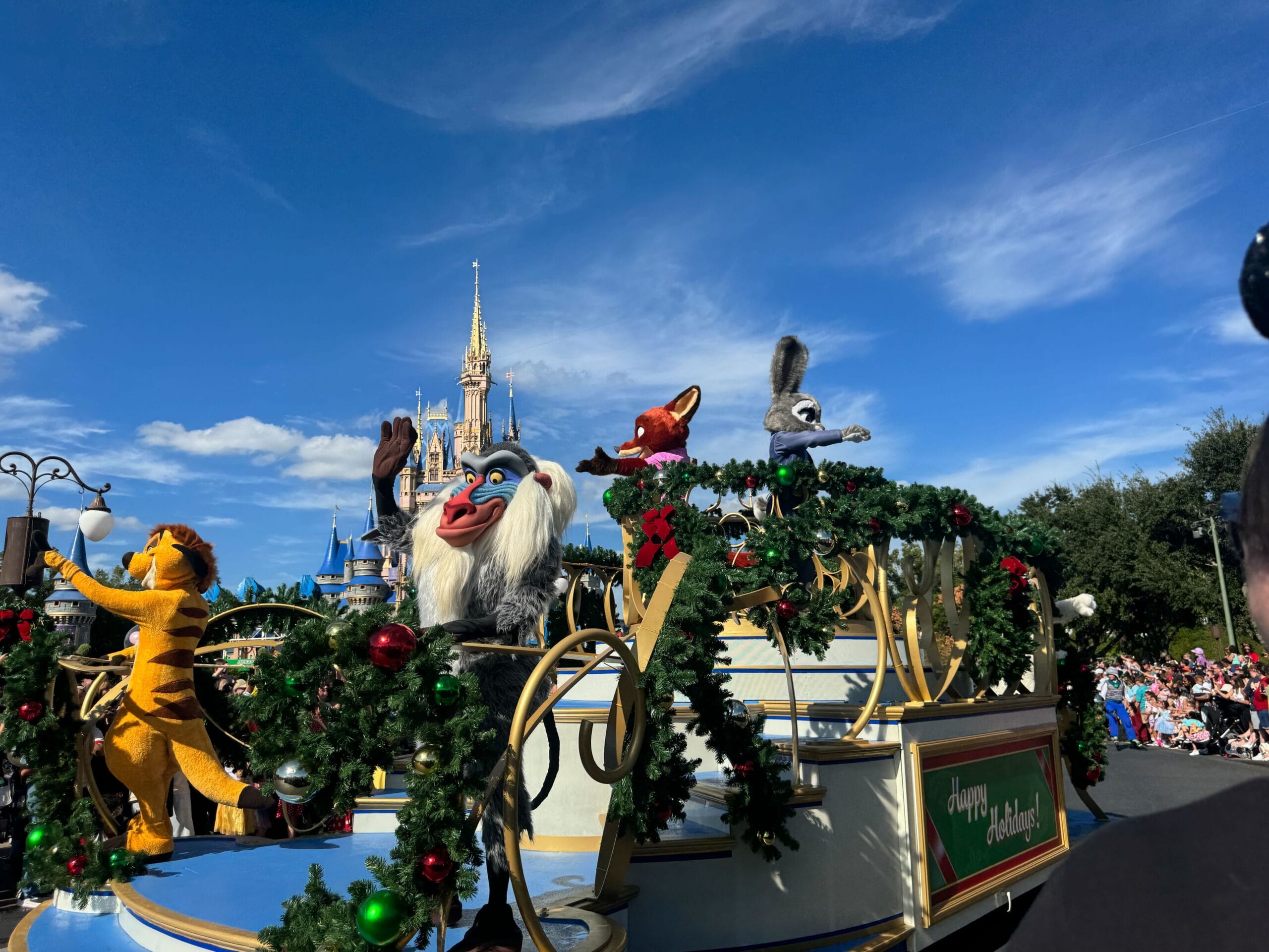Riding on a float that reads “Happy Holidays” are Timon and Rafiki from The Lion King, and Nick Wilde and Judy Hopps from Zootopia.
