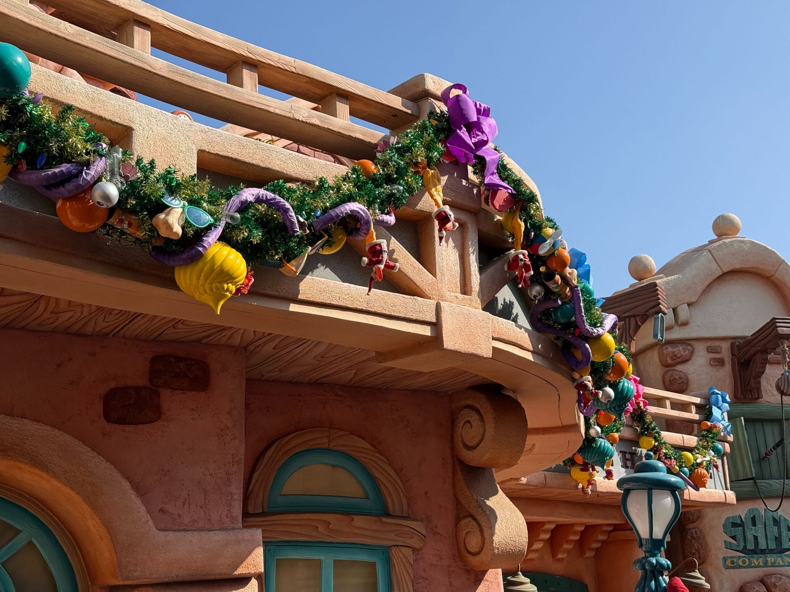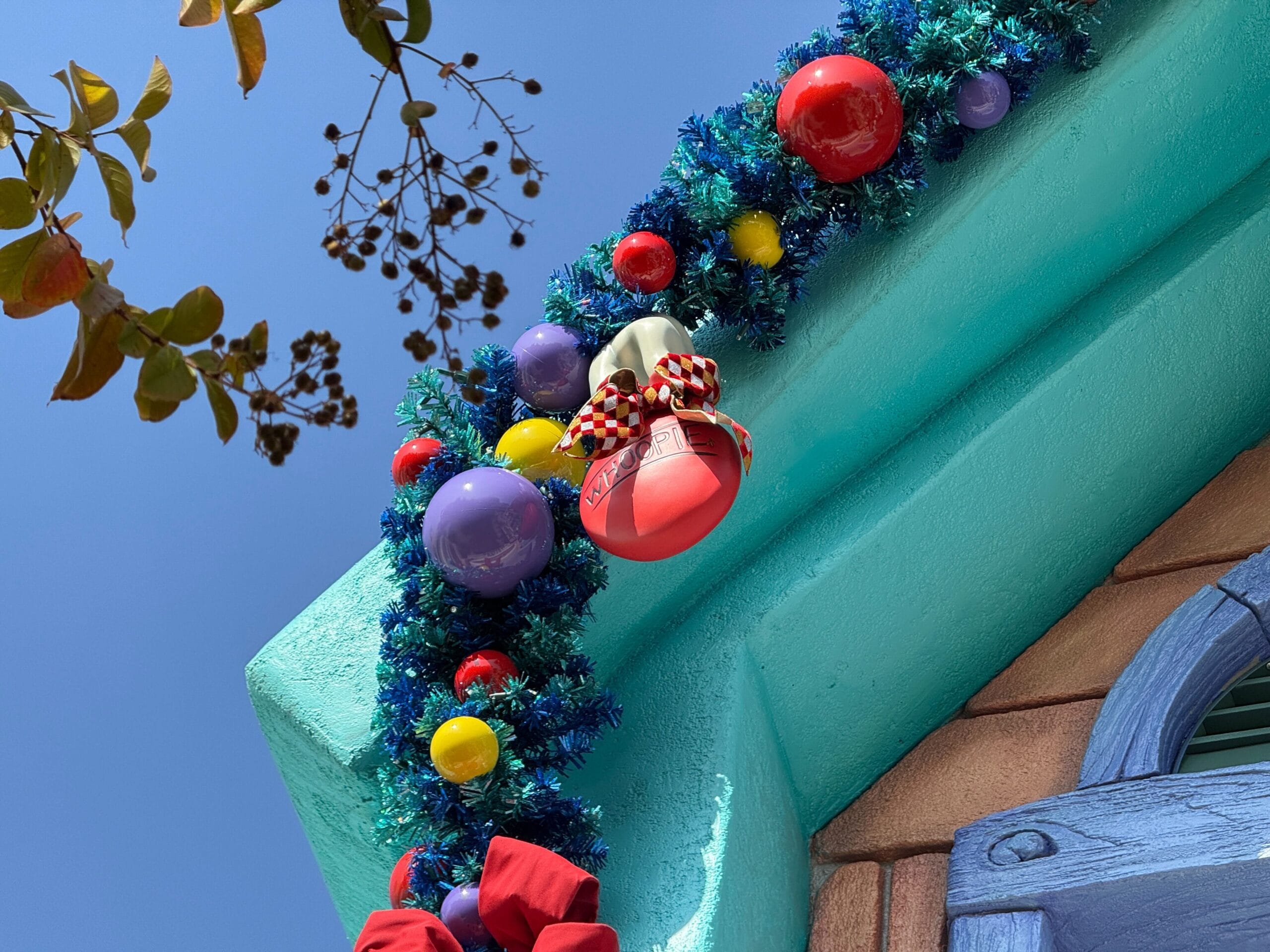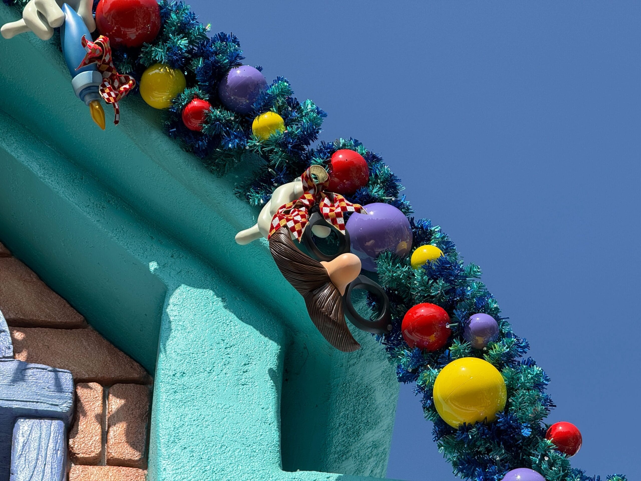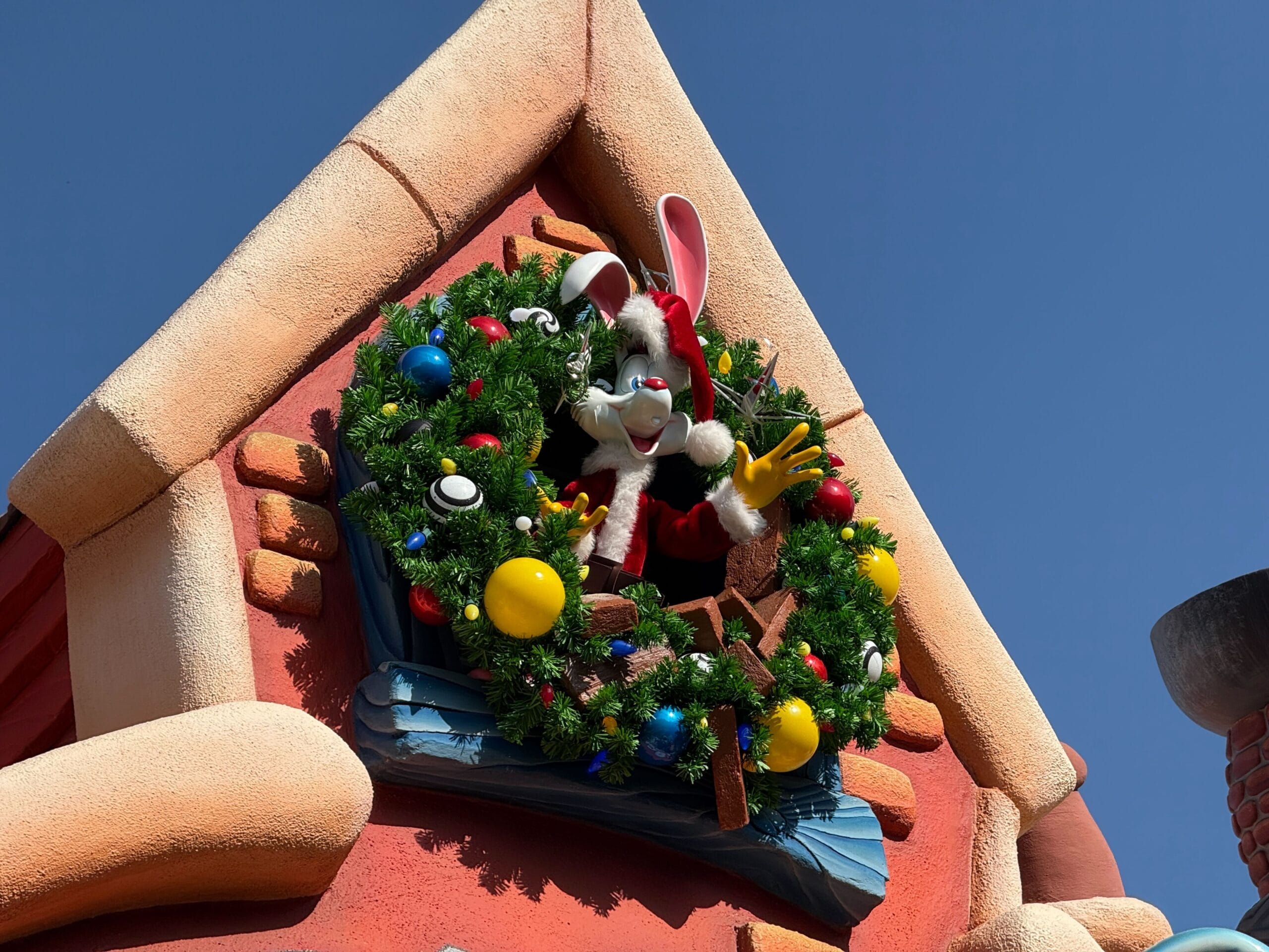 Garland full of colorful ornaments and stars hangs across the facade of Roger Rabbit’s Car Toon Spin.