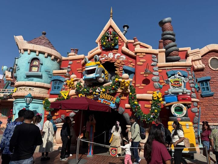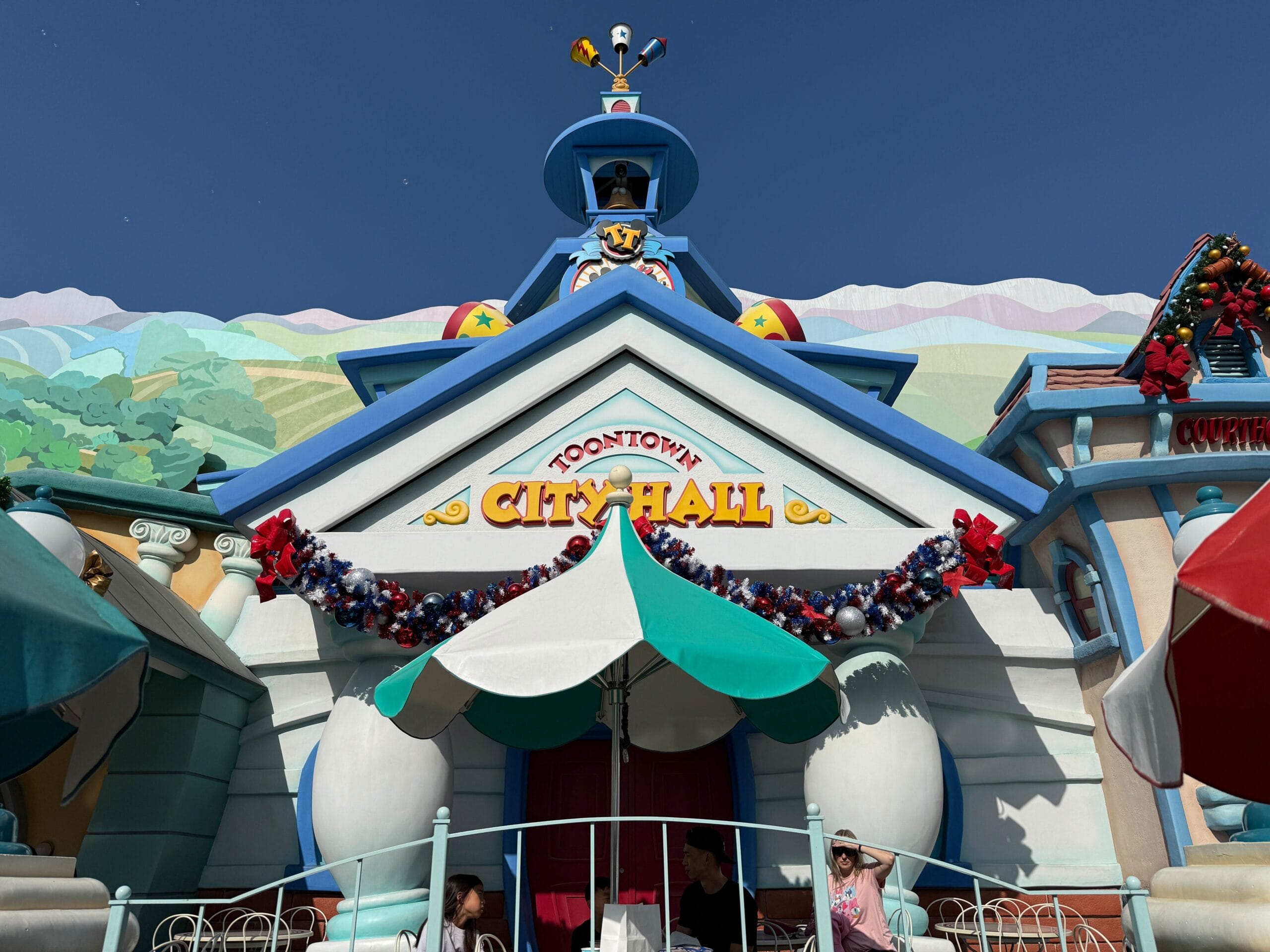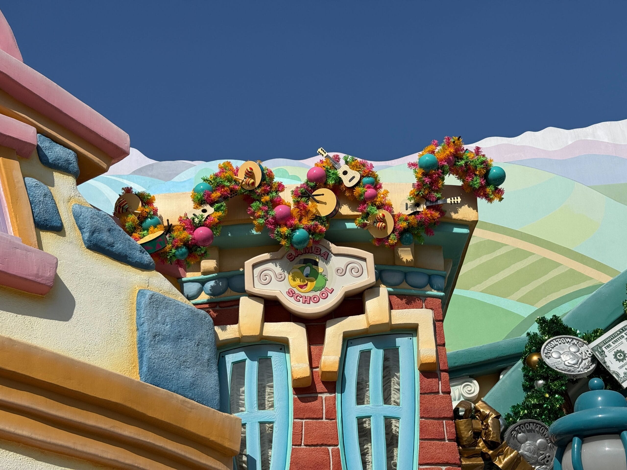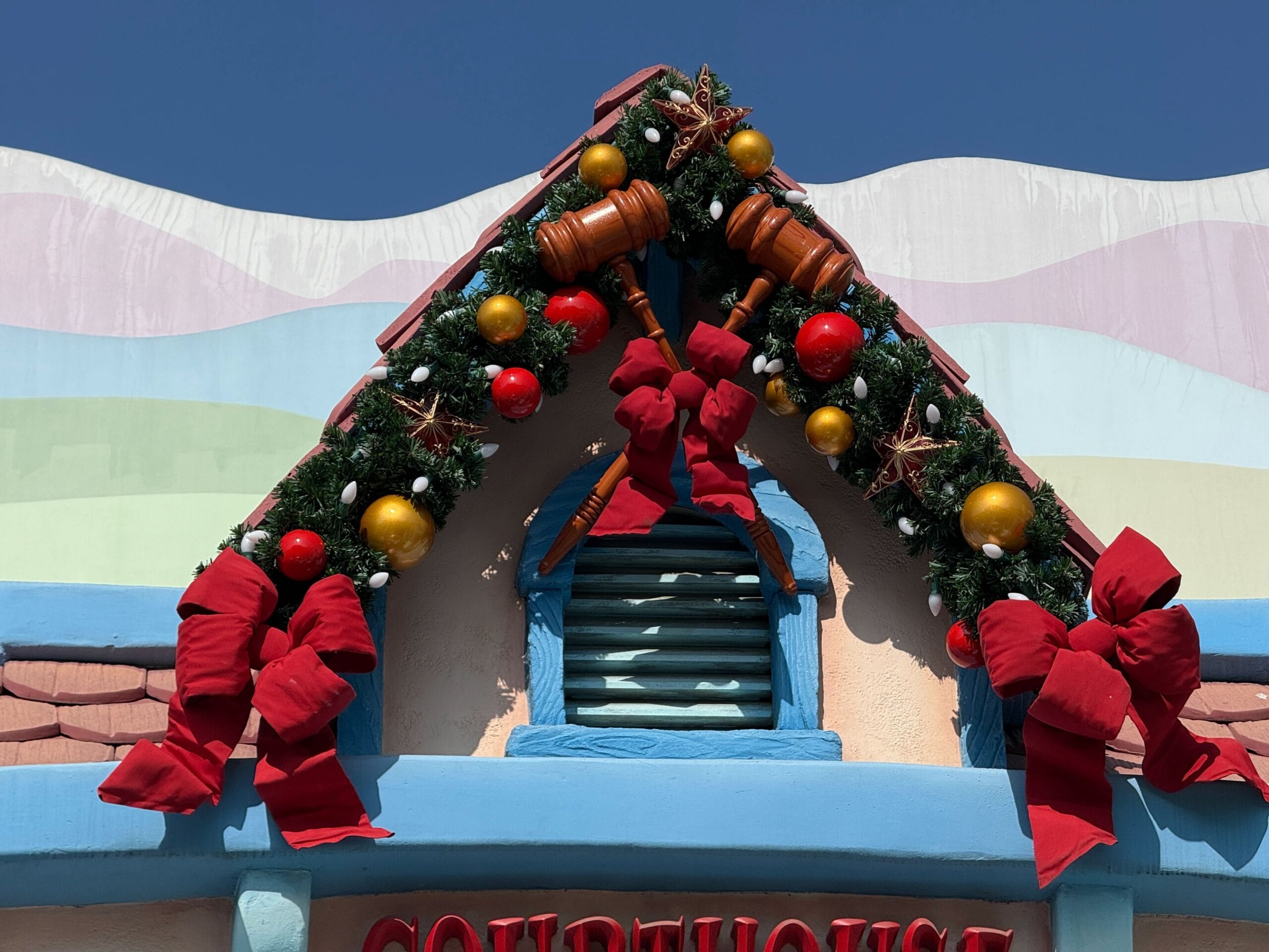 Garland full of colorful ornaments and stars hangs across the facade of Roger Rabbit’s Car Toon Spin.