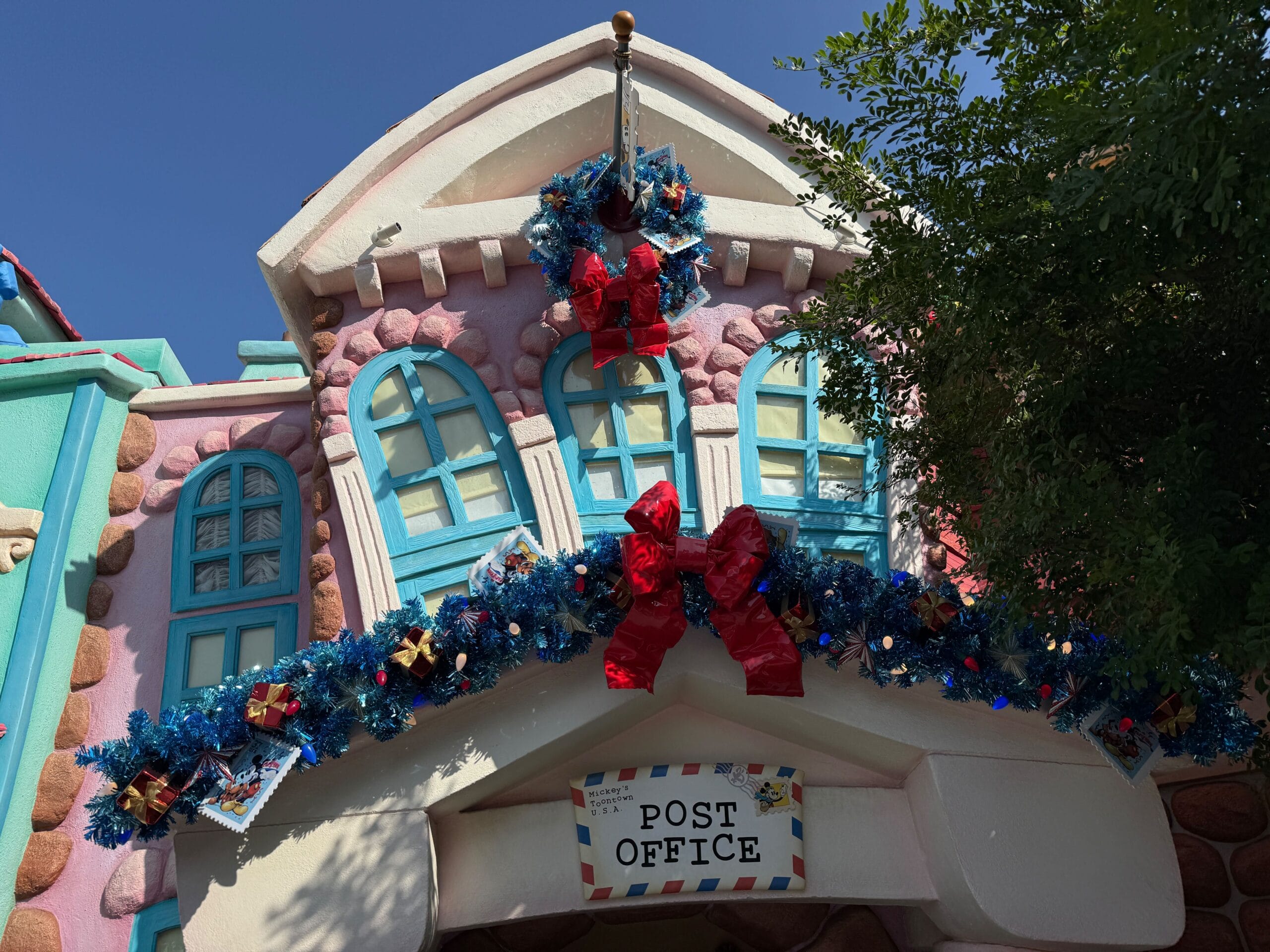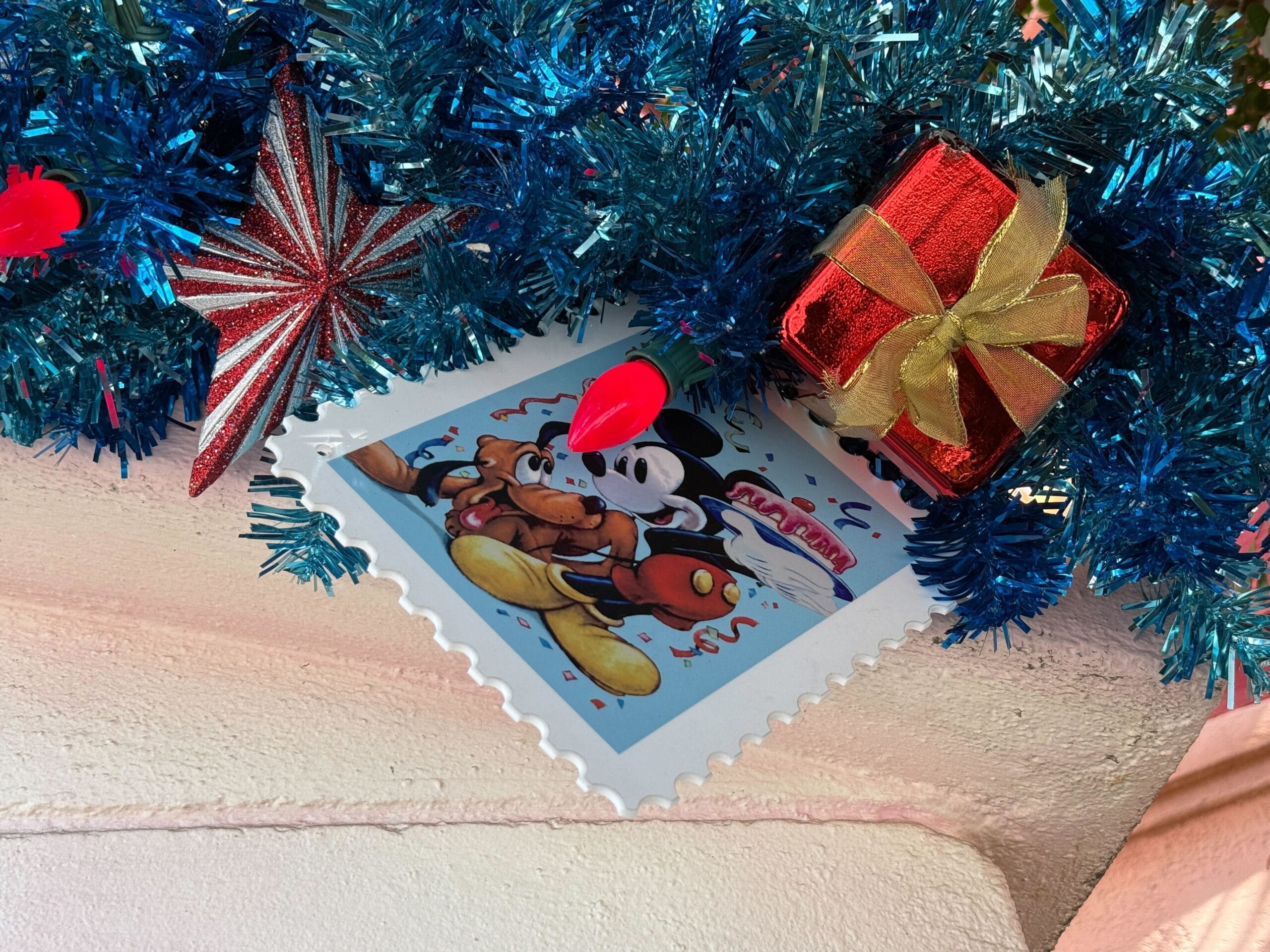 The Post Office decor is refreshed with classical 90s art of Mickey and Pluto interwoven in the blue garland.