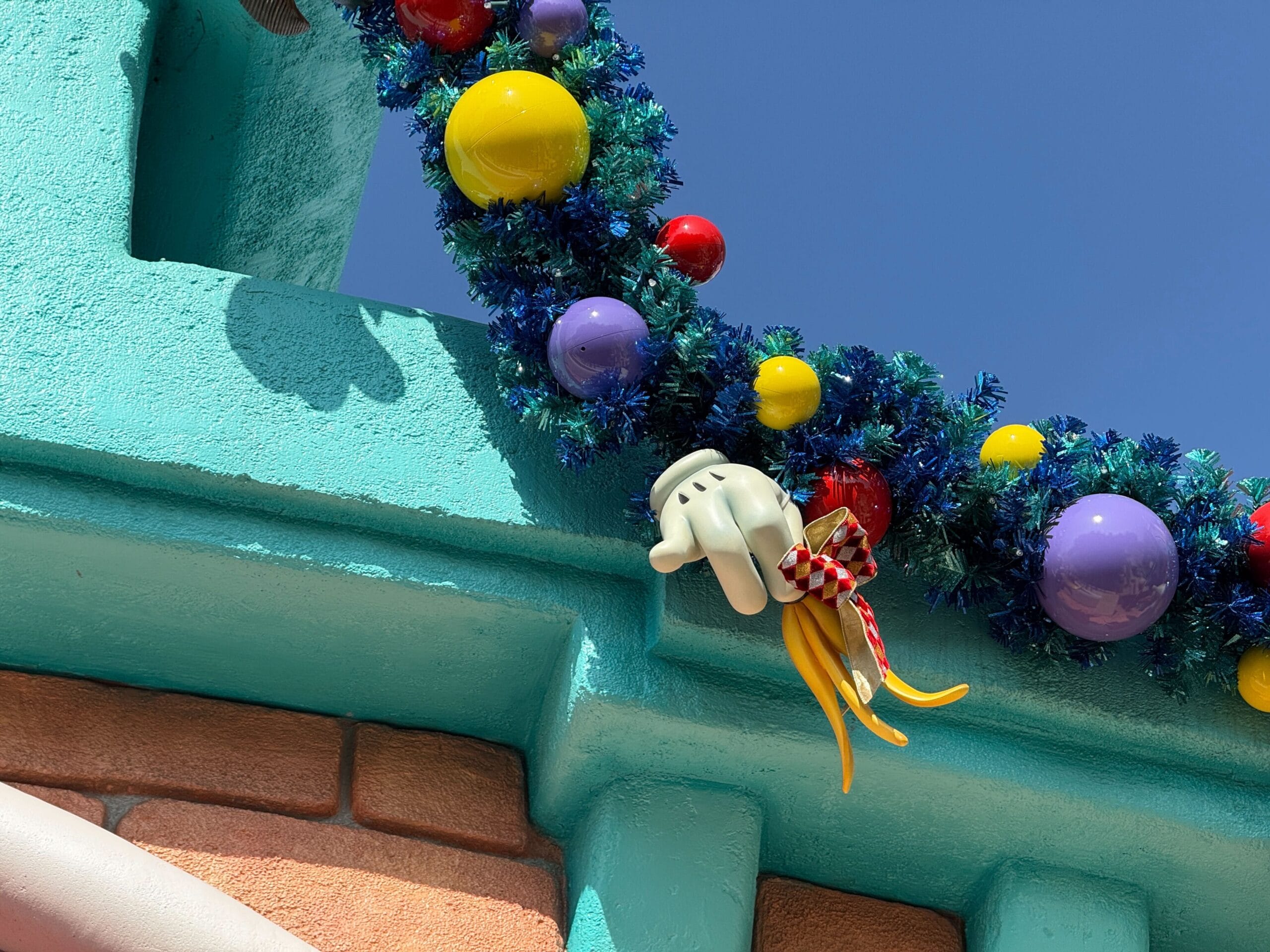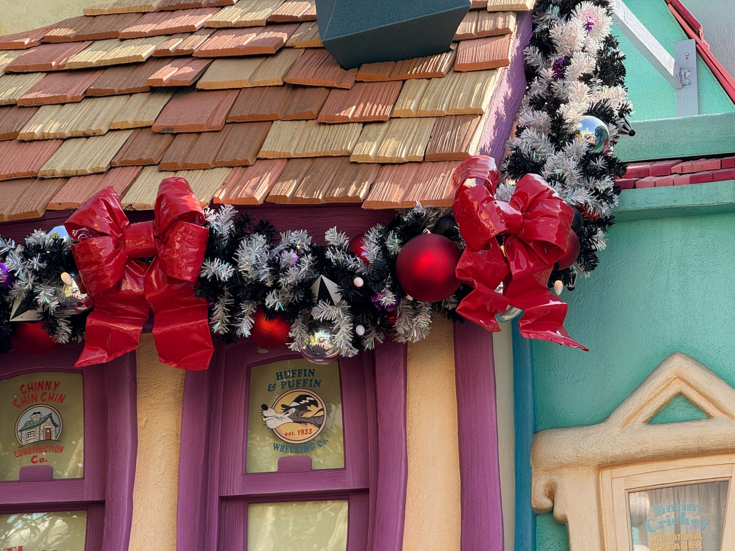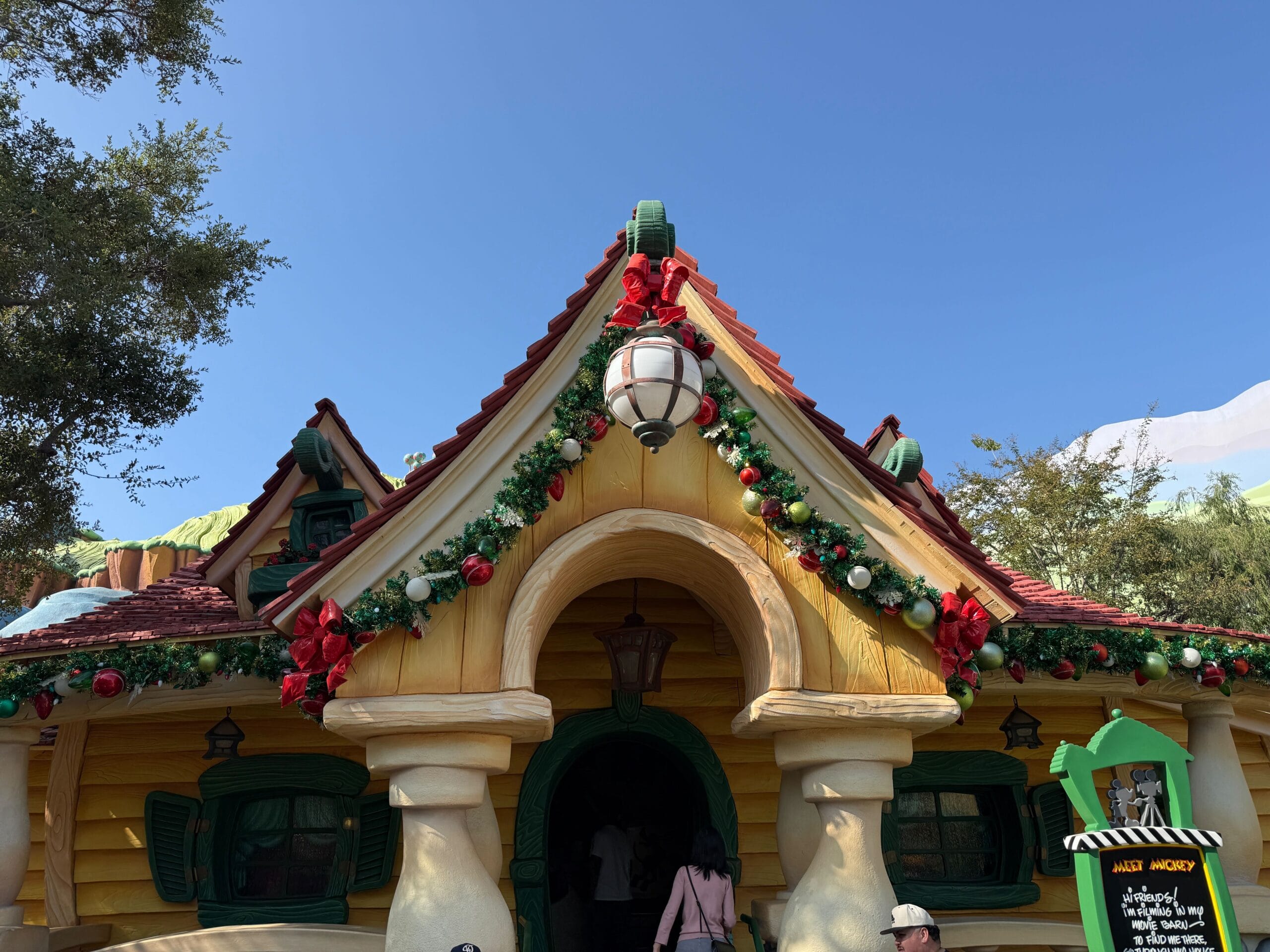 Mickey’s rooftop is lined with classic green garland full of red, green, and white baubles. It’s accented by red bows, and another red bow is on the lantern above his porch.