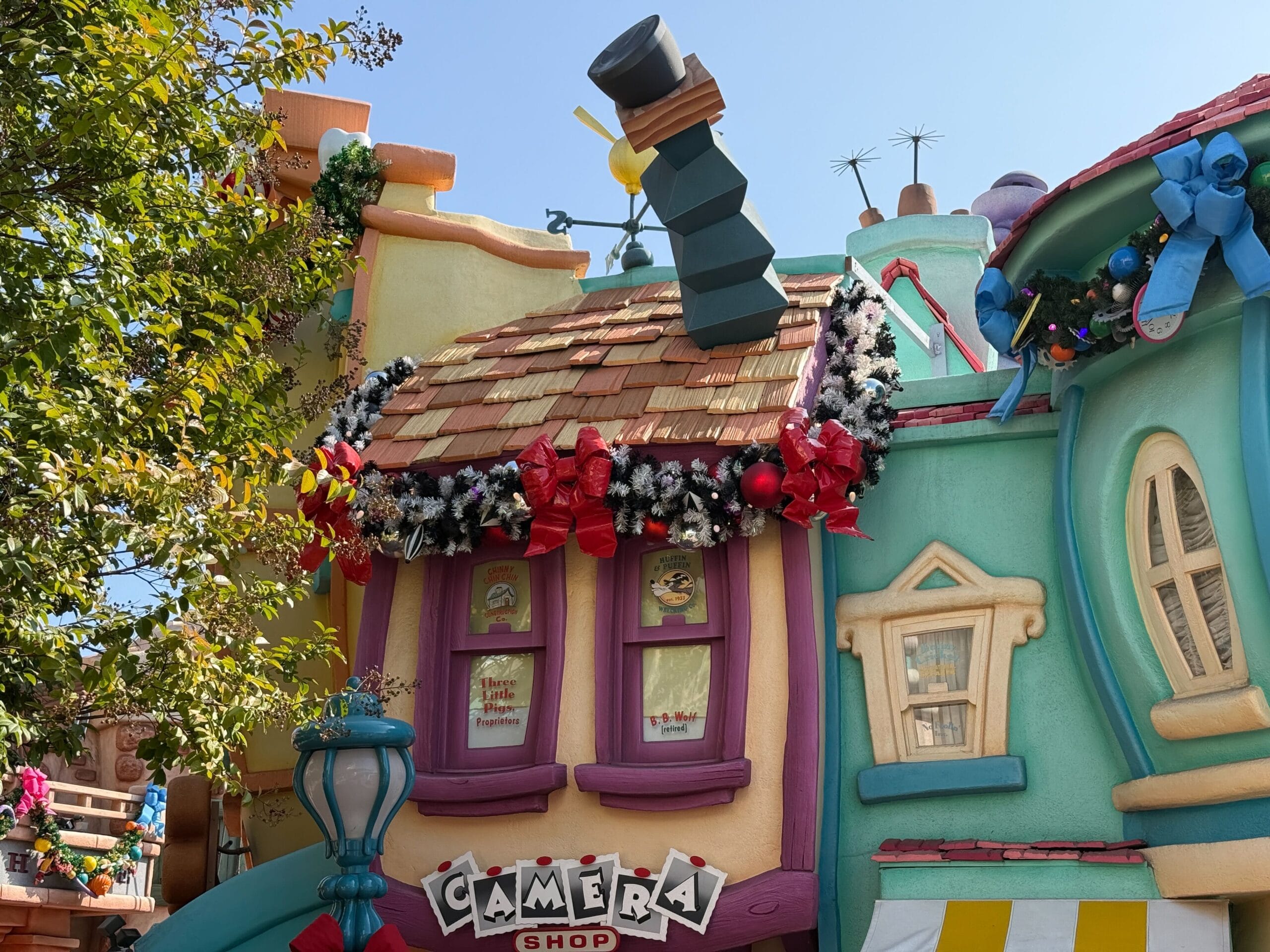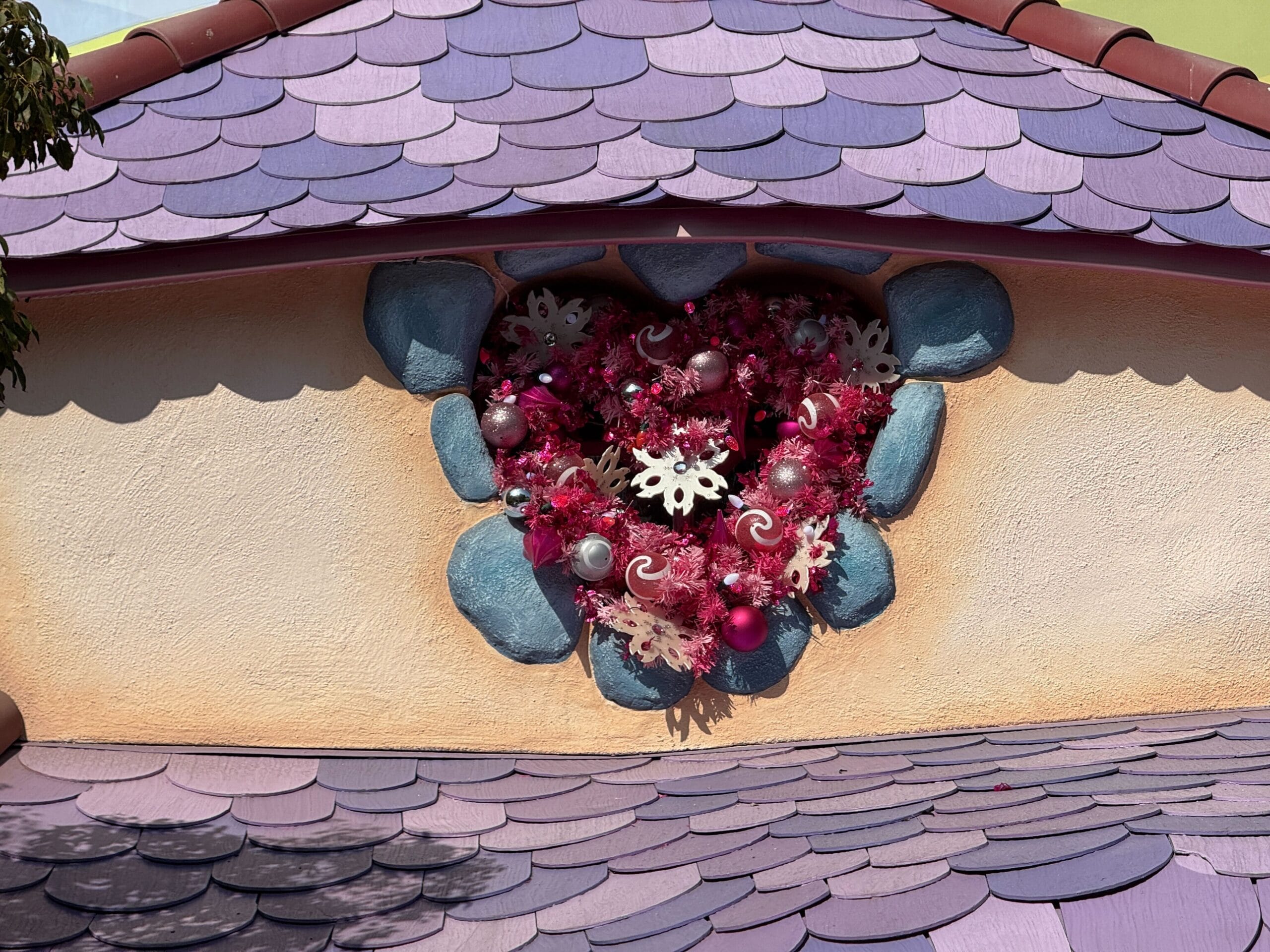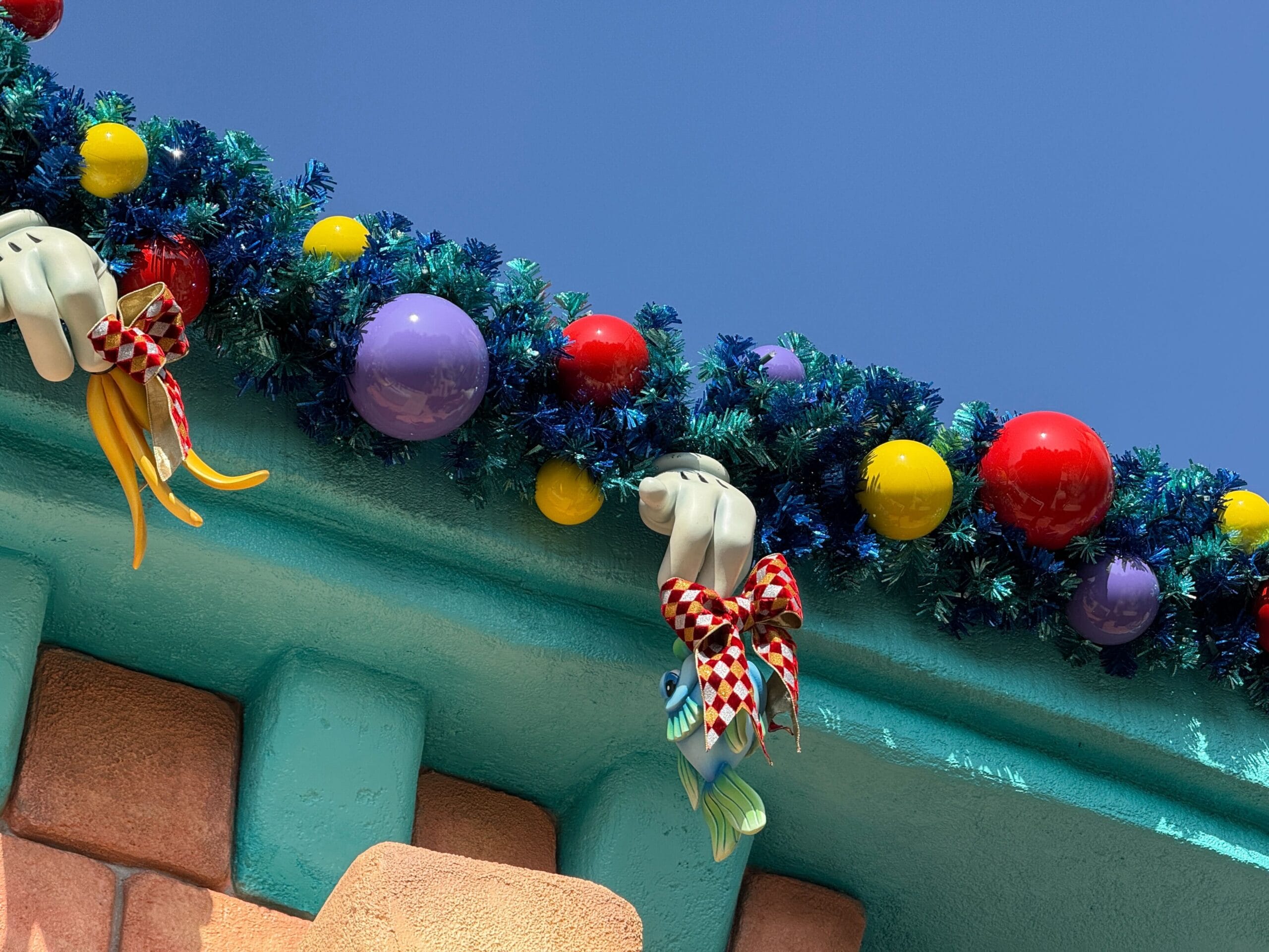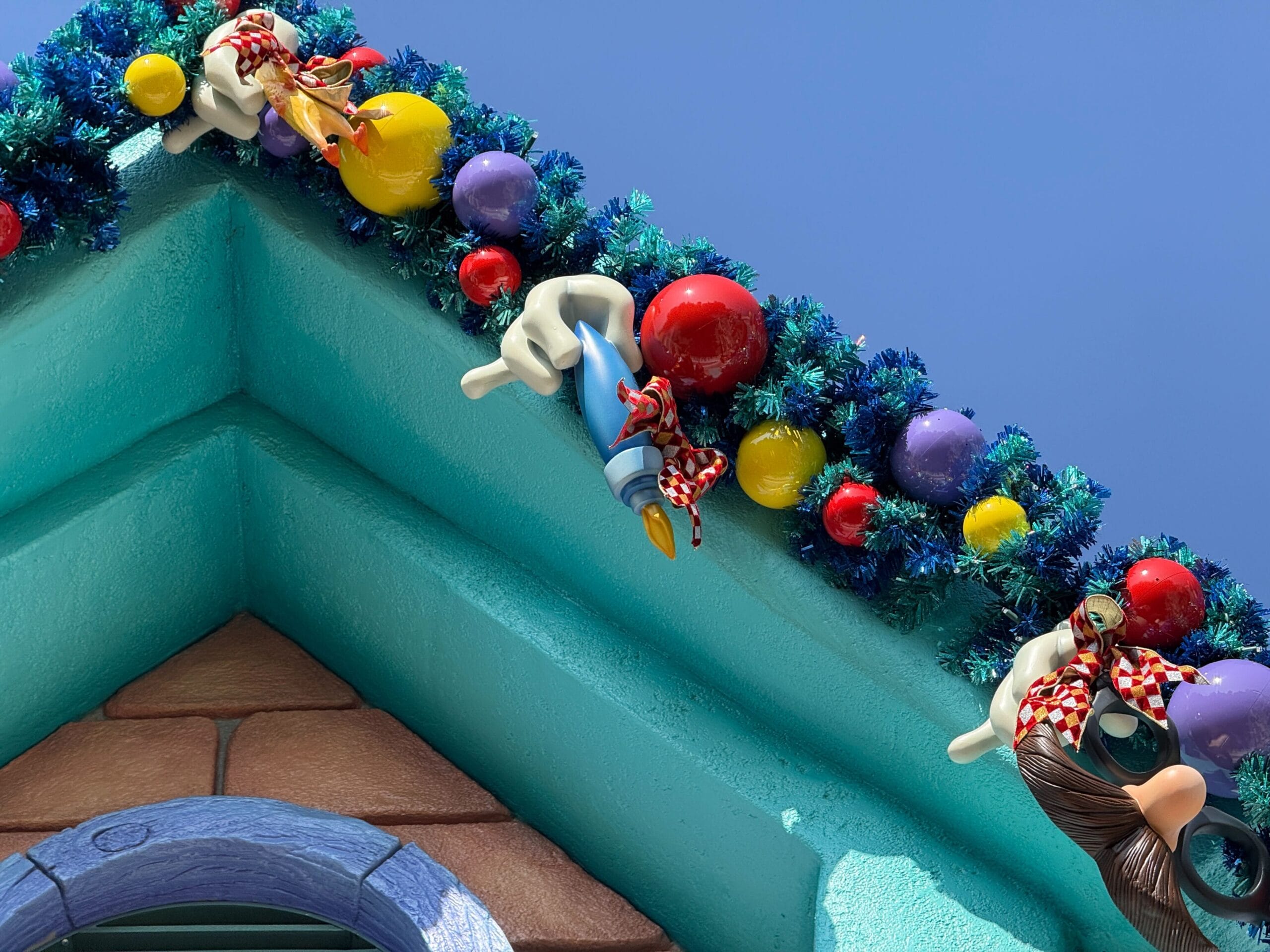 Mickey’s rooftop is lined with classic green garland full of red, green, and white baubles. It’s accented by red bows, and another red bow is on the lantern above his porch.