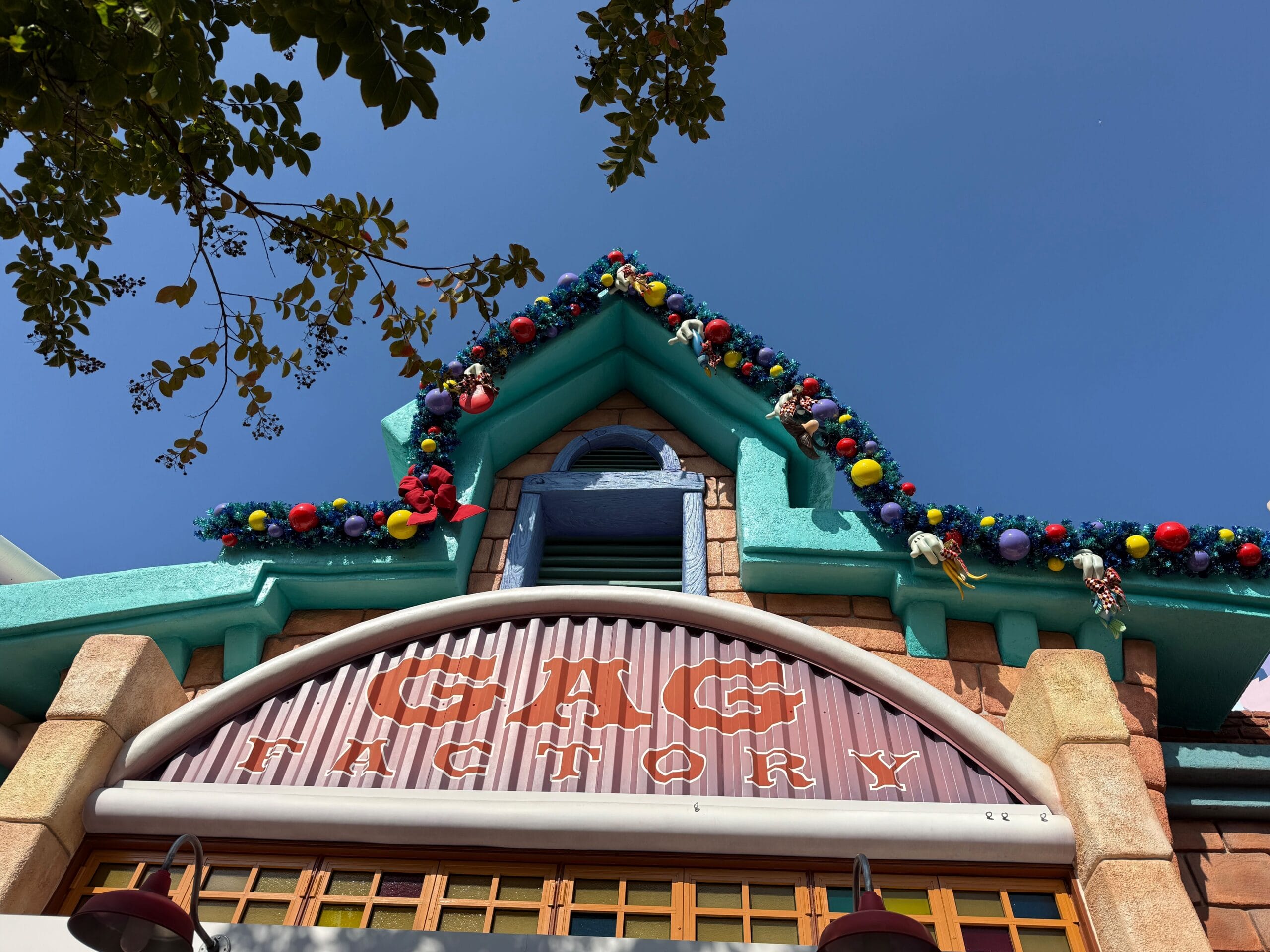 The garland running down the street of the Gag Factory Warehouse features different prank items. There are clattering teeth, purple tube snakes, and other toys woven among ornaments.