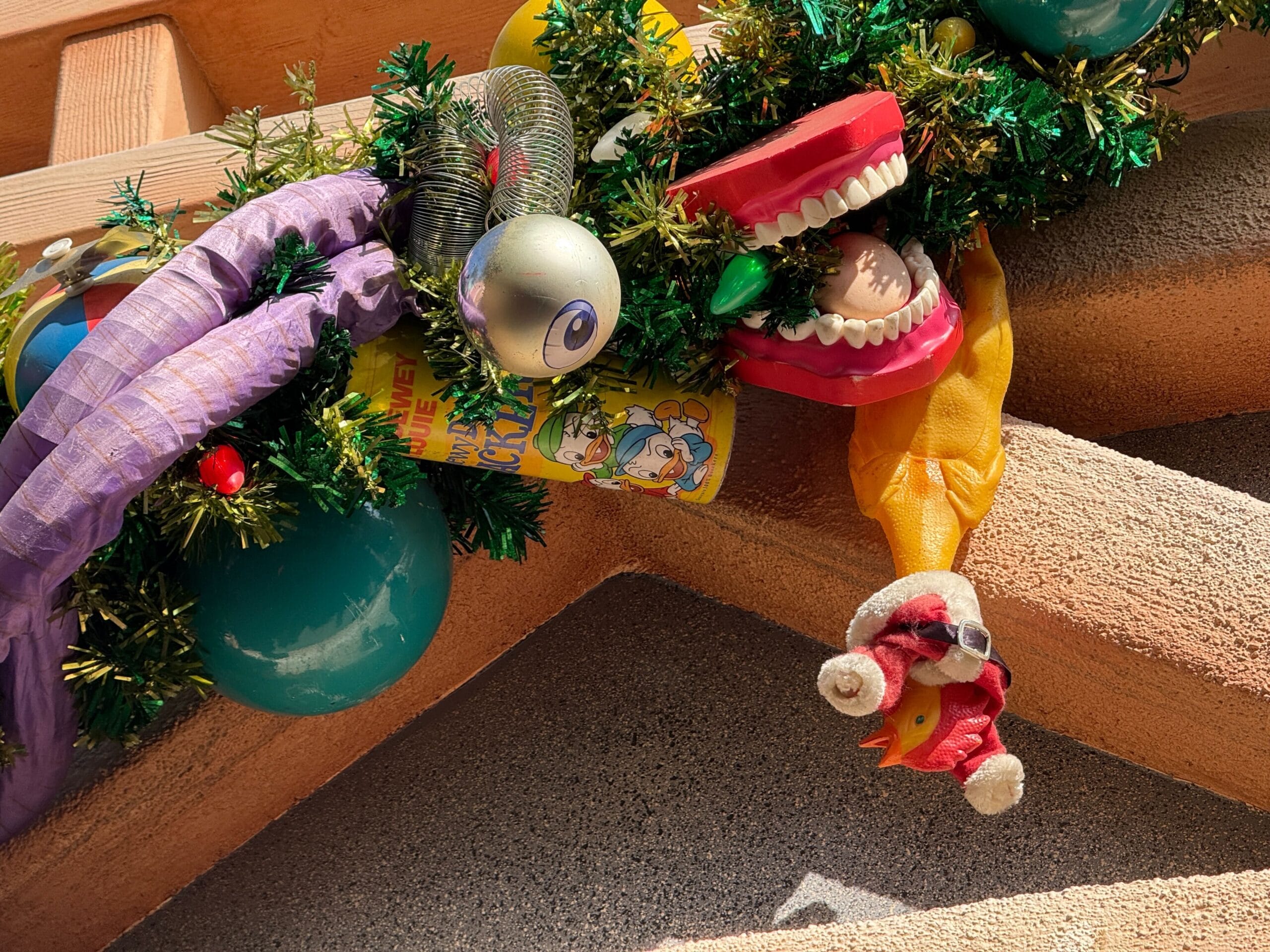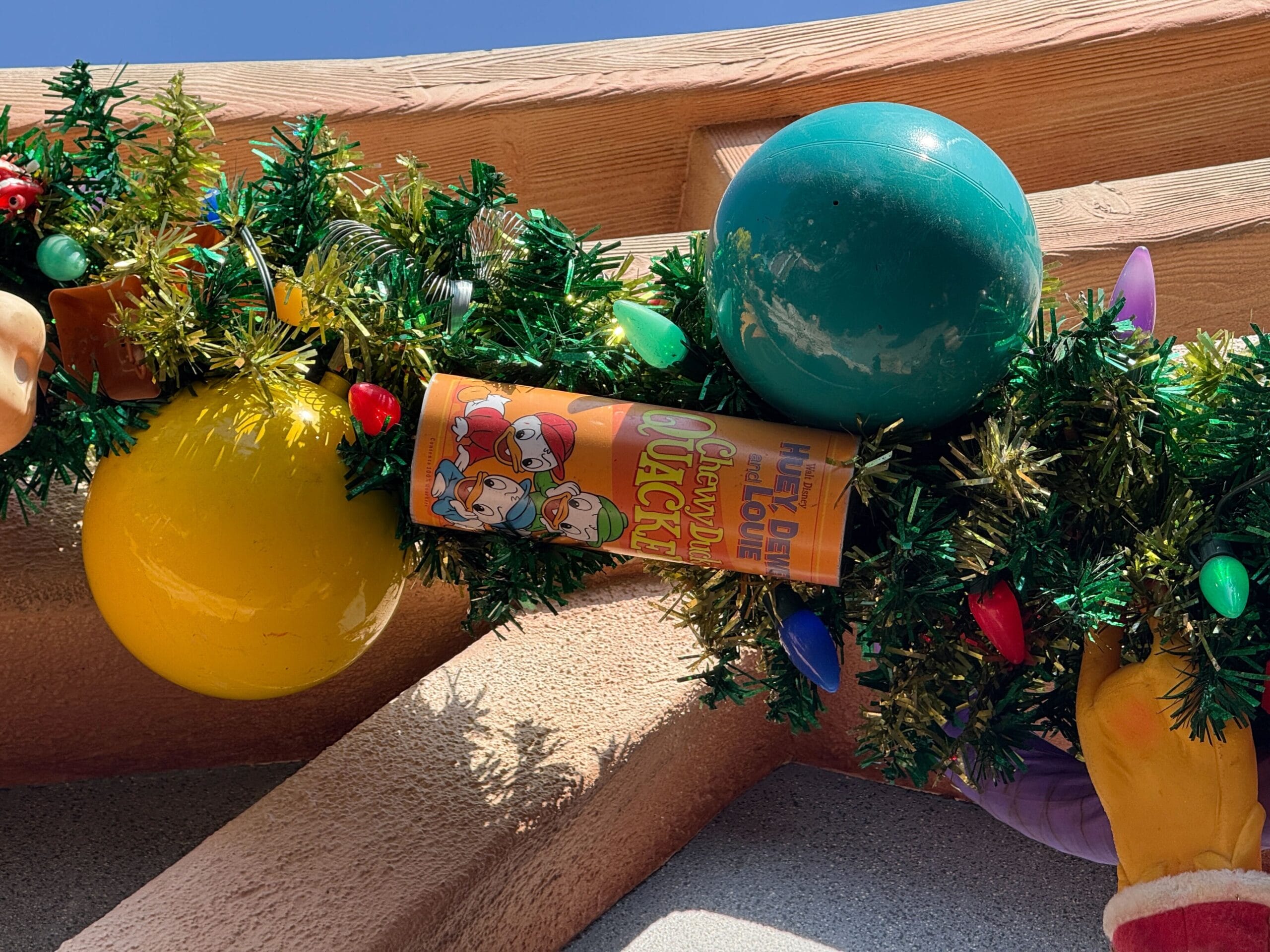 Huey, Dewey, and Louie are also referenced in the garland. Another piece, the eyeball on a spring, could be considered a reference to the iconic former entrance of World of Disney in Downtown Disney that featured a giant watchful eye surrounded by Huey, Dewey, and Louie.