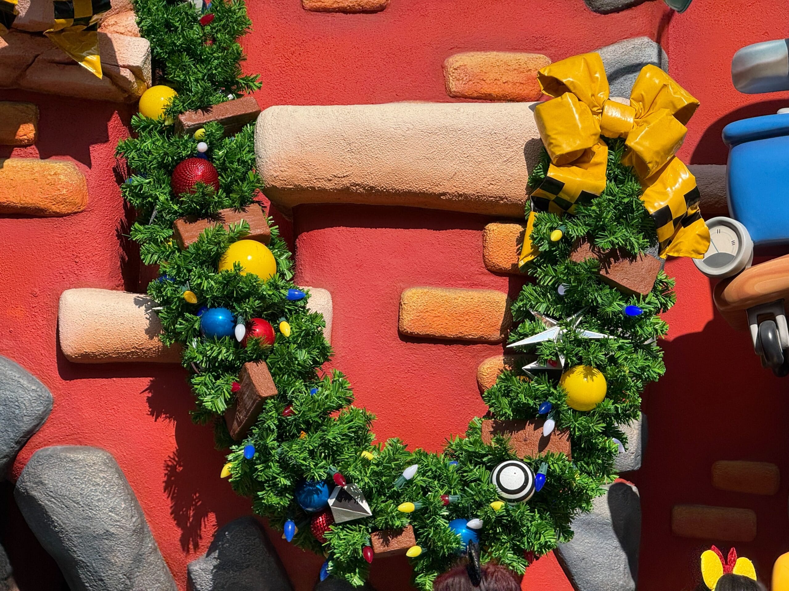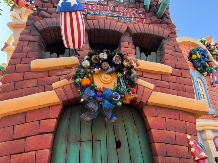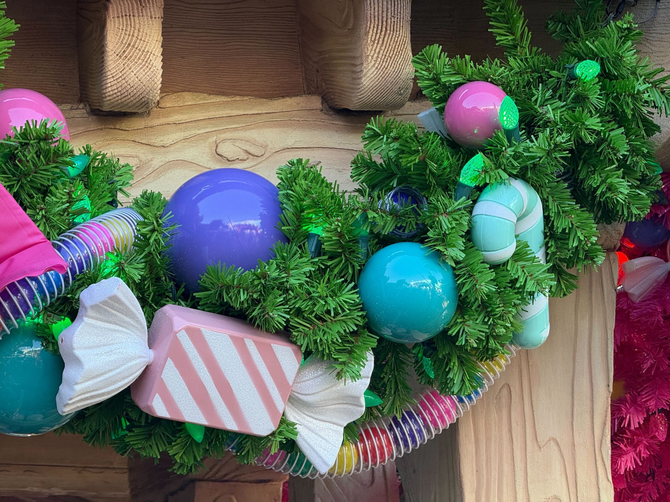 The wreath above the fireworks factory door features a singed blue bow and metallic baubles. Dented and burnt ornaments closest to the “blast zone” align with the interactive feature if the Fireworks Factory.