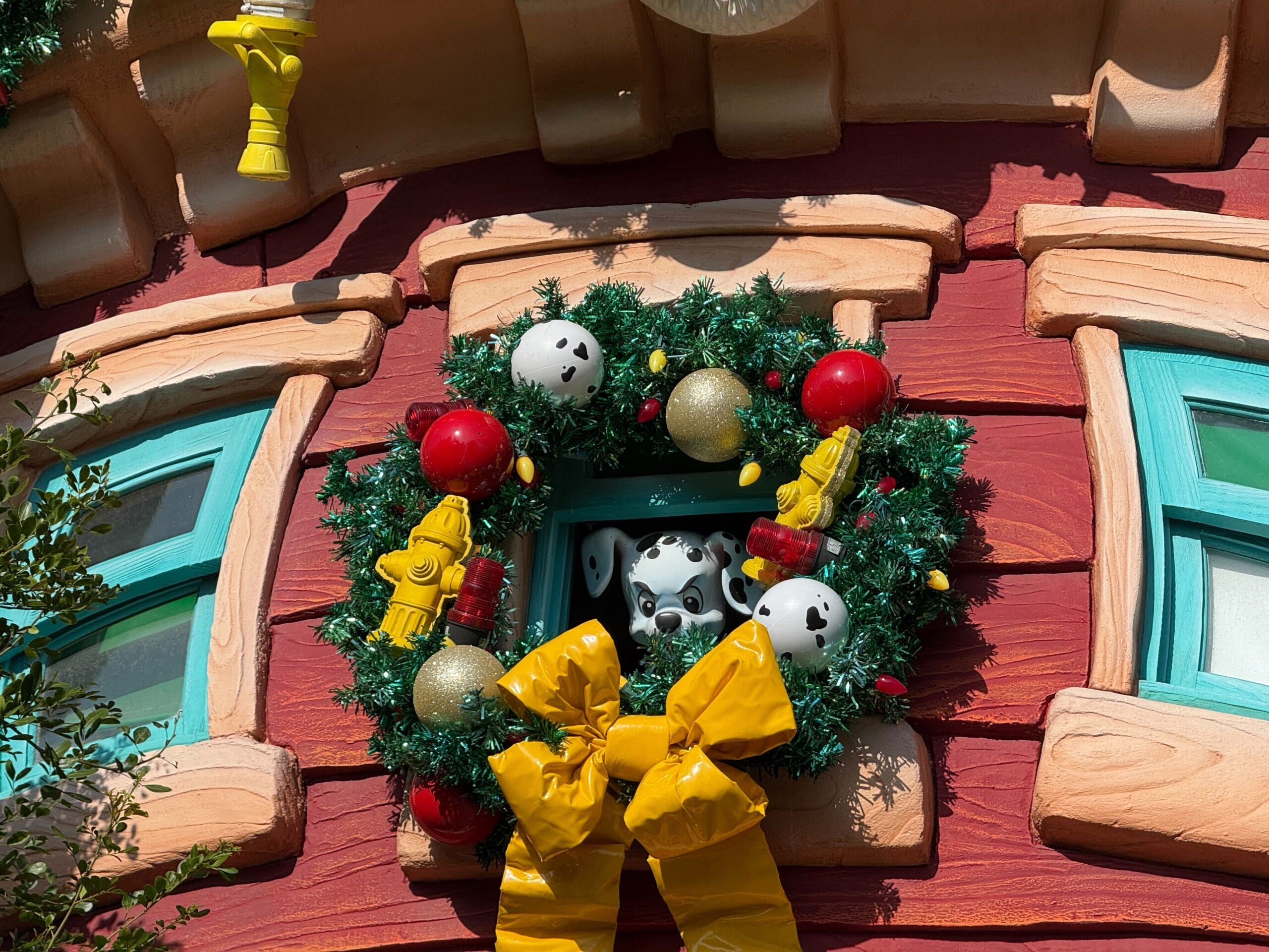 Atop the firehouse is a string of garland and a wreath decorated with red, white, and pale gold ornaments. The white ornaments feature Dalmation spots. Water hoses are wrapped with the garland.