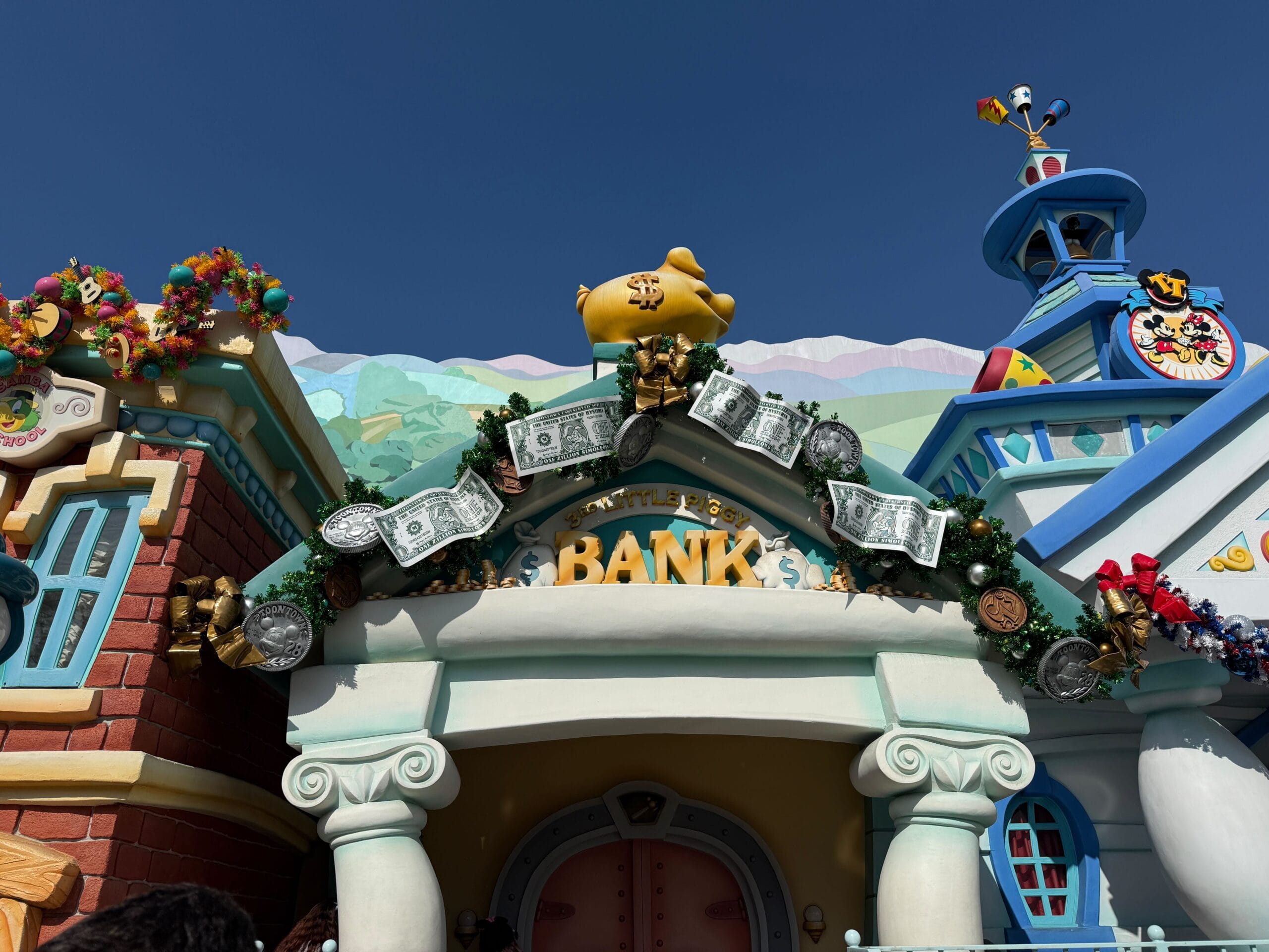 The bank’s decor with Roger Rabbit and Mickey-themed money is a refreshed rendition on a classic. Coins, dollars, and gold bows line the garland.