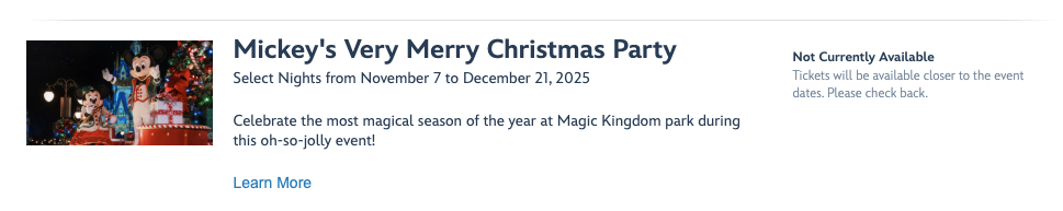 On November 15, only one date was still available for Mickey’s Very Merry Christmas Party tickets. As of today, the Walt Disney World website and My Disney Experience app are showing that the event is completely sold out: