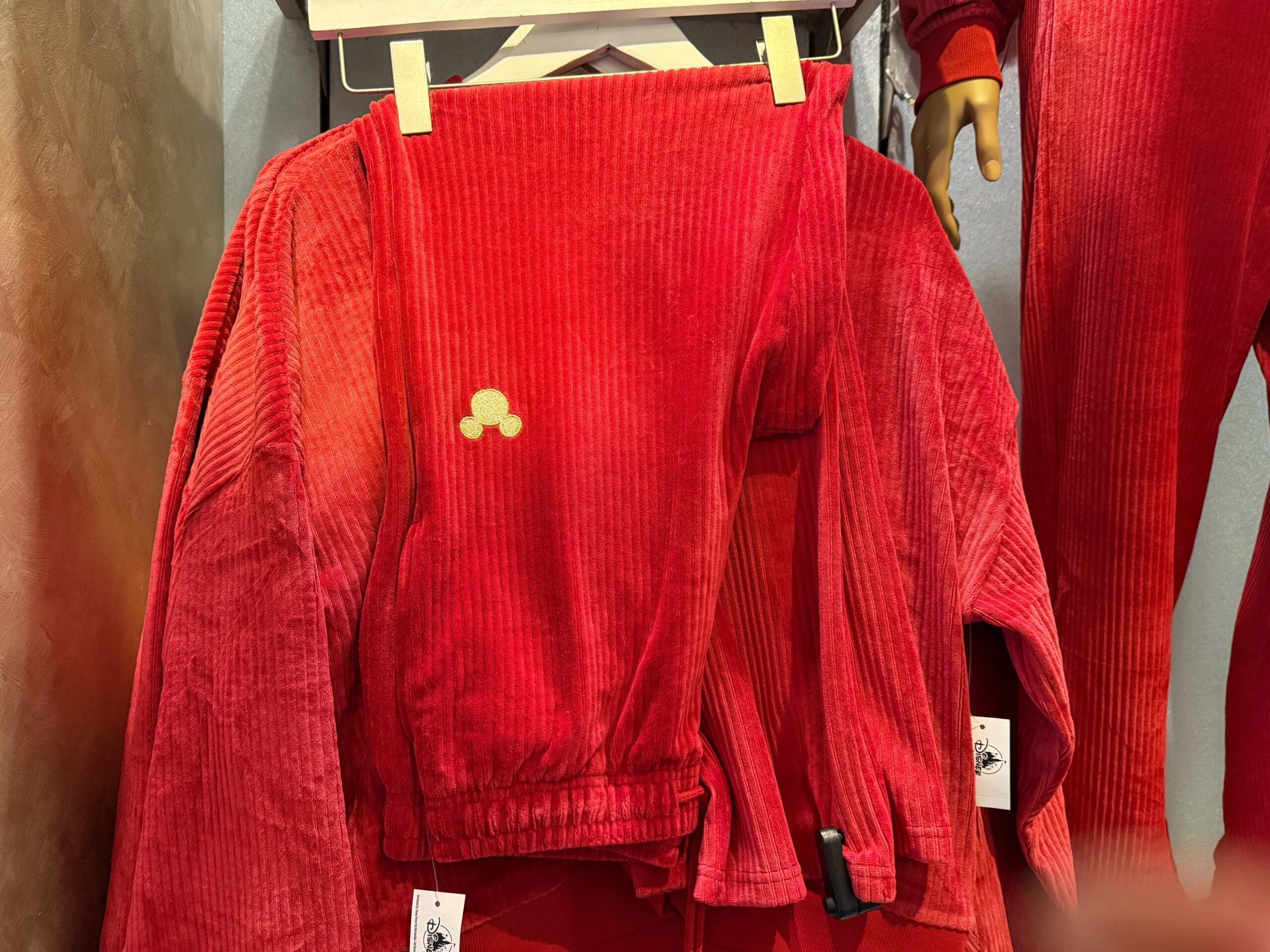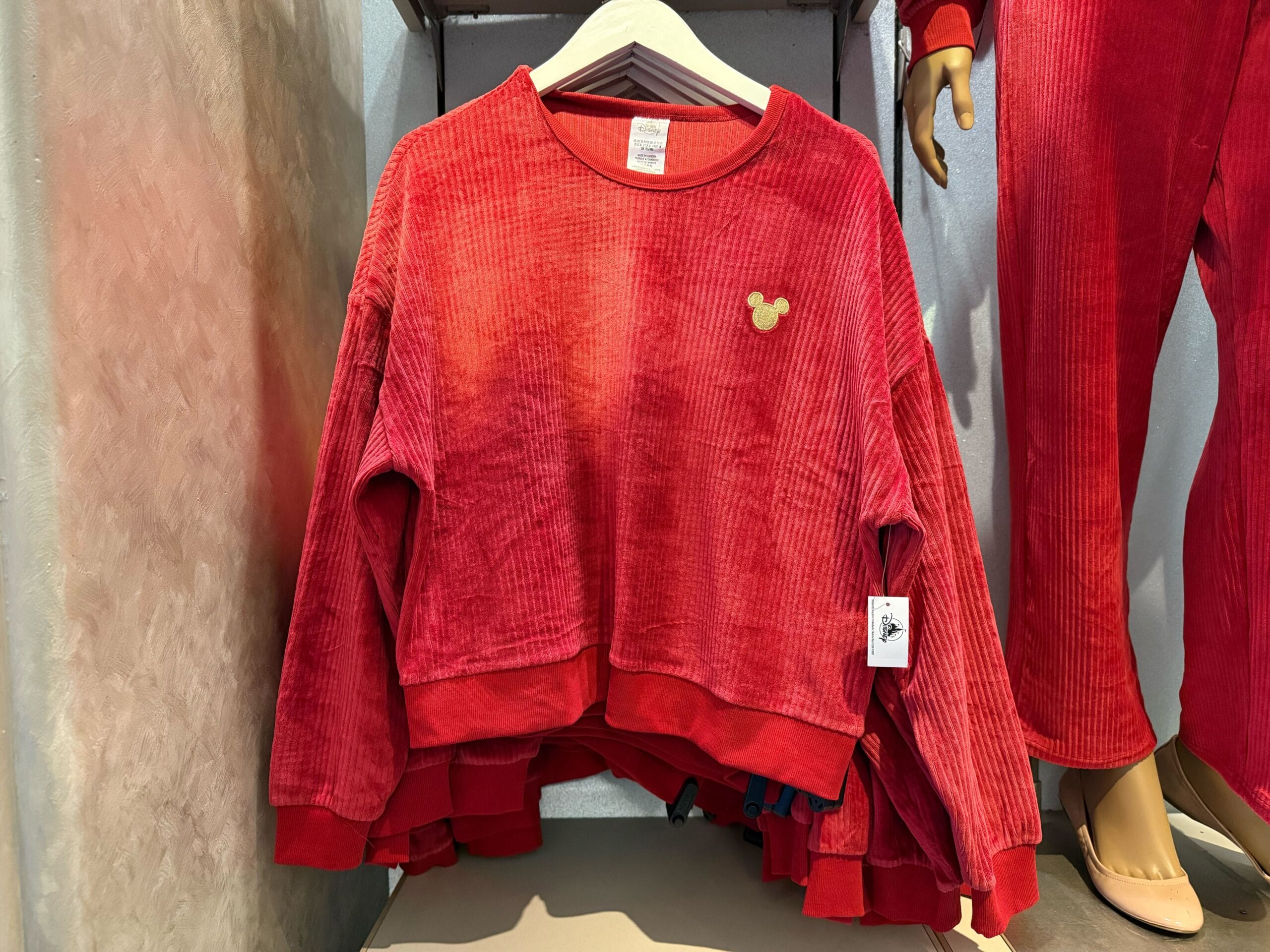 The red sweater set is the same as the white one with the gold Mickey heads on the breast and hip. The only difference is that this set is a jolly red.