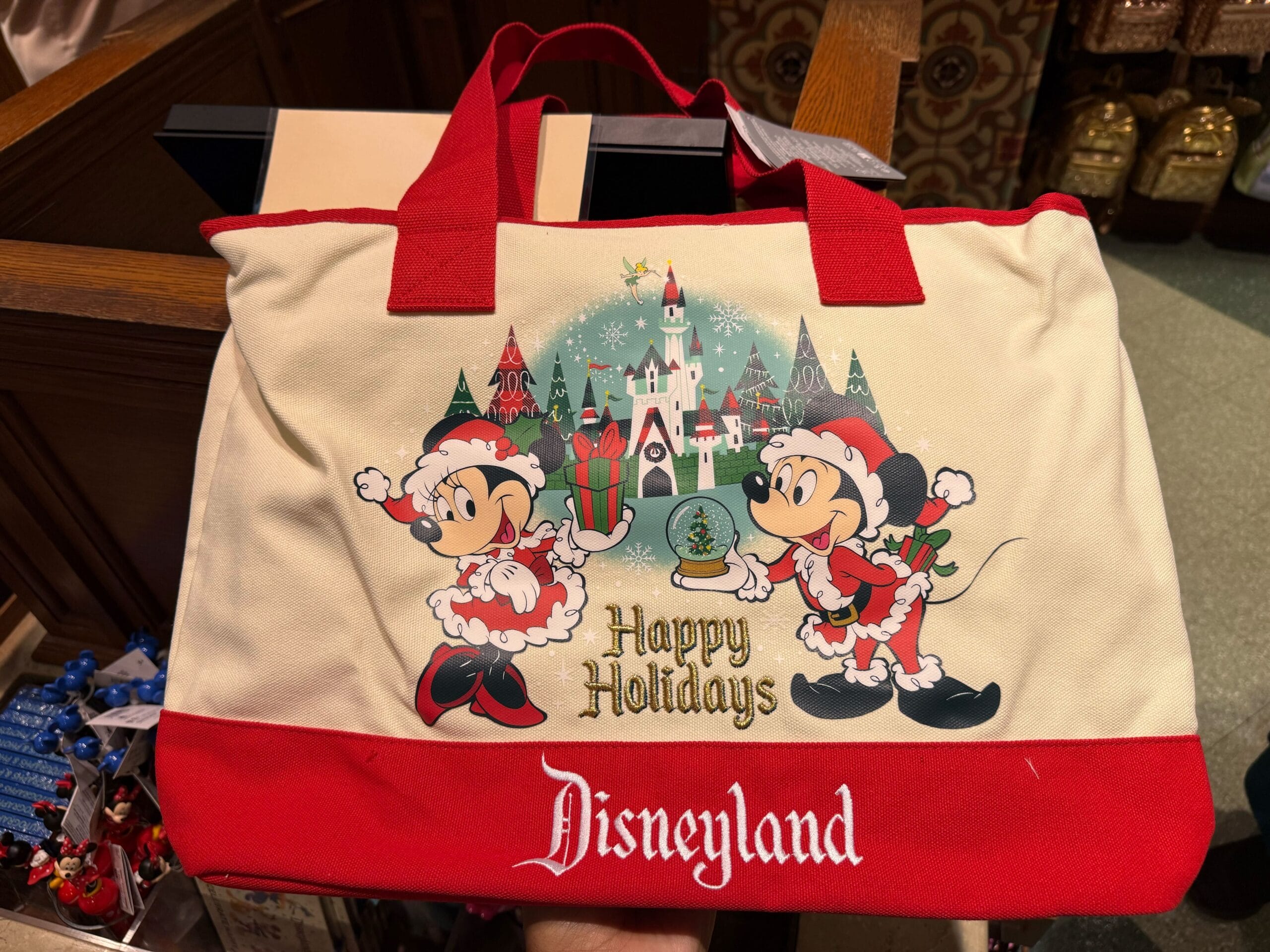 This holiday tote has Santa Mickey and Minnie exchanging gifts in front of Sleeping Beauty Castle. The castle is green and white with red accents. The bottom of the bag is red and has “Disneyland” embroidered in white. In between Minnie and Mickey is “Happy Holidays” embroidered in gold. The straps are red, and the bag zips closed with a red zipper.