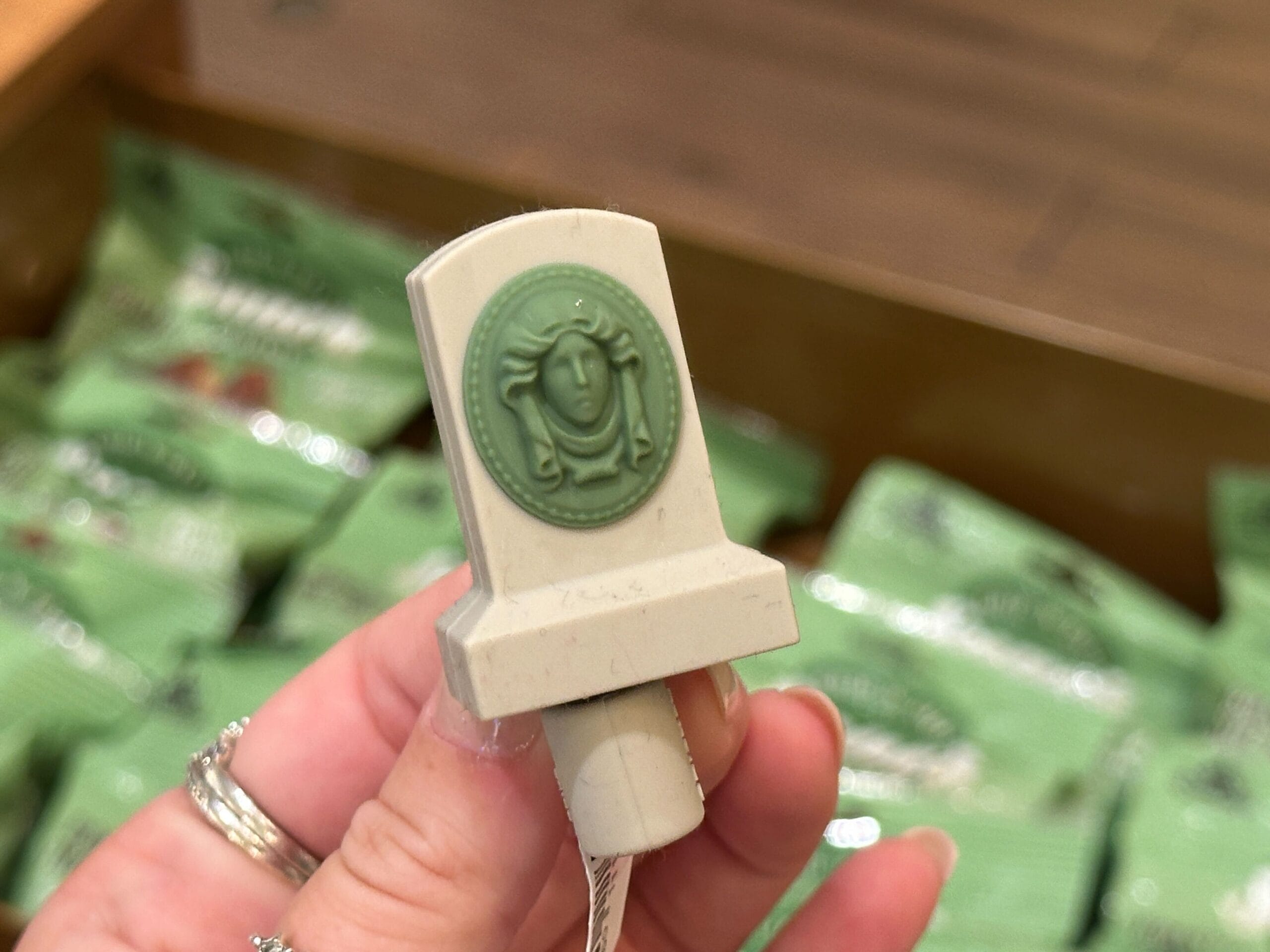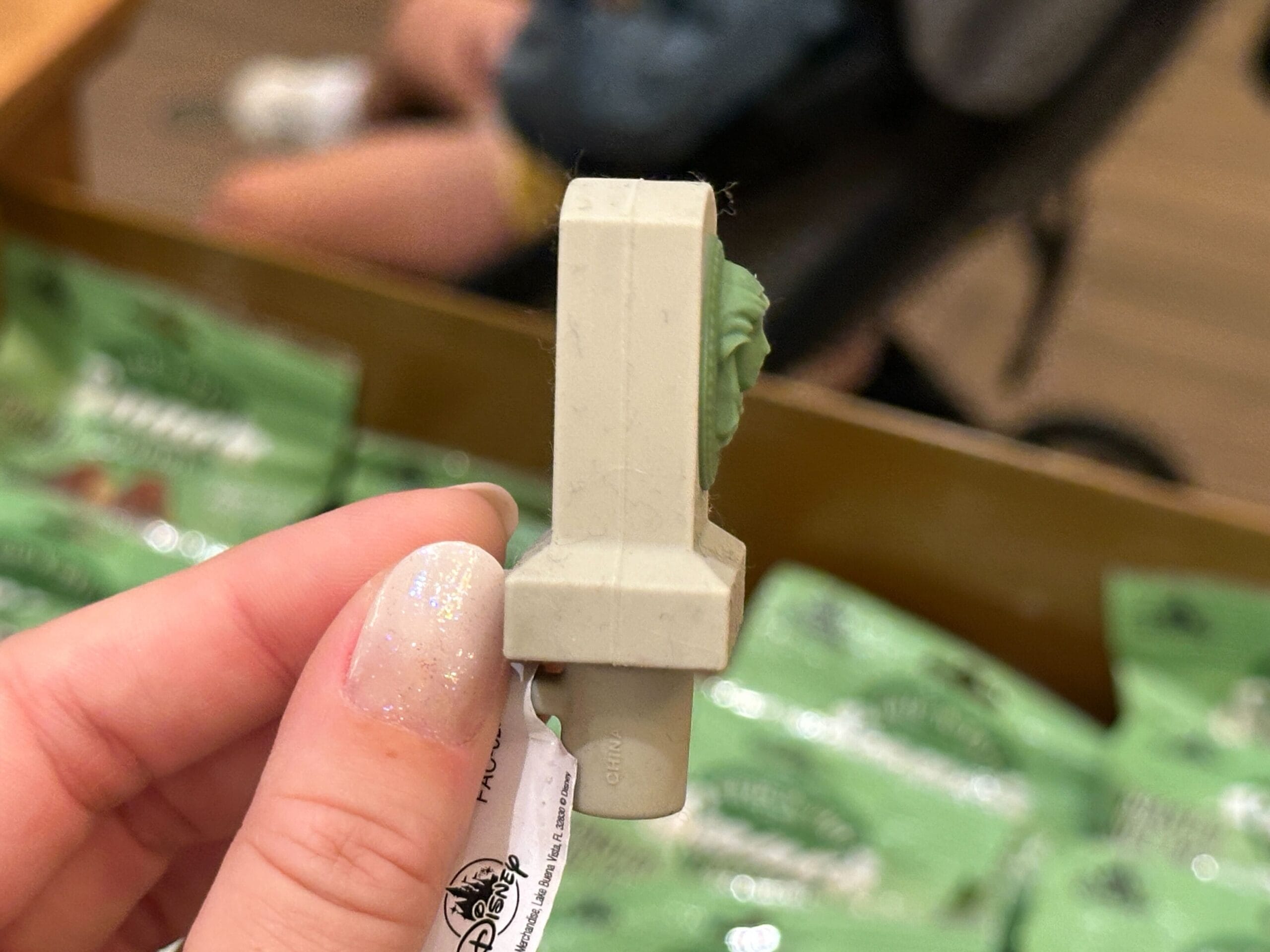 This straw topper is a gray-beige color with Madame Leota’s mortal visage in green on the front. Each topper has a short strap attaching to the loop that slides on the straw.