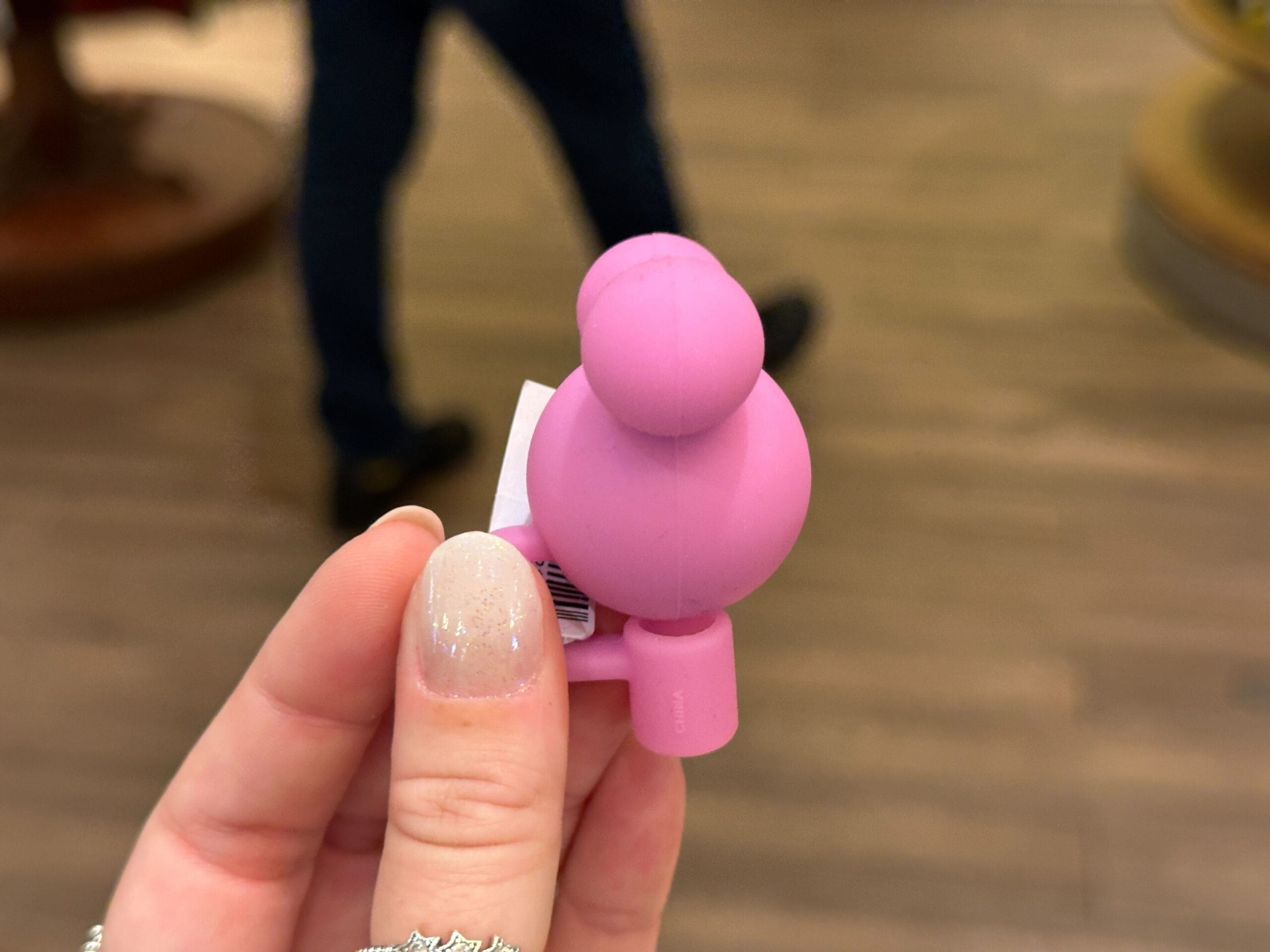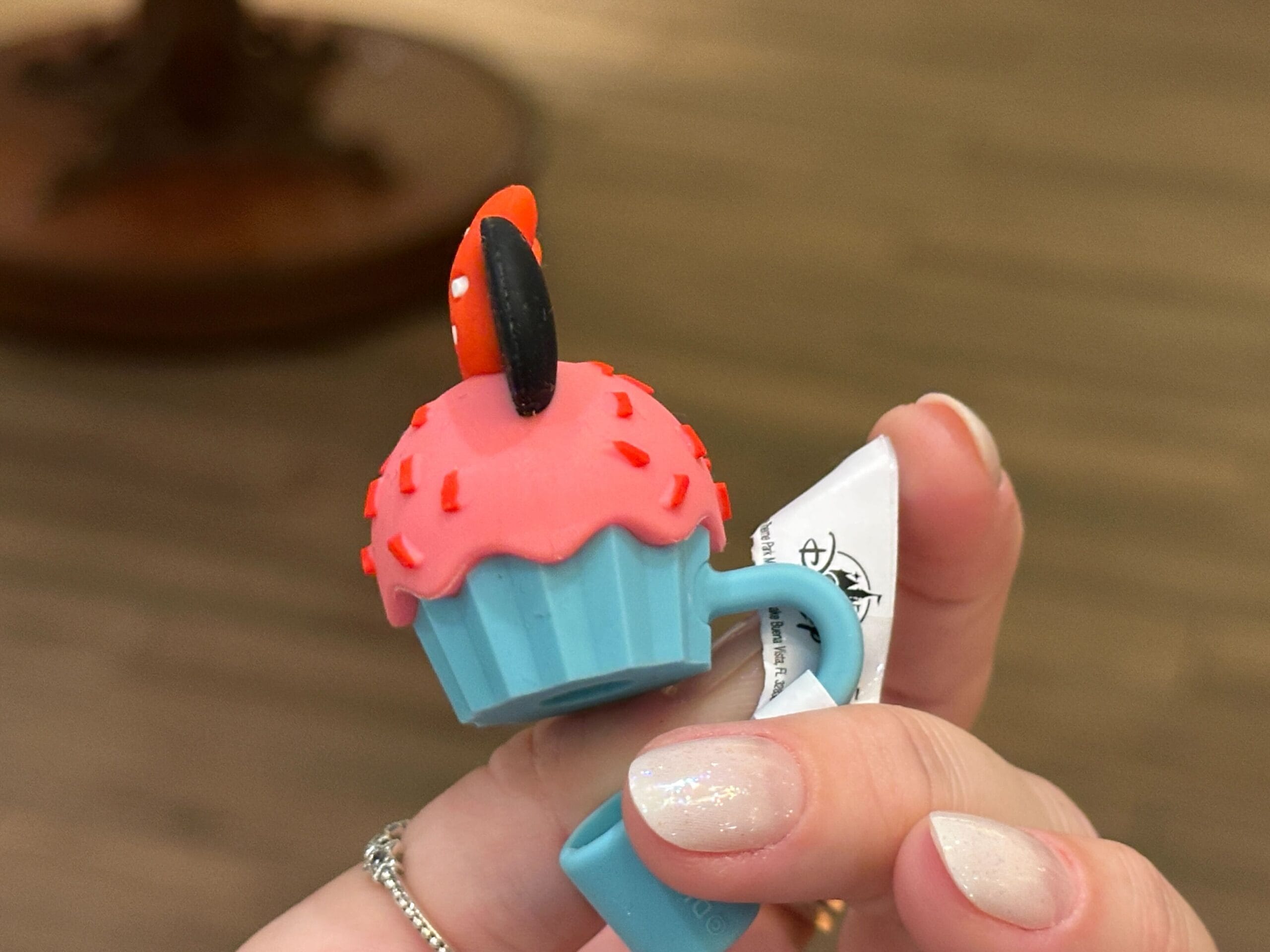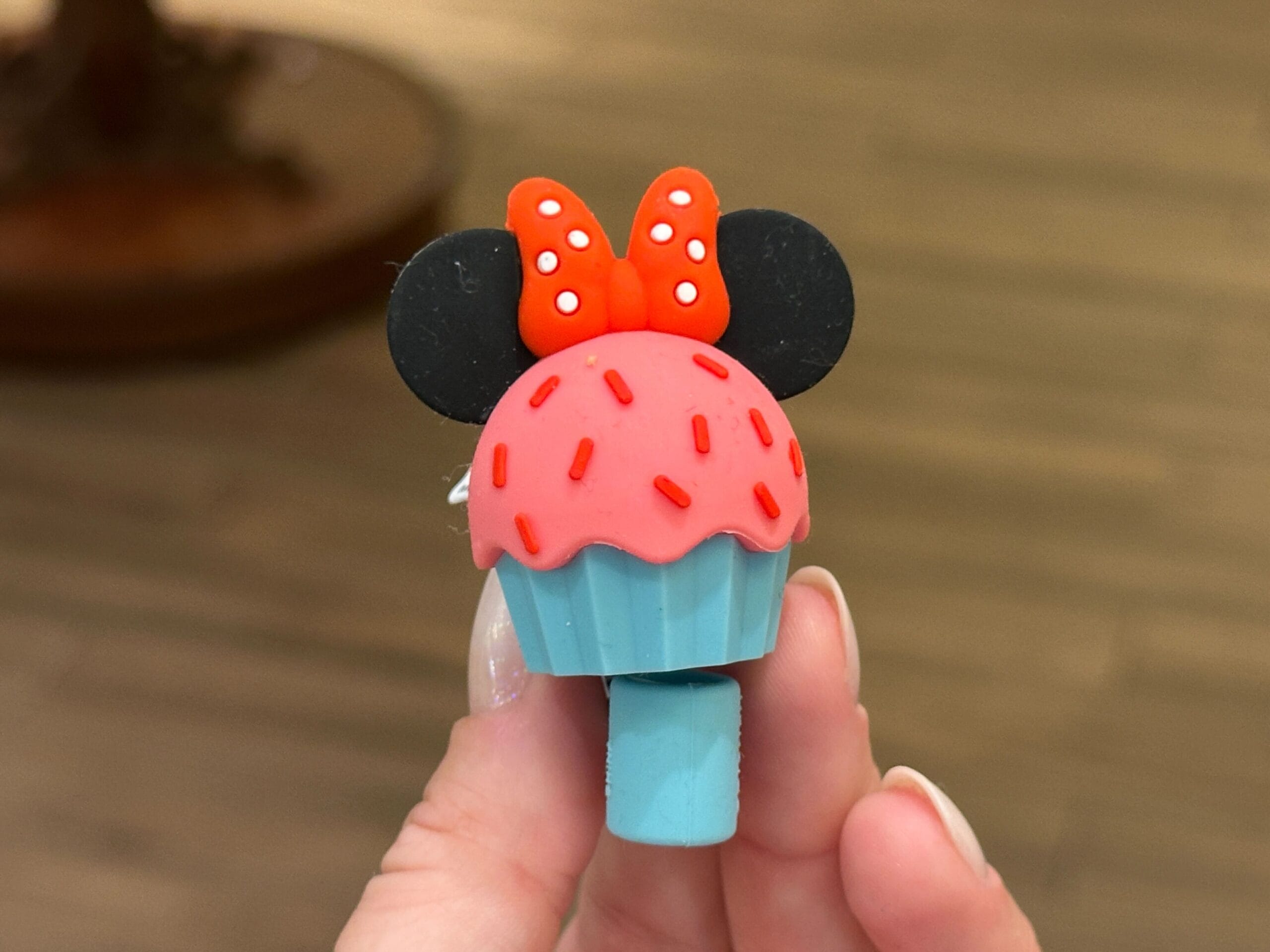 This sculpted straw topper resembles a cupcake with pink frosting, mouse ears, and a Minnie bow on top.