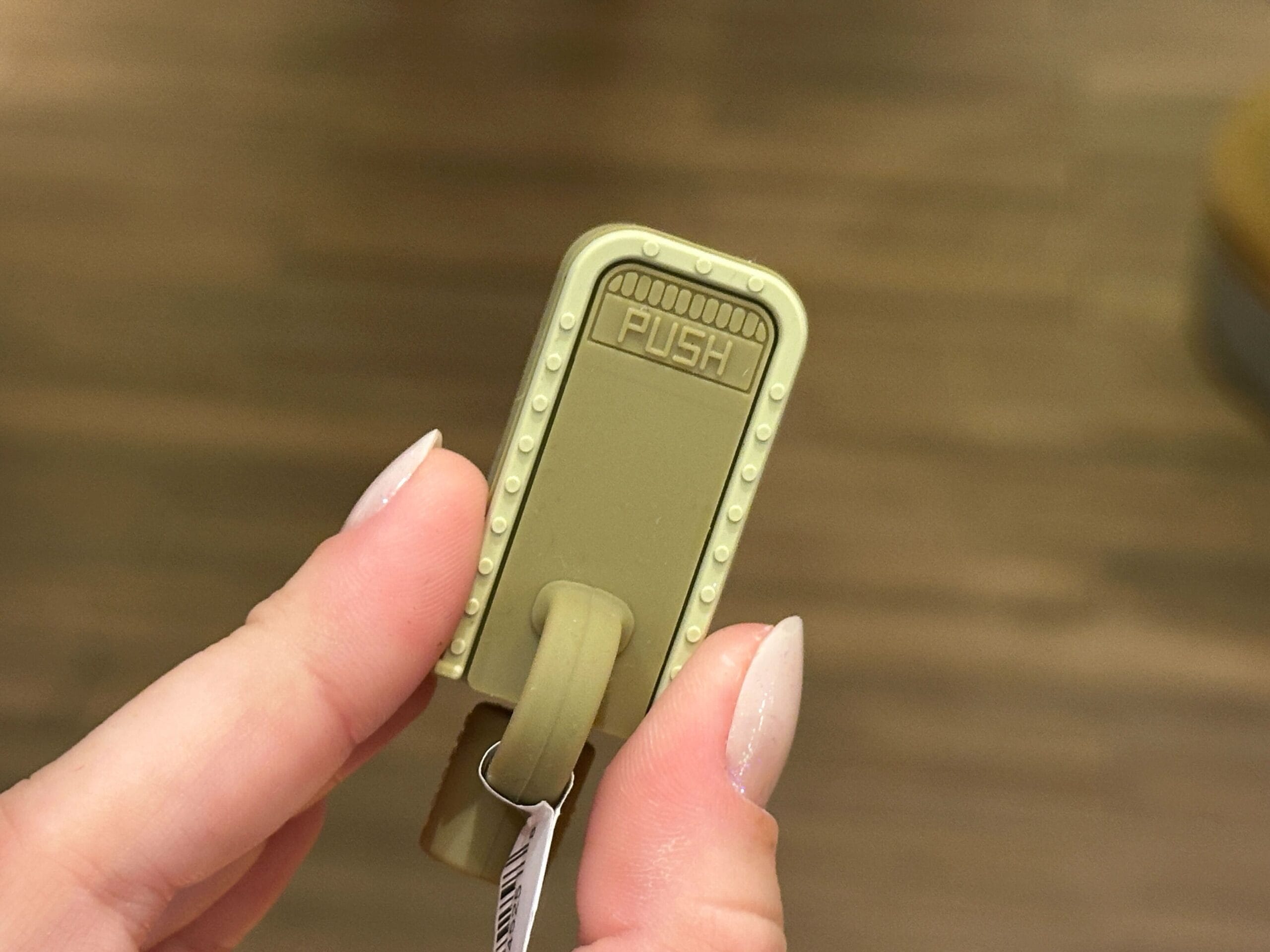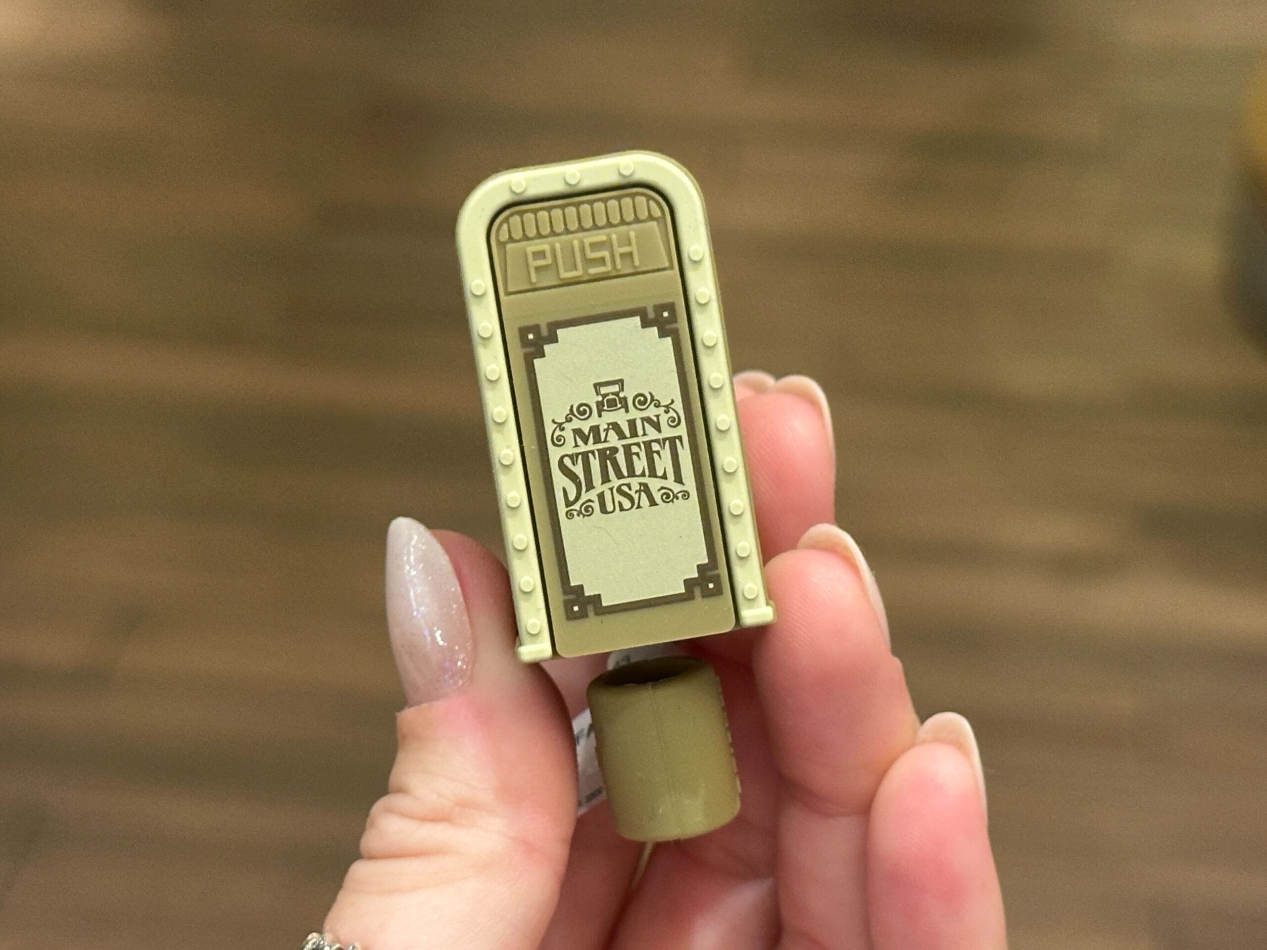 Based on Disney’s famous trash cans, this green topper has Main Street, U.S.A. artwork on the front. The front and back both have “Push” on the faux doors.