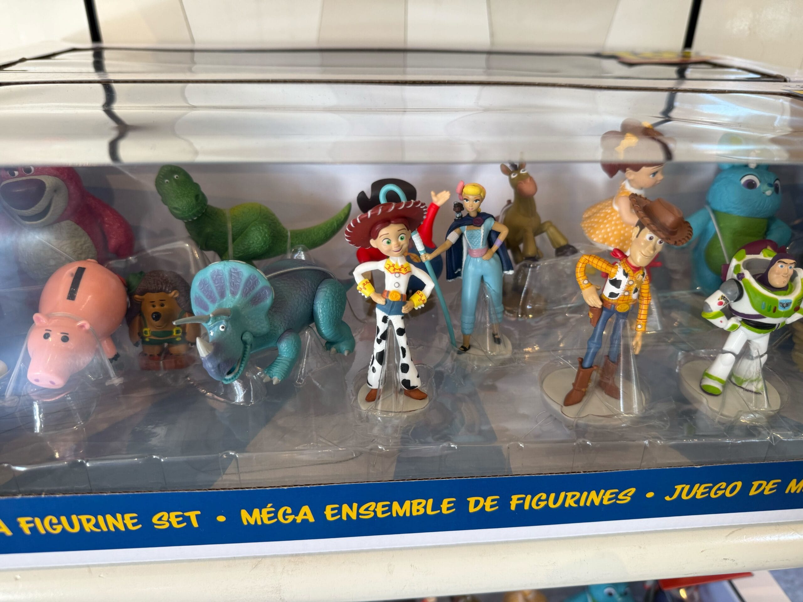 The Toy Story figurine set includes characters from across the franchise: Woody, Buzz Lightyear, Rex, Hamm, Aliens, Zurg, Jessie, Bullseye, Stinky Pete, Lotso, Mr. Pricklepants, Dolly, Trixie, Buttercup, Ducky, Bunny, Gabby Gabby, Forky, and Bo Peep.