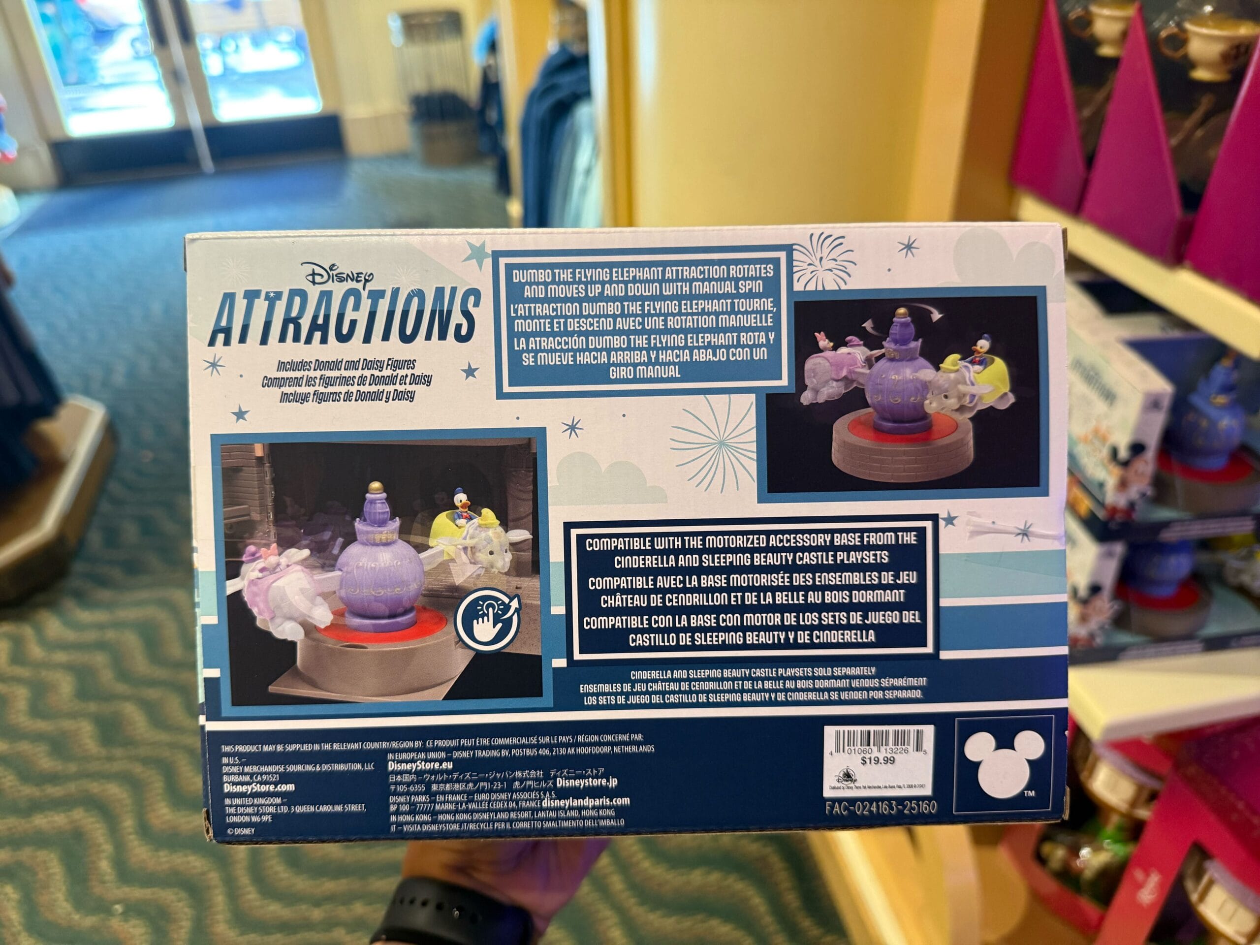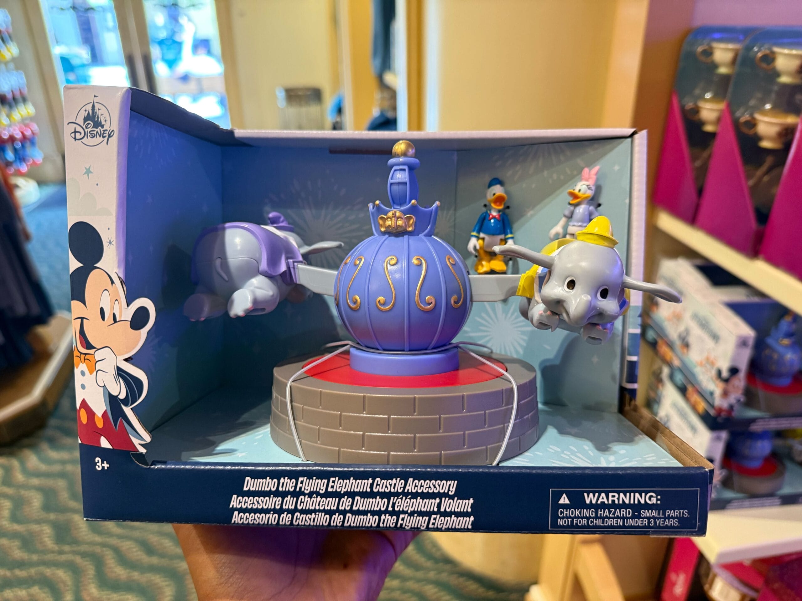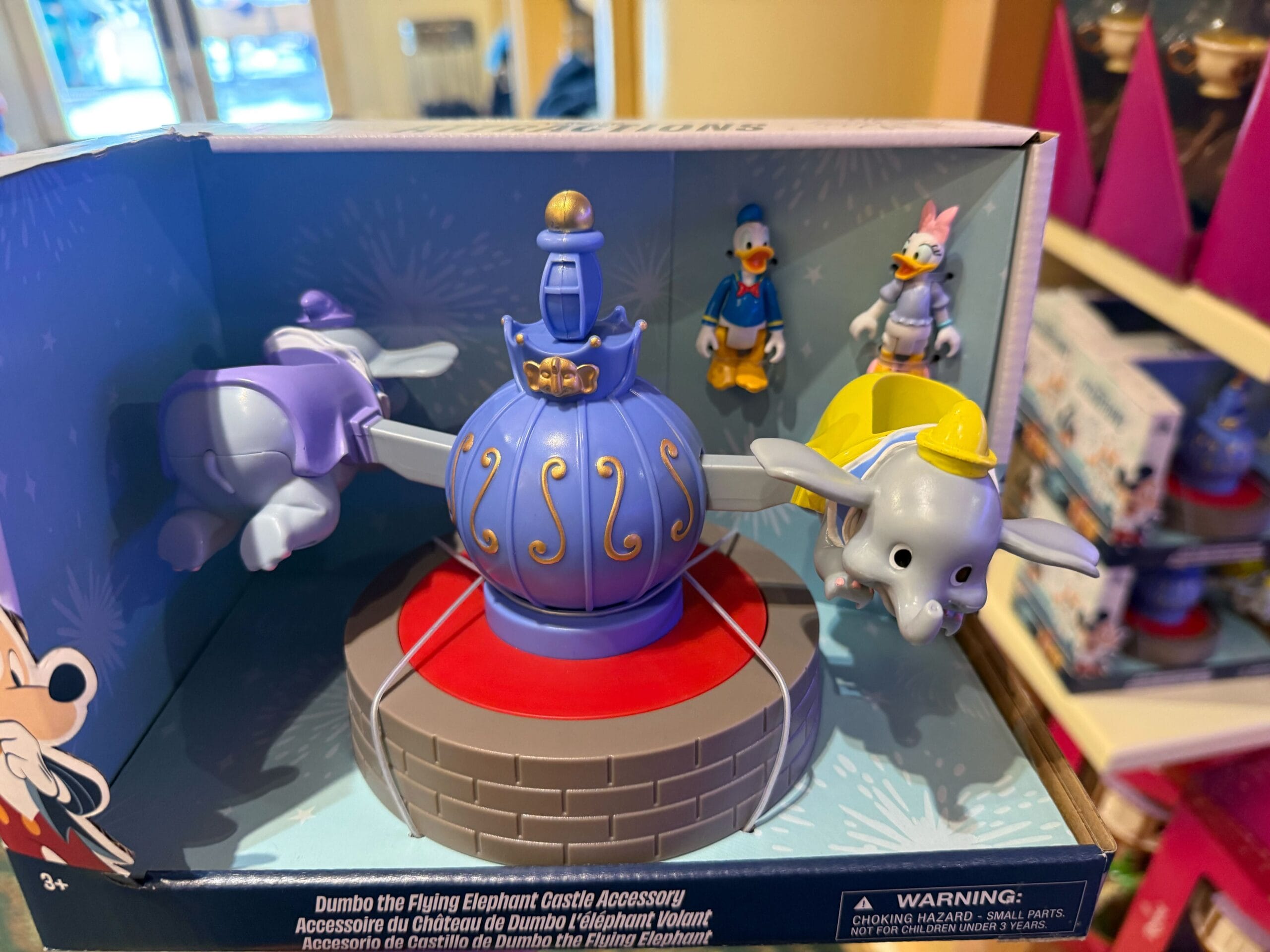 It comes with articulated Donald Duck and Daisy Duck figures, which can sit inside the Dumbo vehicles. Like the figurines, this is recommended for ages 3+.