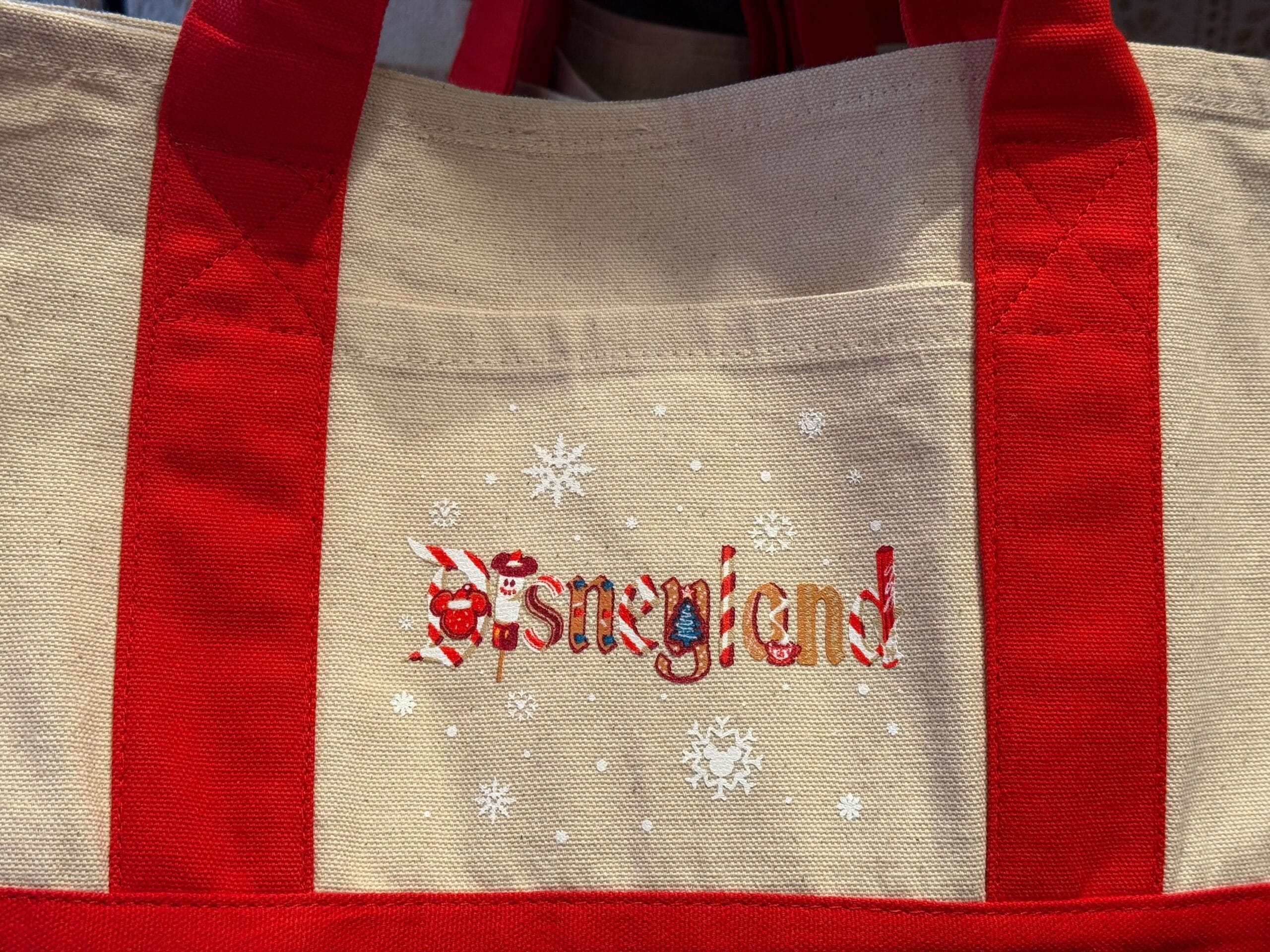 The bag’s design is a printed image of the “Disneyland” logo in a holiday-themed font. The lettering incorporates candy cane stripes and other sweet festive elements, such as a snowman pop and cookies. Snowflakes with Mickey head silhouettes are scattered around the text.