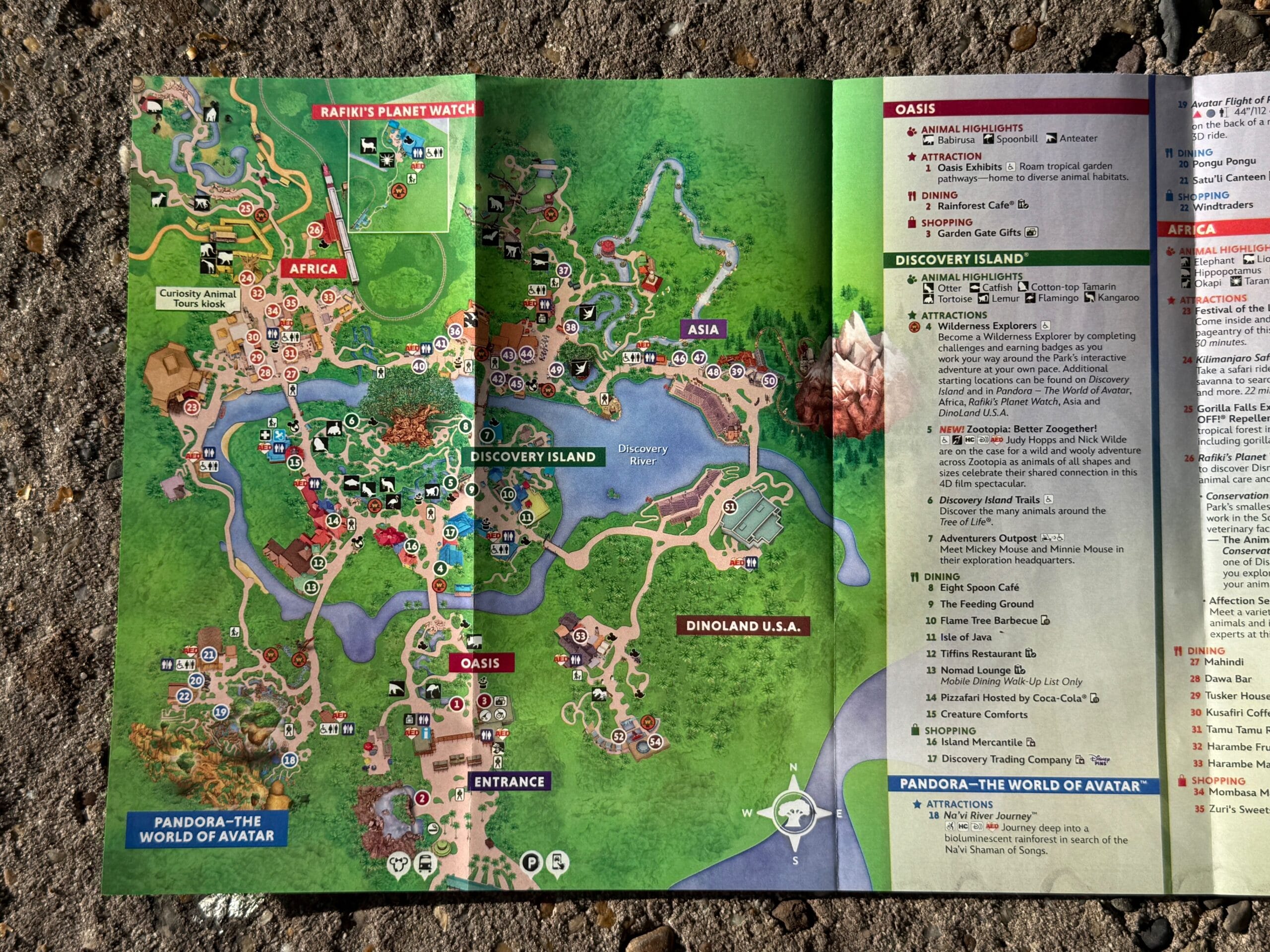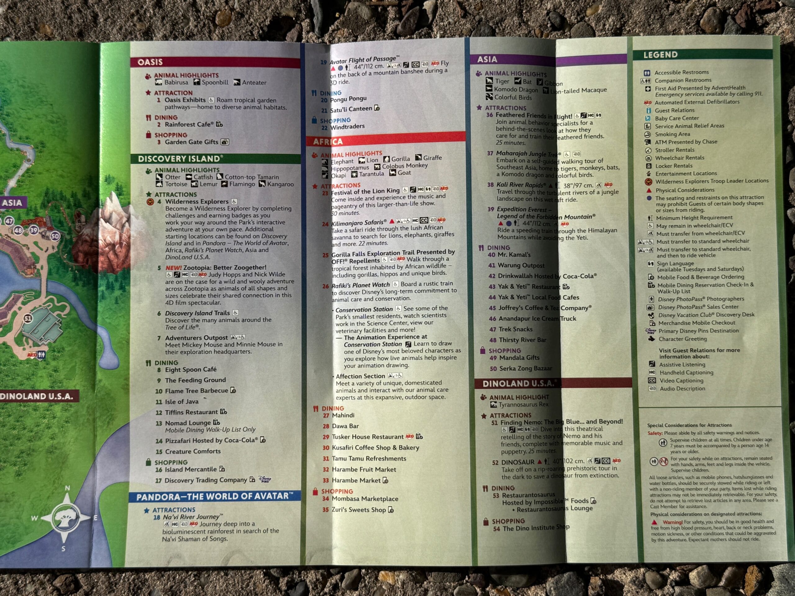 The fully unfolded guide displays a map and a list of locations. Everything is split up by land: Oasis, Discovery Island, Pandora – The World of Avatar, Africa, Asia, and DinoLand U.S.A. A legend is on the right.