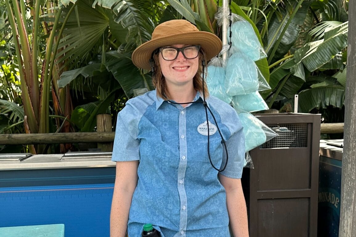 We noticed food and beverage cast members wearing these new costumes in Liberty Square, Frontierland, and Adventureland. These costumes include sand-colored pants and blue button-down shirts with a dark blue torso and light blue sleeves.