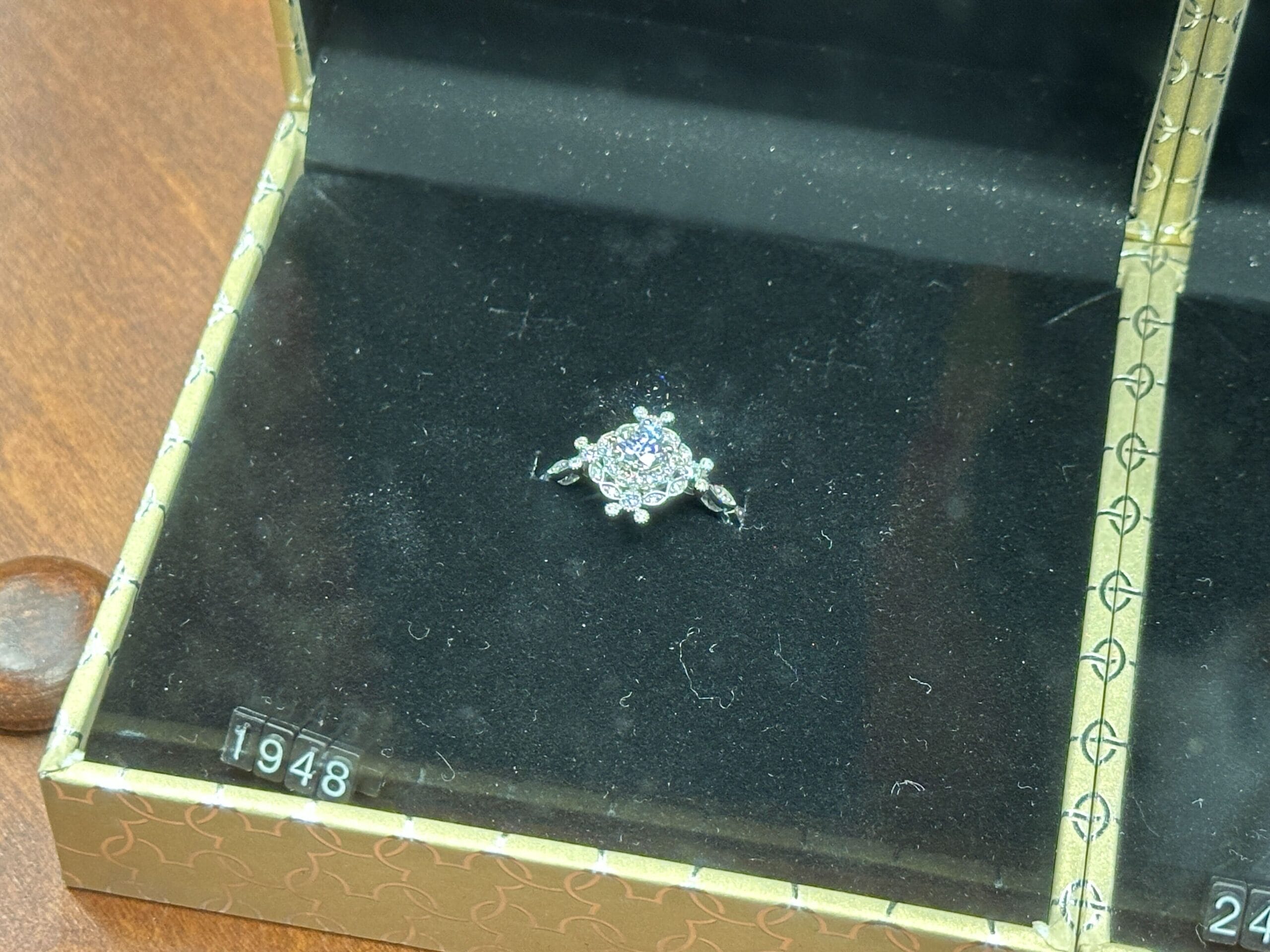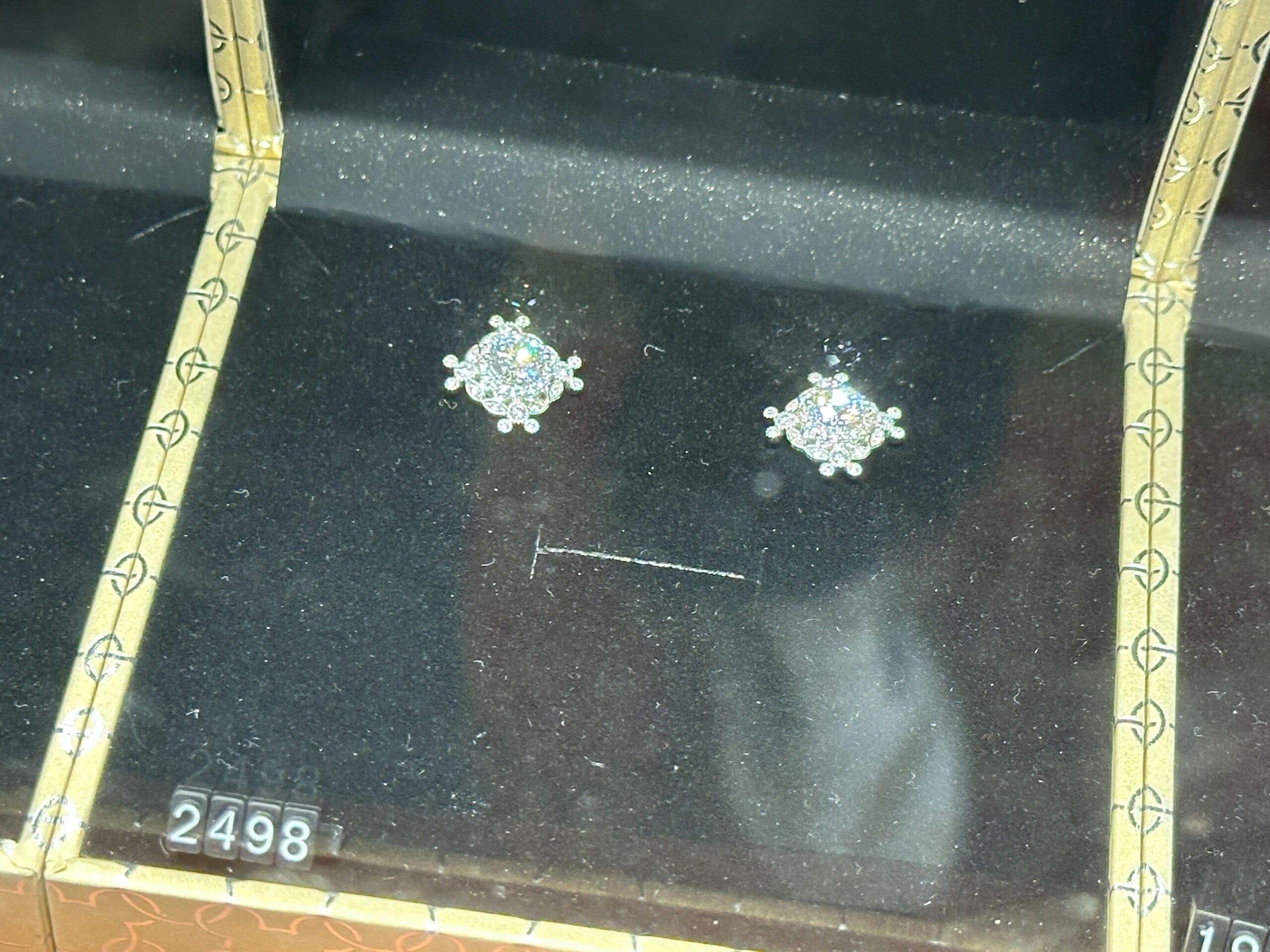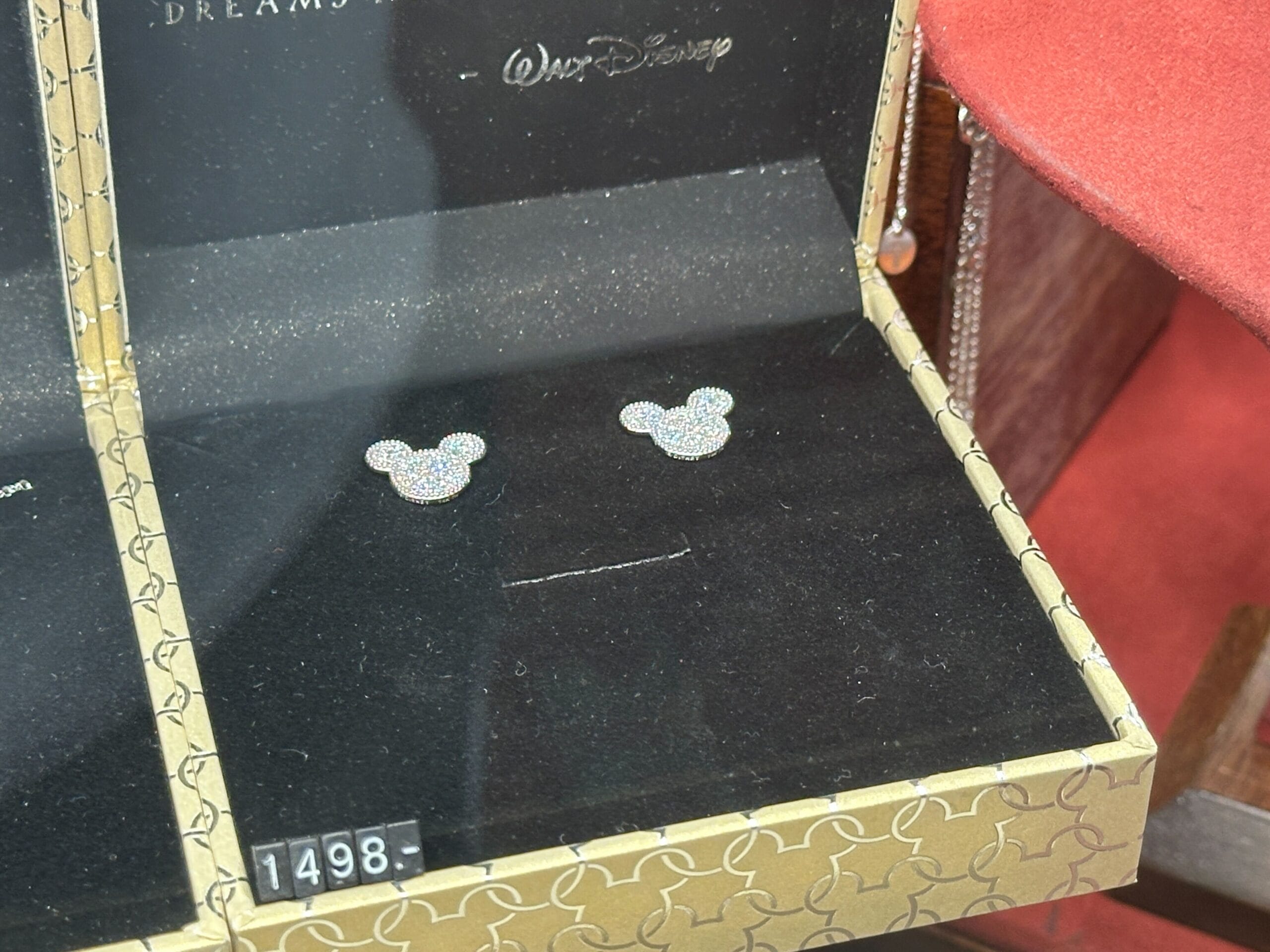 These earrings match the ring above with Mickey icons arranged around a central diamond. They have post backs.