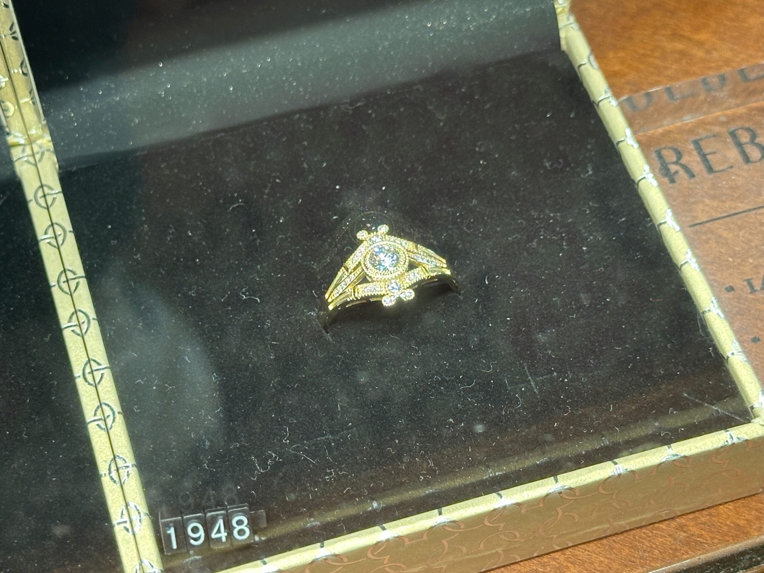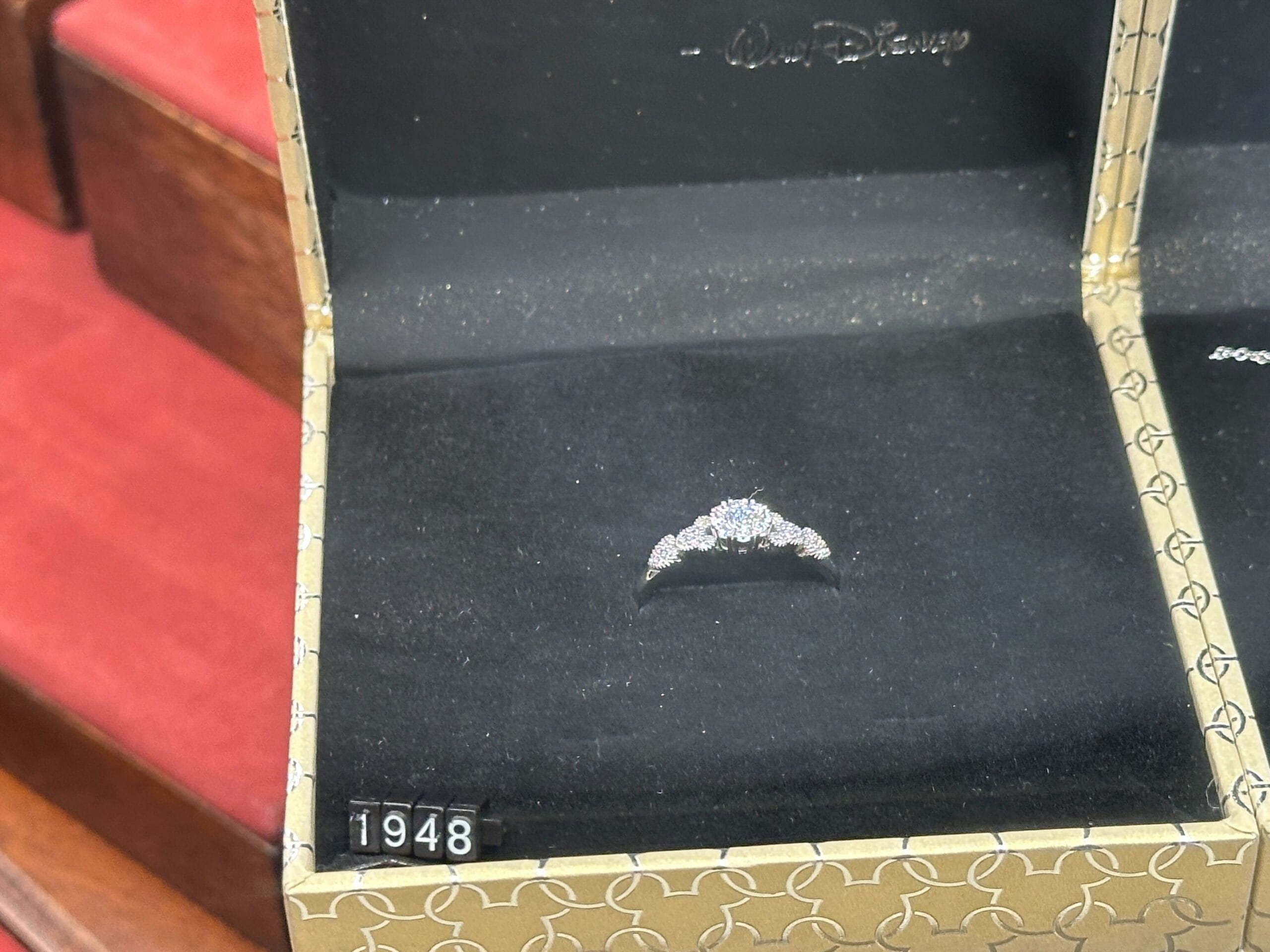 A final ring has Mickey icons descending down the band from the center diamond. It’s white gold with .285CT natural diamonds.