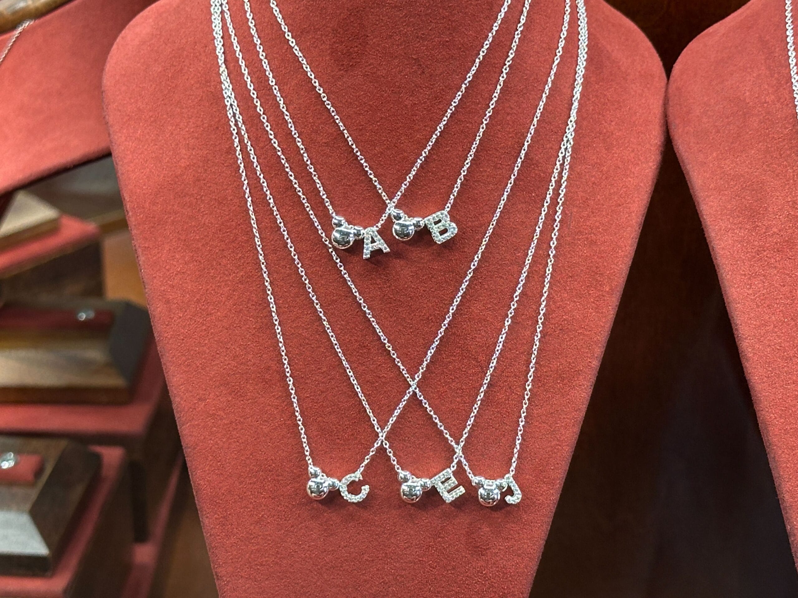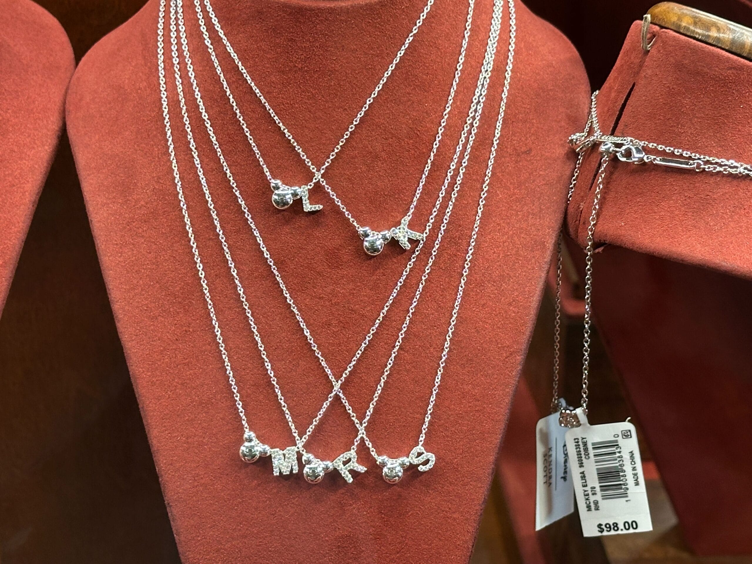 Each sterling silver necklace features two sliding pendants: a Mickey icon and a letter encrusted with cubic zirconia. They come on an adjustable 16″ cable chain.