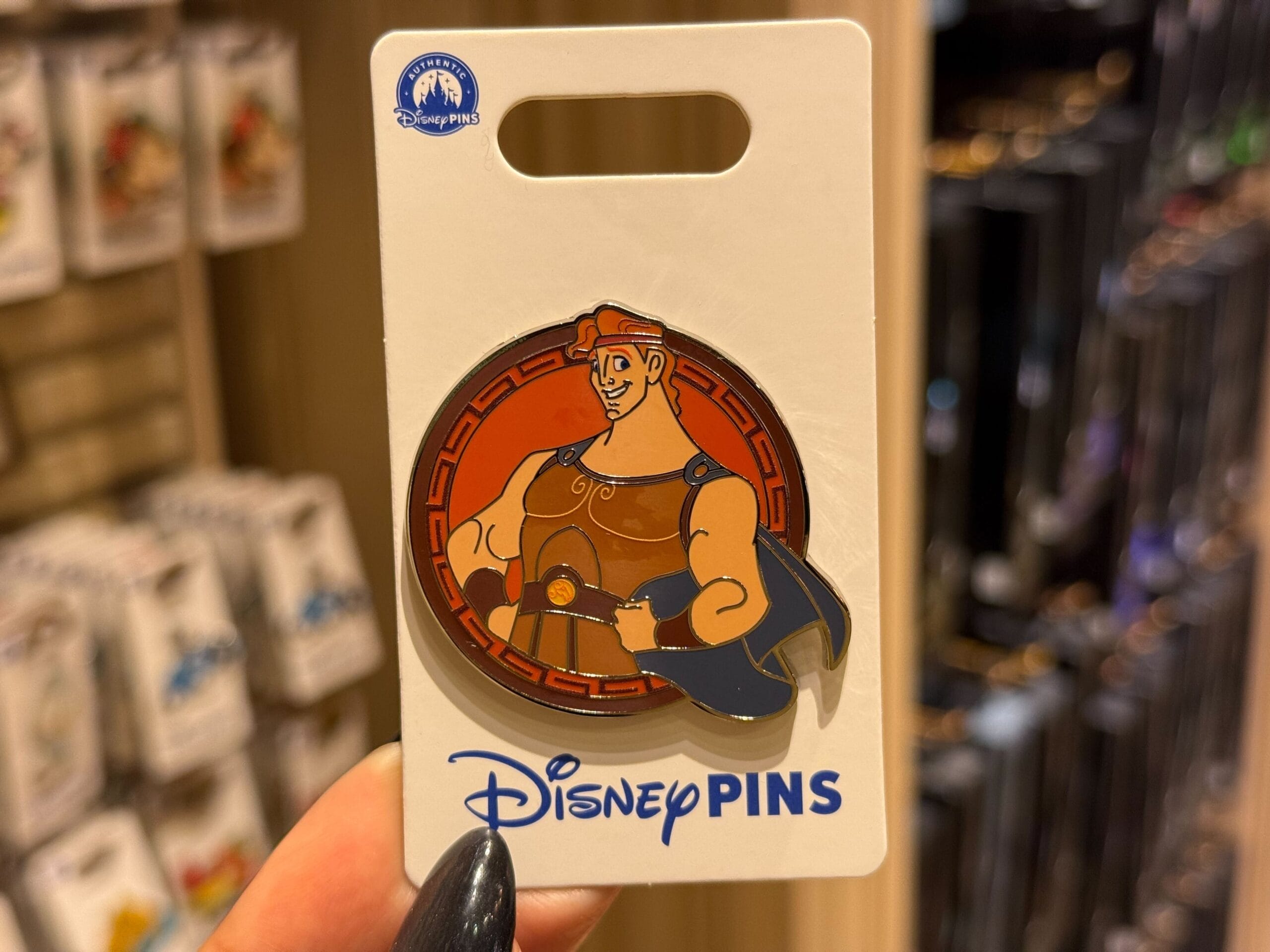 Hercules is the star of his own pin, striking a heroic arms akimbo pose against a circular brown background edged with a Greek key pattern.