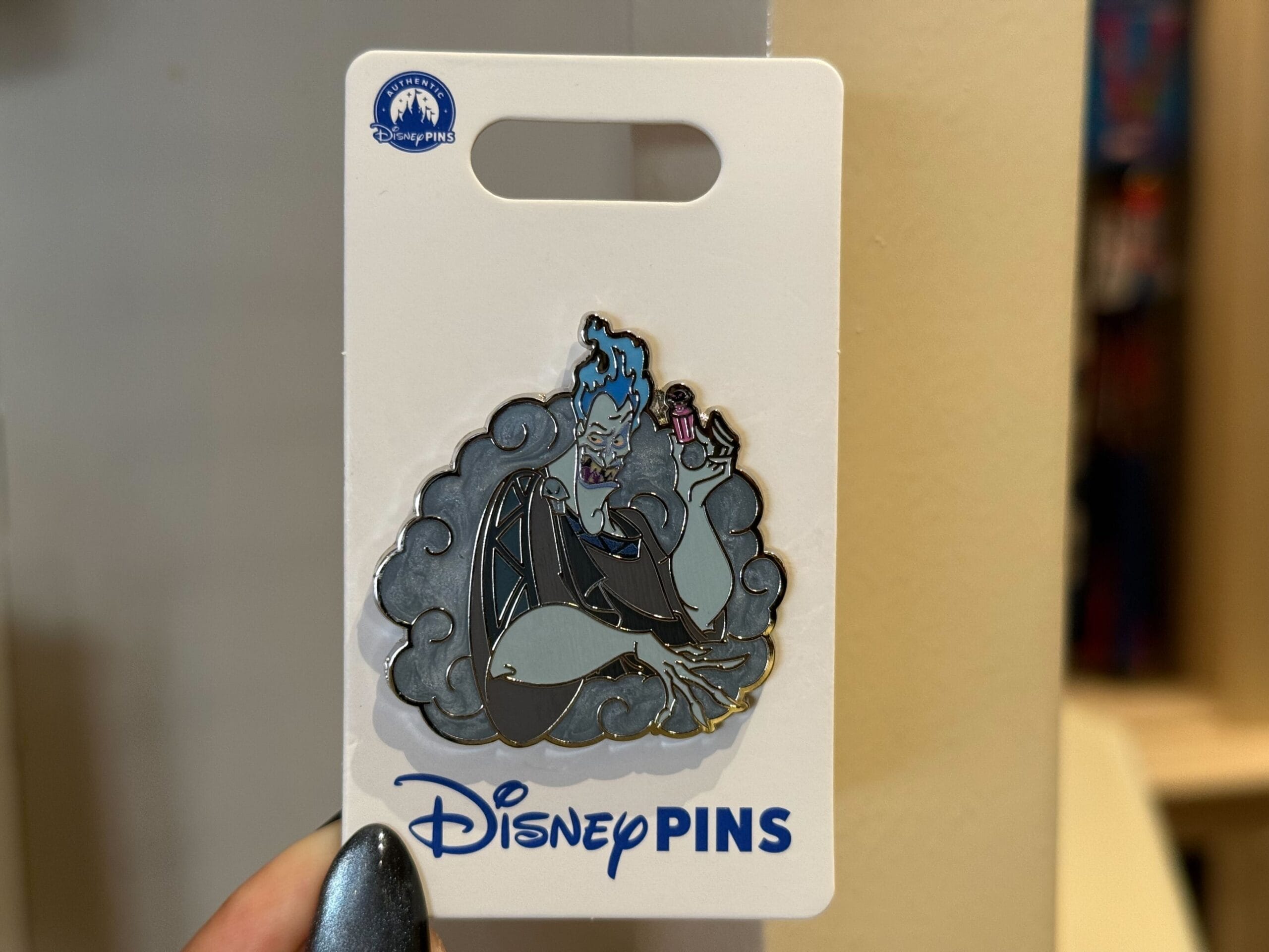 Hades tends to his fabulous flaming blue ‘do on this new villain pin. He’s surrounded by swirling smoke clouds with a shimmering gray finish.