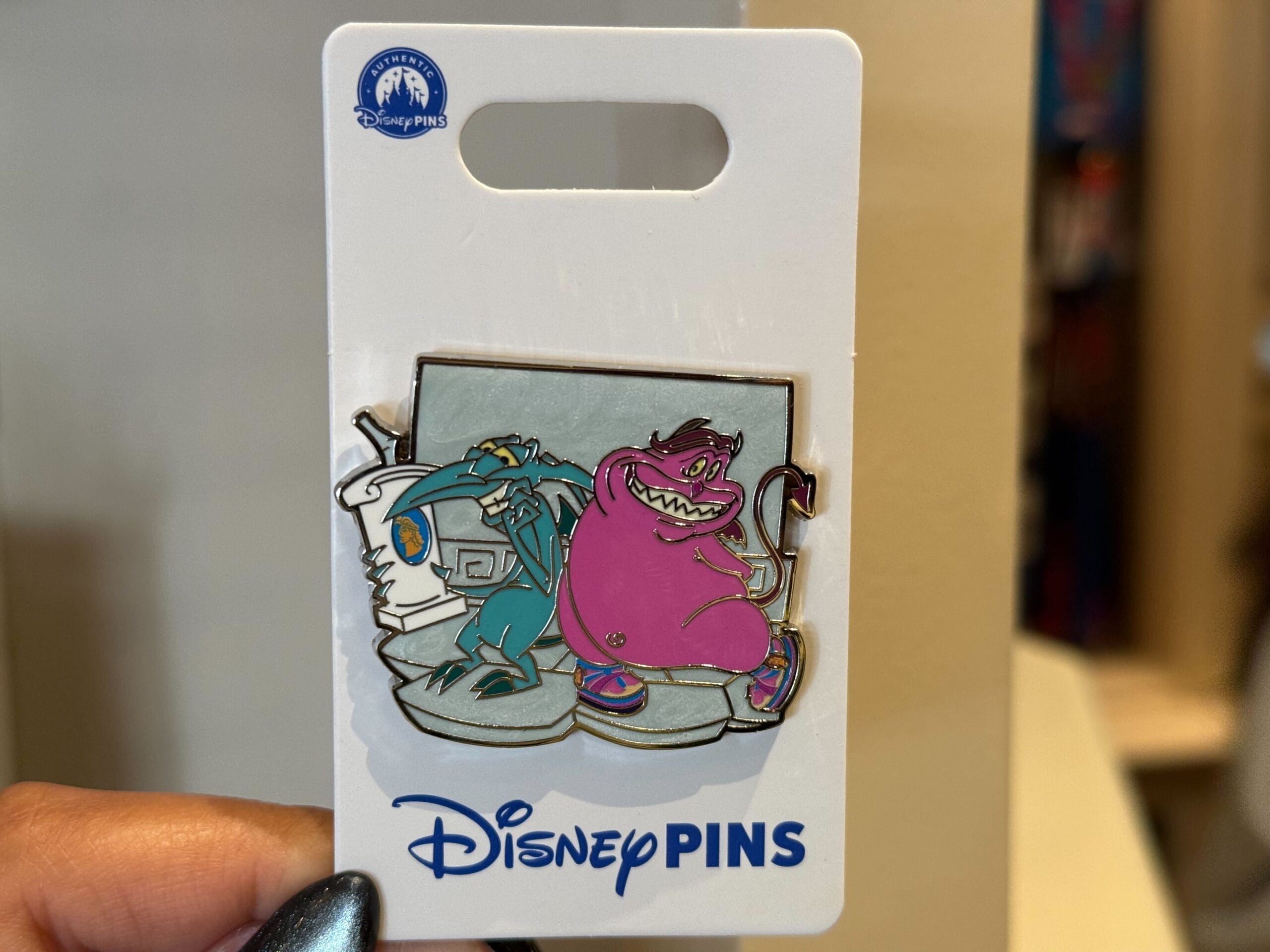 Hades’ bumbling minions Panic and Pain feature on this pin. Panic is holding a phone with Hercules’ image on it, while Pain is showing off his “kind of dashing” new sneakers. The background has a pearly finish.