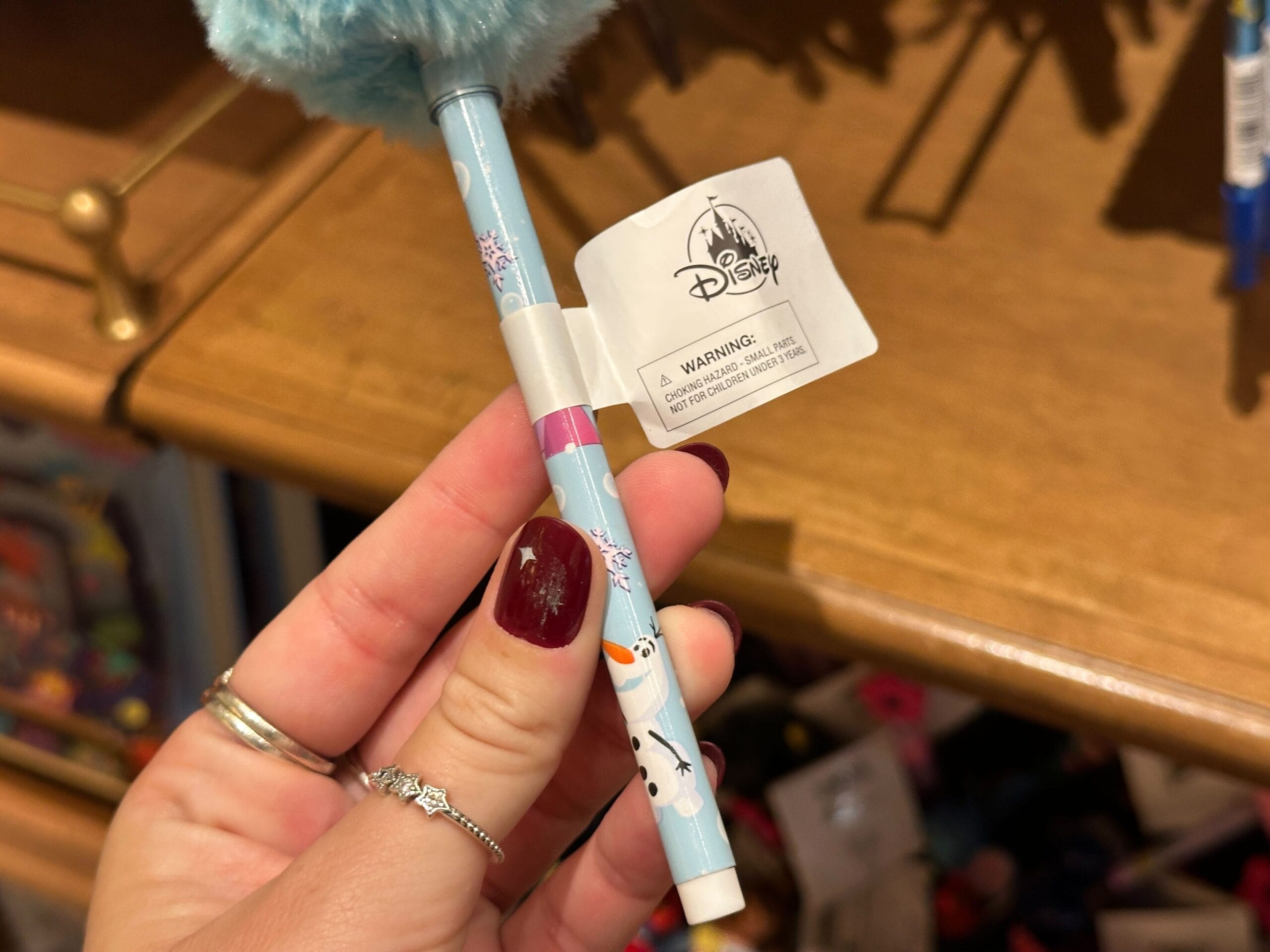 The Elsa pen features Elsa on top, and snowflakes and Olaf at the bottom.