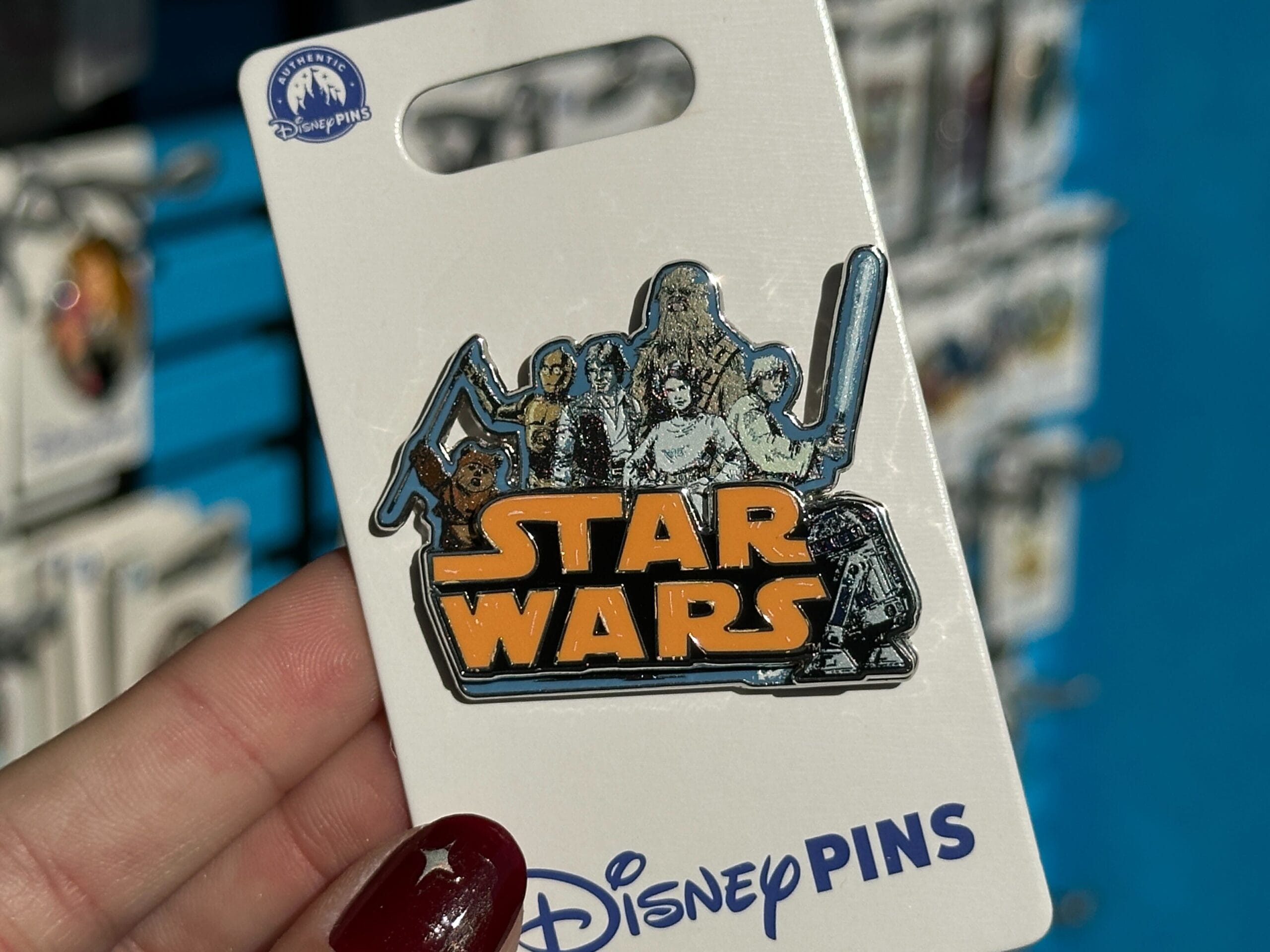 If you’re a fan of the Empire, then this pin may be suited to you. The Star Wars logo is front and center, with Darth Vader directly behind it, with his red lightsaber. Boba Fett is featured as well, along with two Stormtroopers.