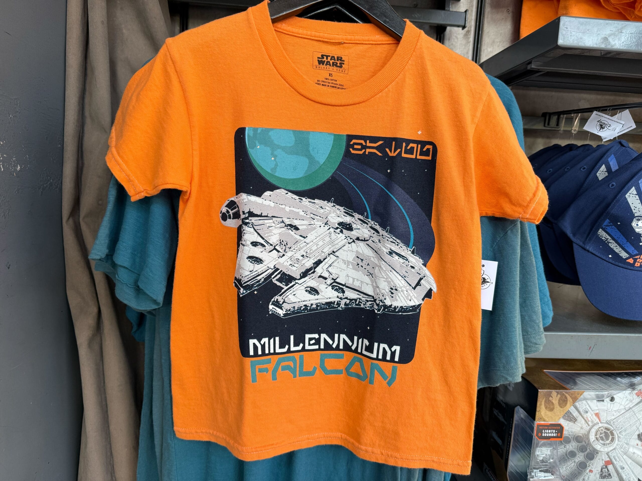 Similar artwork of the Millennium Falcon is set against a starry background on this orange t-shirt. The Aurebesh in the top right corner means “Batuu.”