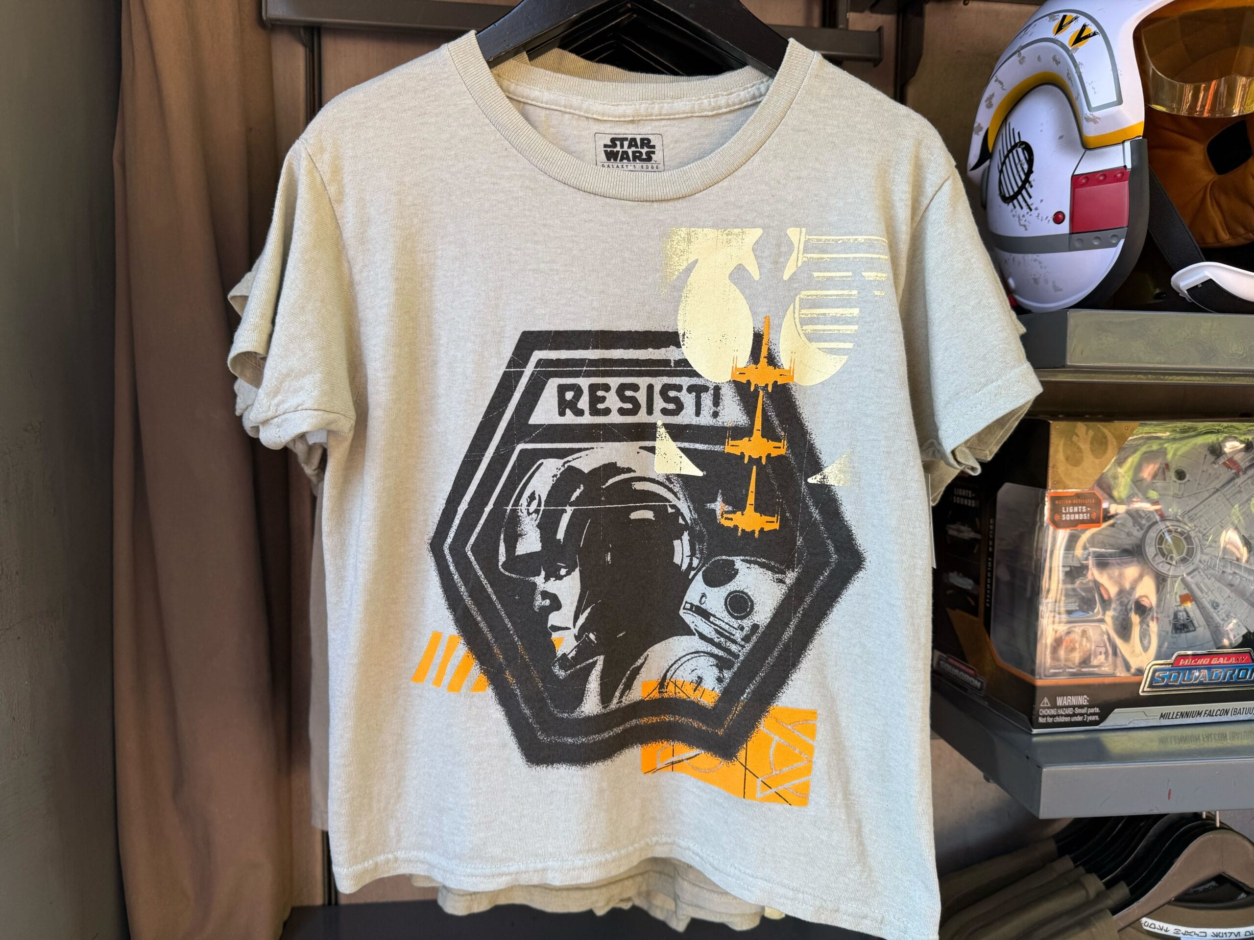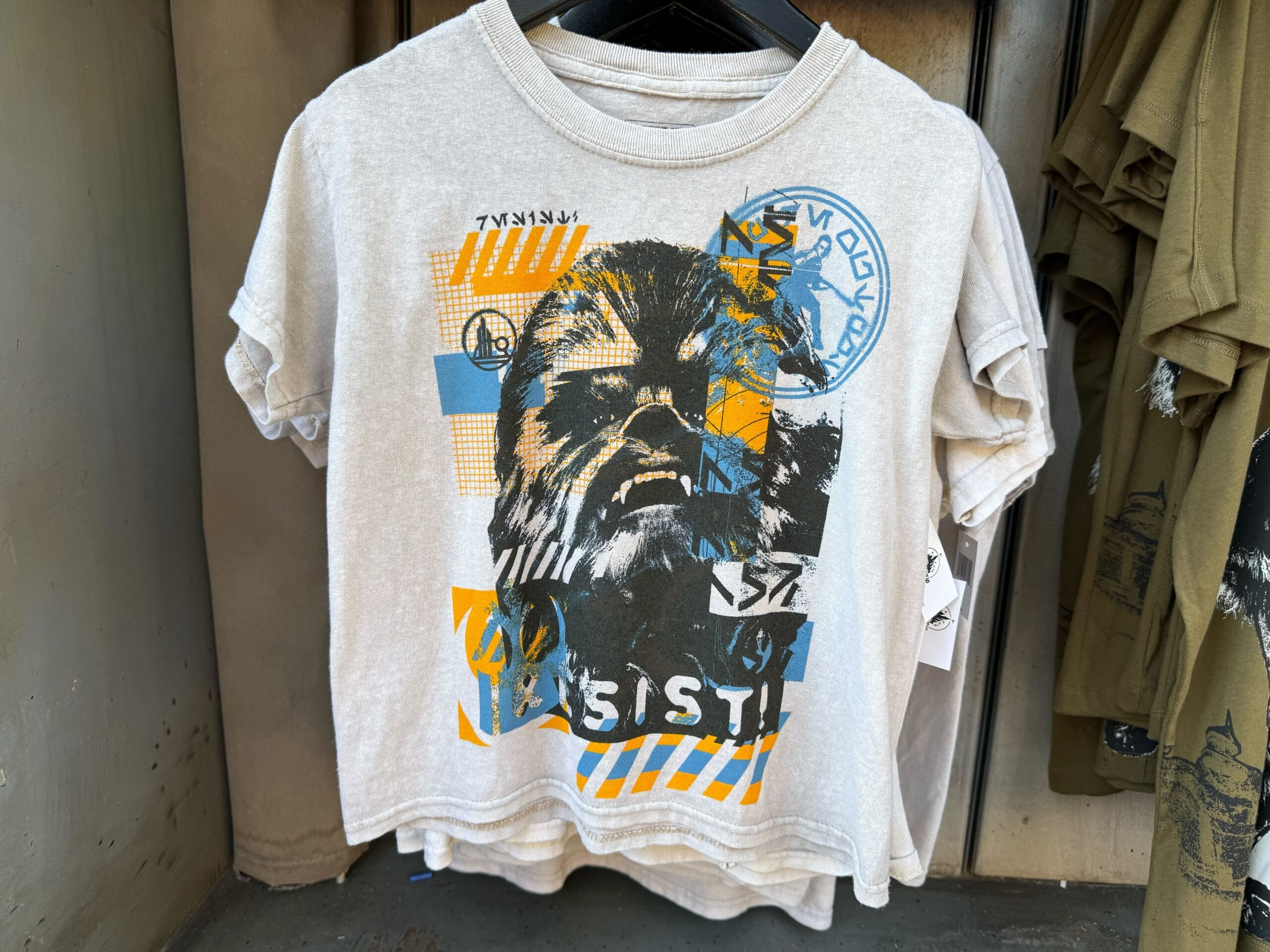Chewbacca is the main figure on this shirt, but Rey is also featured in a stamp symbol. It’s a cluster of blue and yellow designs Millennium Falcon the black Chewie artwork. “Resist” is at the bottom with the Resistance logo. A Batuu symbol is also in black. An Aurebesh word translates to “Resist.”