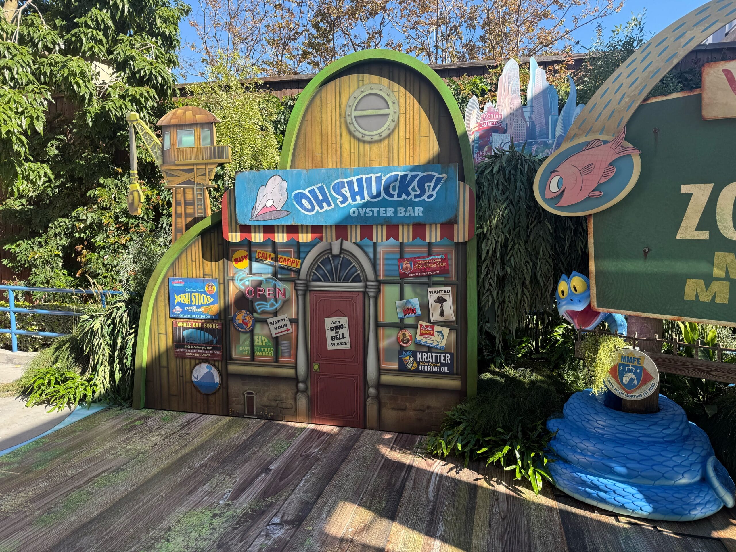 The ground is printed to look like a wooden pier. On the “pier” are the Oh Shucks! Oyster Bar, the Marsh Market sign, and a cart selling “Chili Logs.” Gary De’Snake is wrapped around the signpost trying to hide.