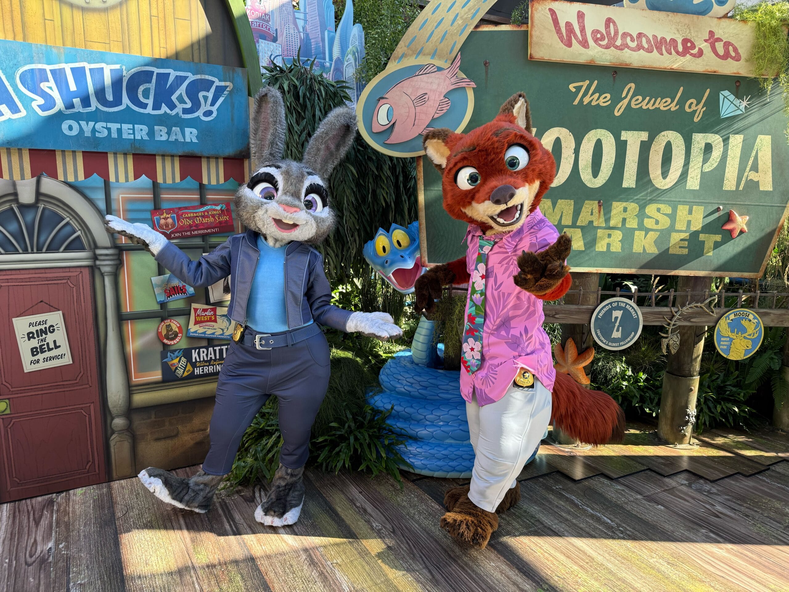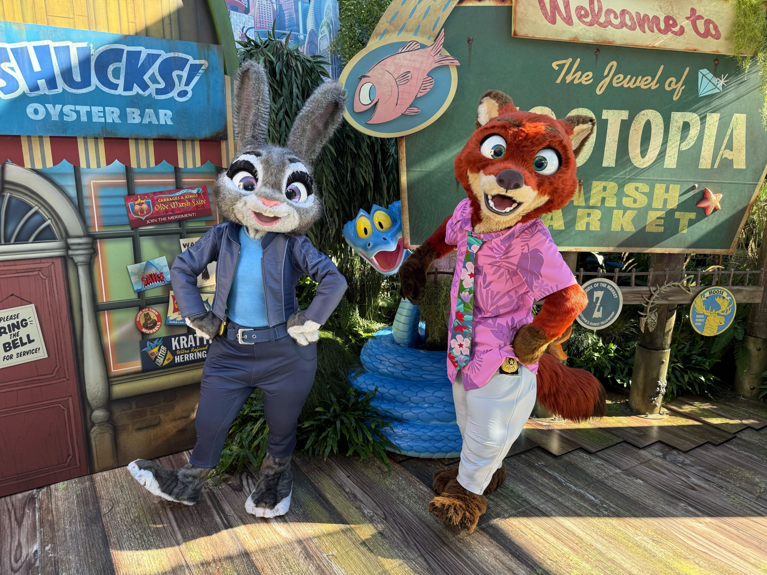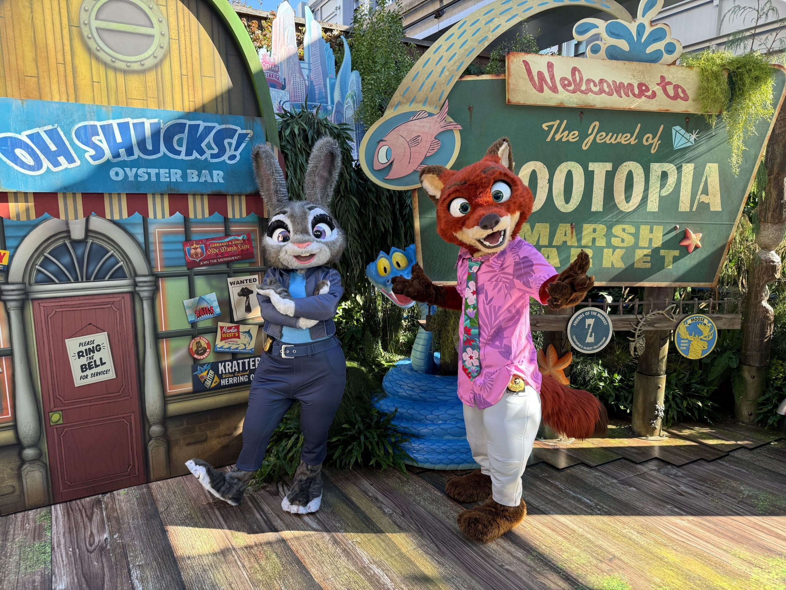 The meet and greet backdrop features elements from Zootopia 2‘s new Marsh Market location.