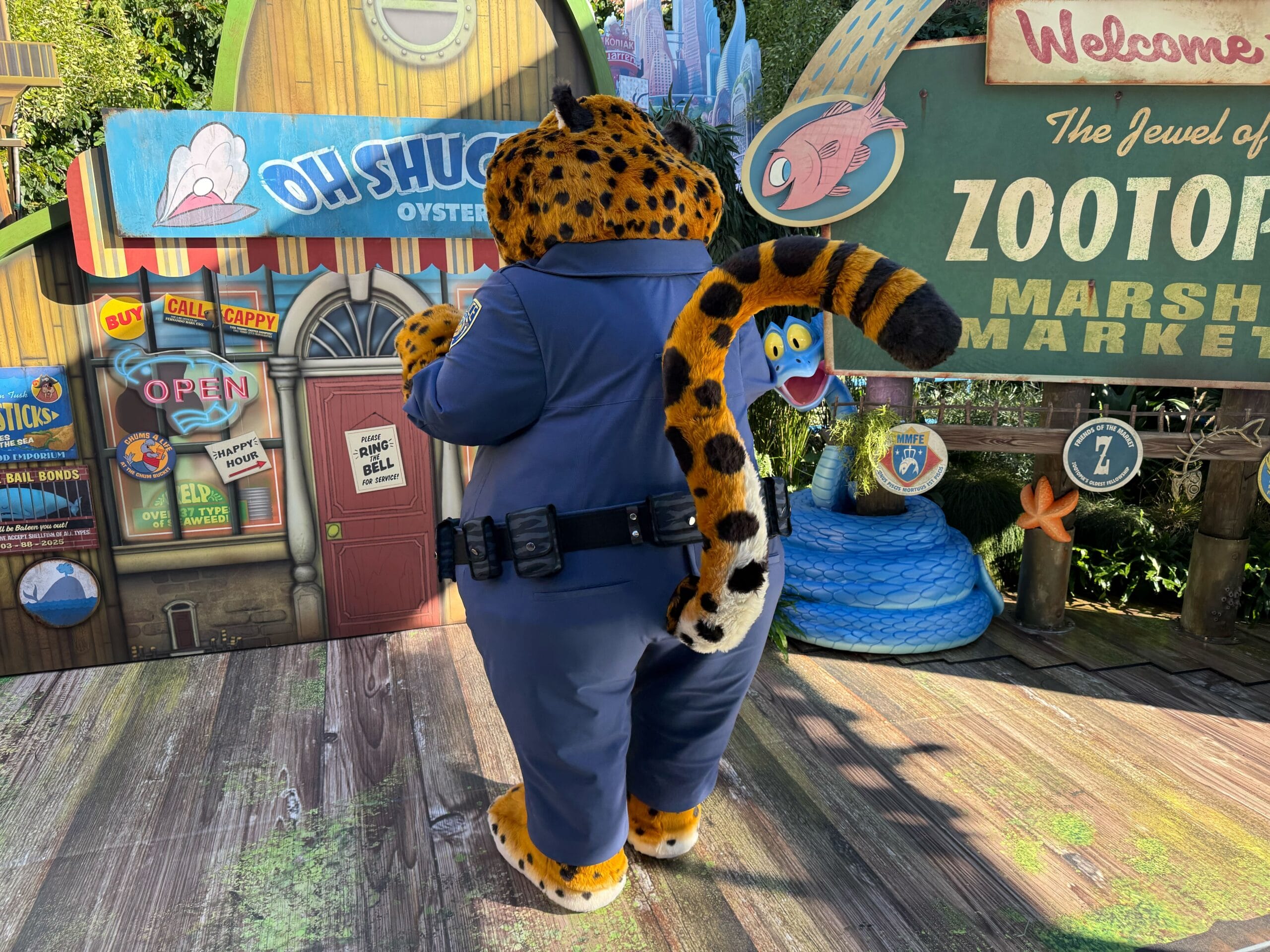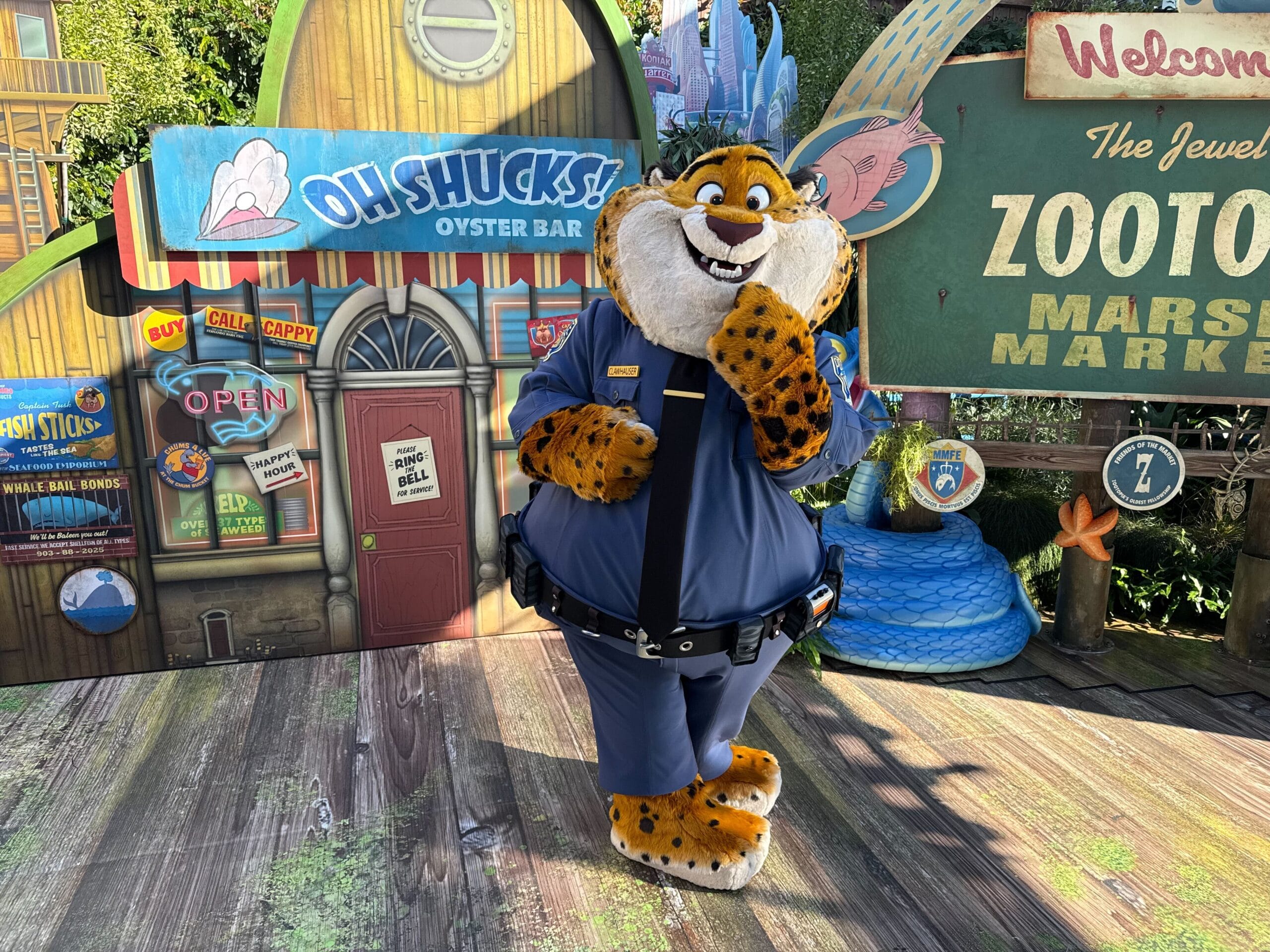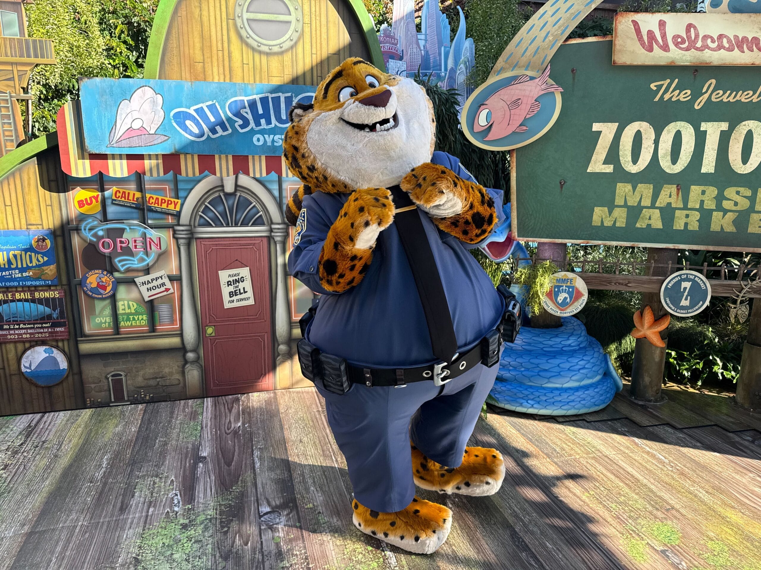 Officer Clawhauser can be seen in animatronic form in two other Disney parks: Shanghai Disneyland’s Zootopia: Hot Pursuit attraction and Disney’s Animal Kingdom’s new 3D show Zootopia: Better Zoogether!