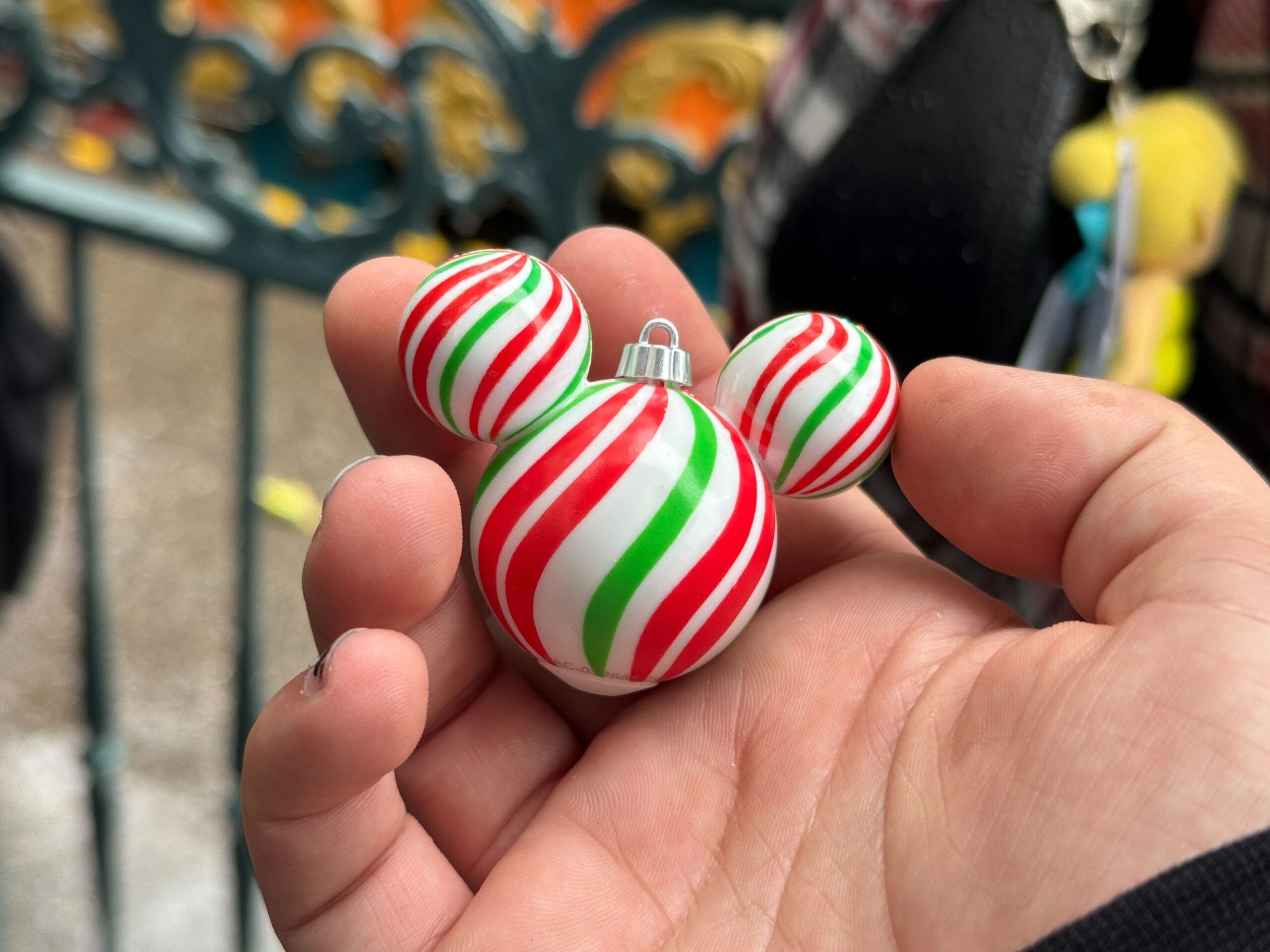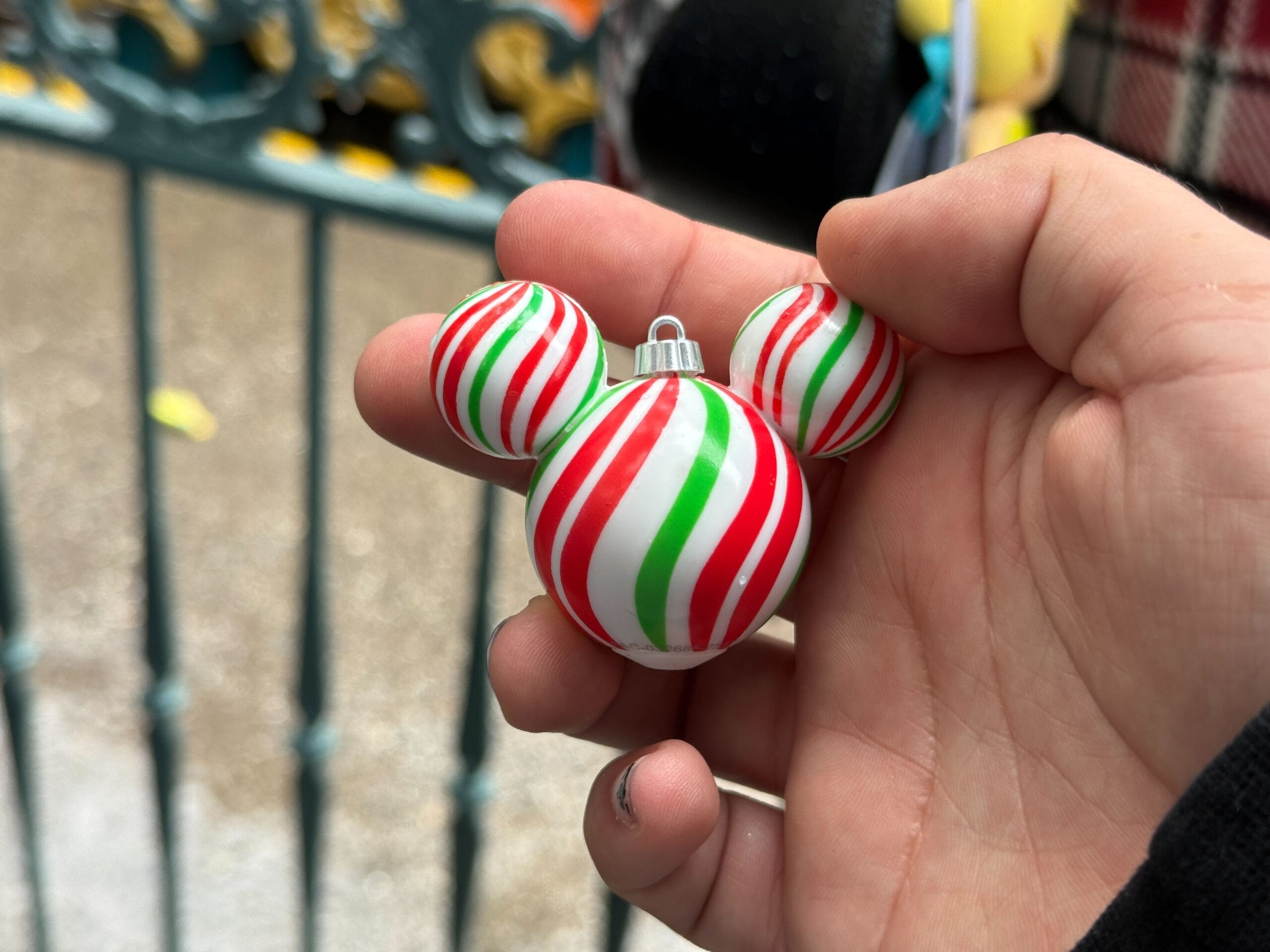 The Mickey “cube” is white with curved red and green stripes. A silver loop is on top, so it could be used as an actual ornament.