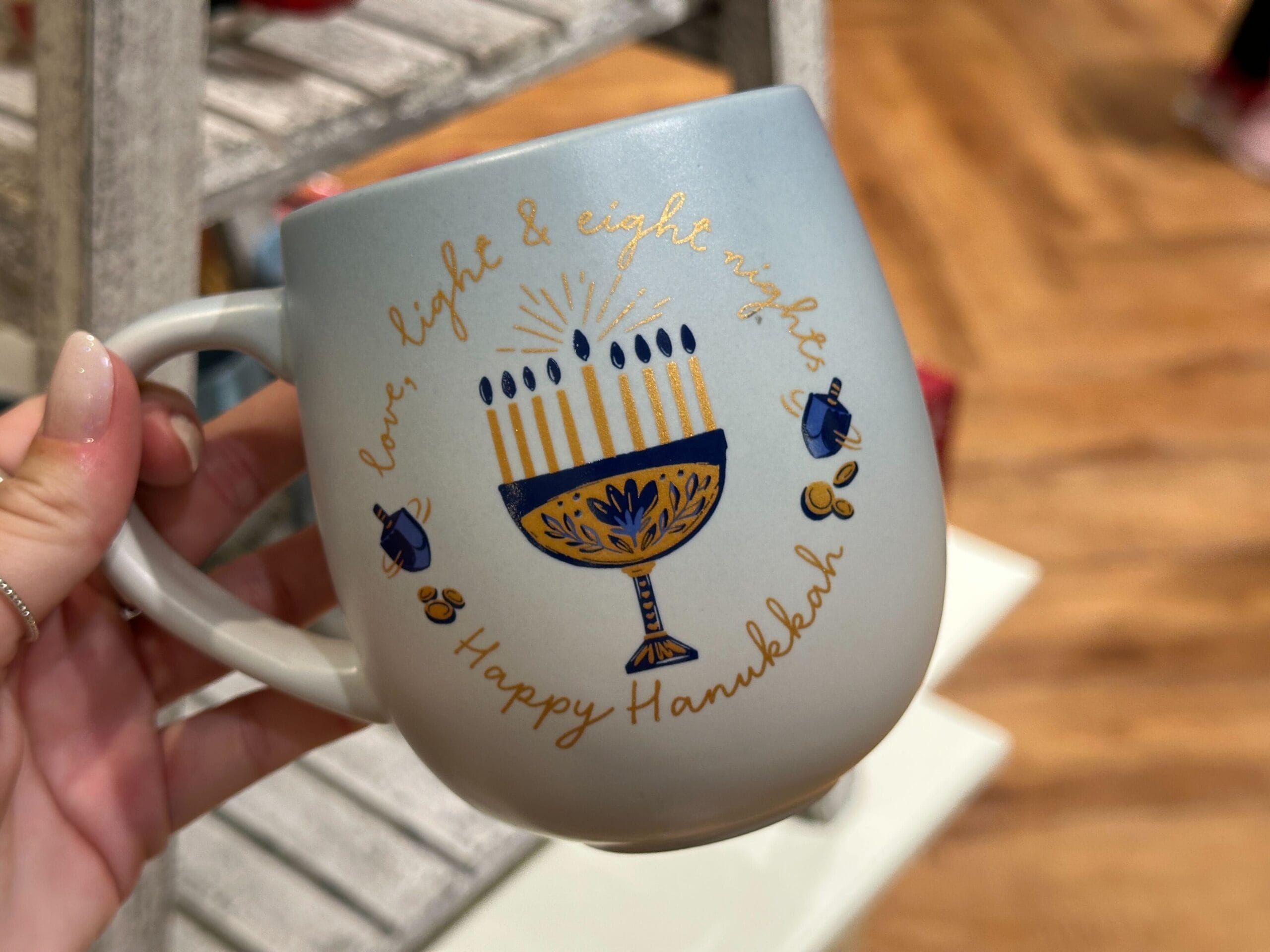 This stoneware mug has a light blue-white ombré finish. On one side is a shiny dark blue and gold menorah. “Love, light & eight nights” and “Happy Hanukkah” are in gold script around the menorah. Dreidels and gold coins are also pictured.