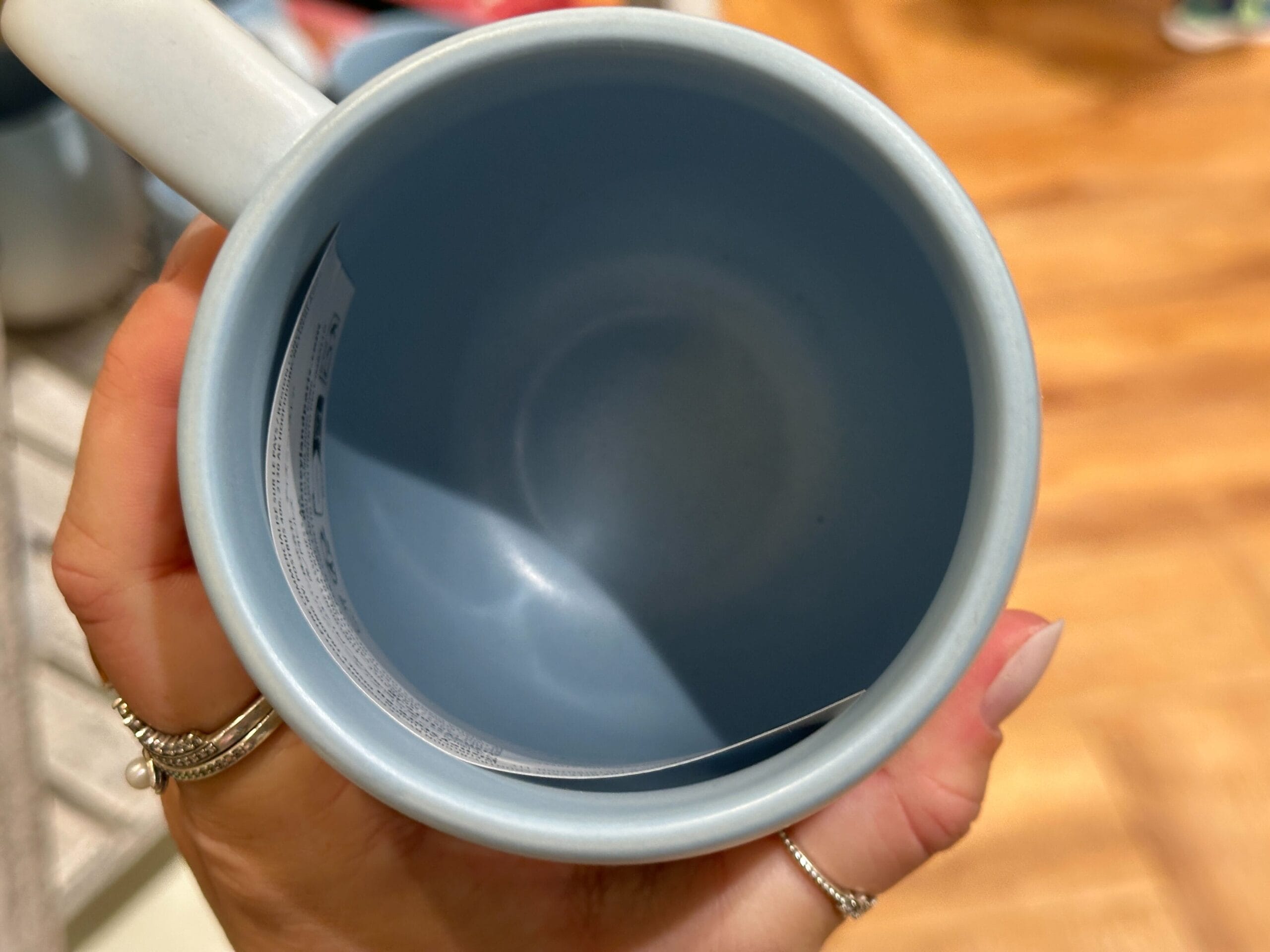 The interior is light blue. It’s dishwasher-safe and microwaveable.