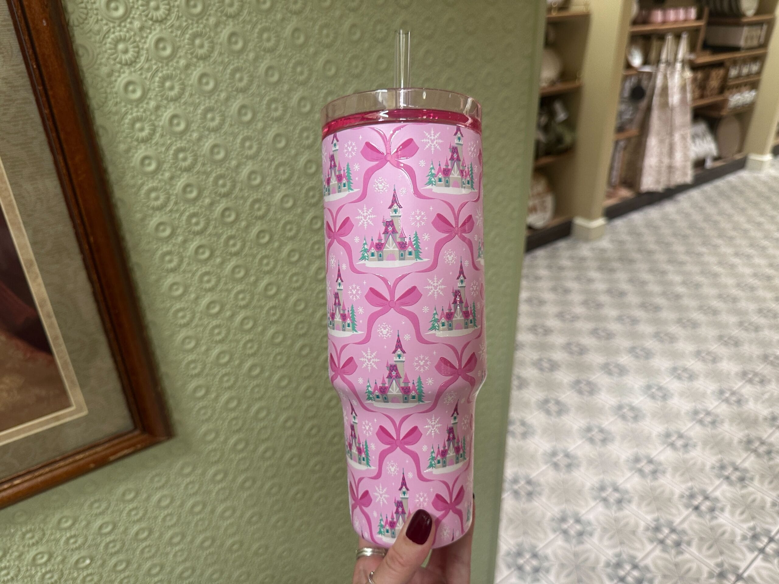 We found the pink tumbler and matching mug in Creations Shop at EPCOT. The tumbler was also in the Emporium. The Hanukkah mug was at Beach Club Marketplace, and it is also available online.