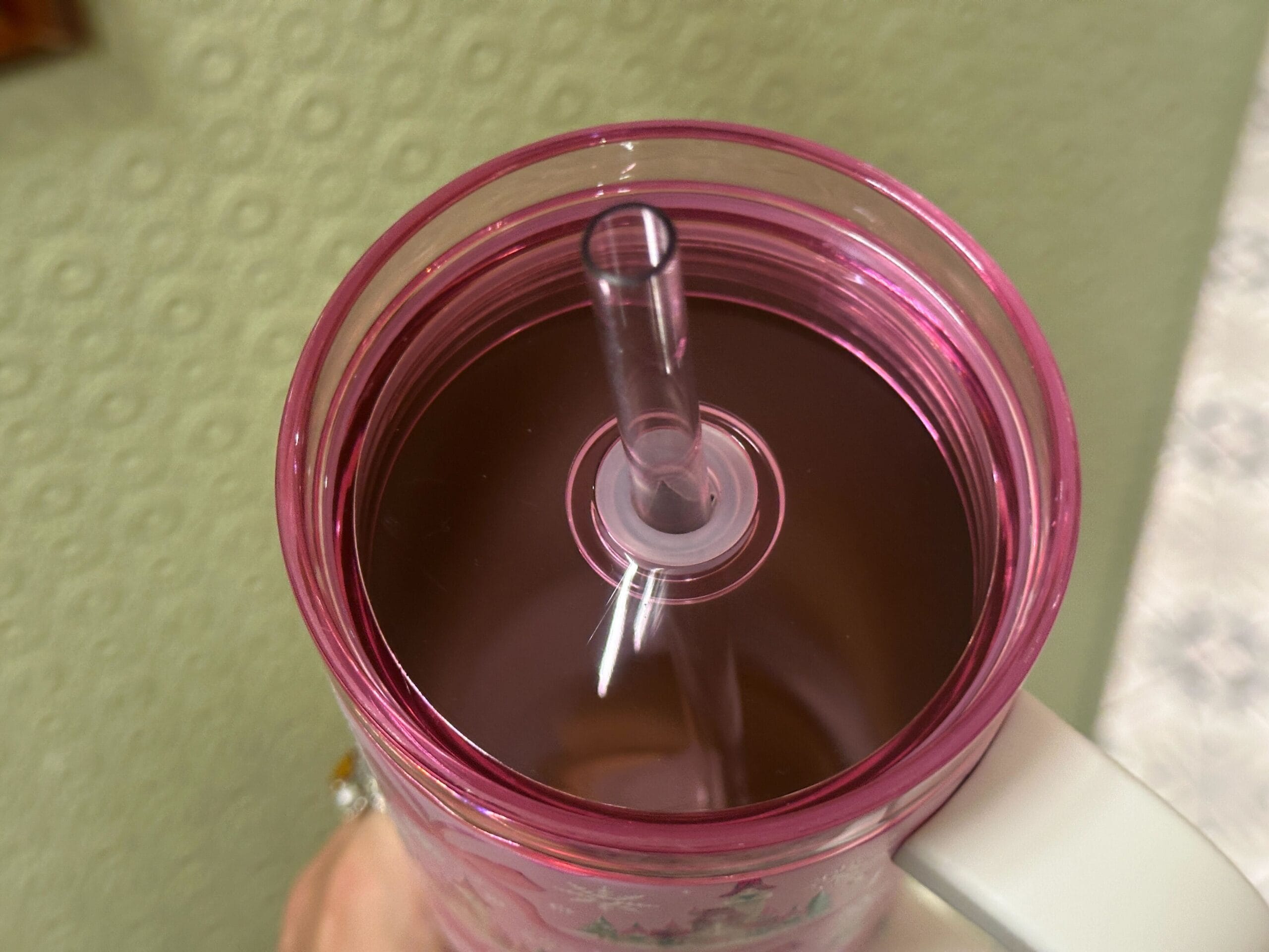 It has a pink translucent lid and straw. It’s not dishwasher-safe or microwaveable. It holds approximately 887 mL or 30 oz.