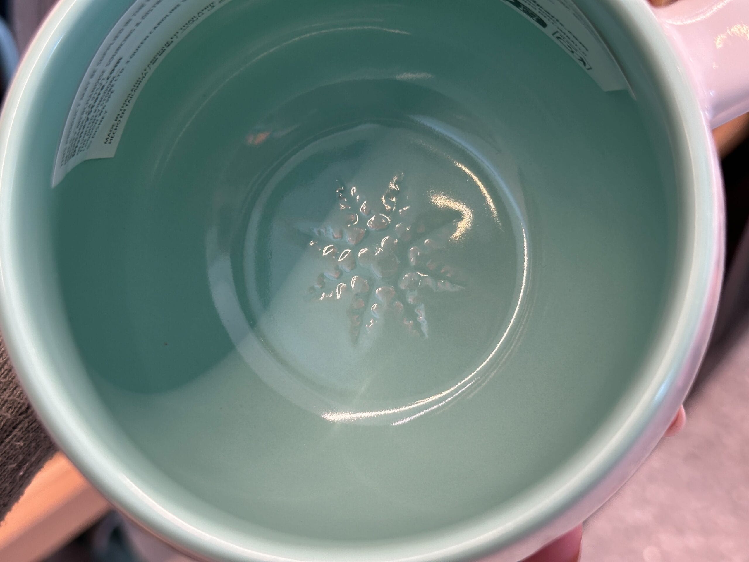 The interior is a mint green color with a snowflake embedded at the bottom. It is dishwasher-safe and microwaveable.